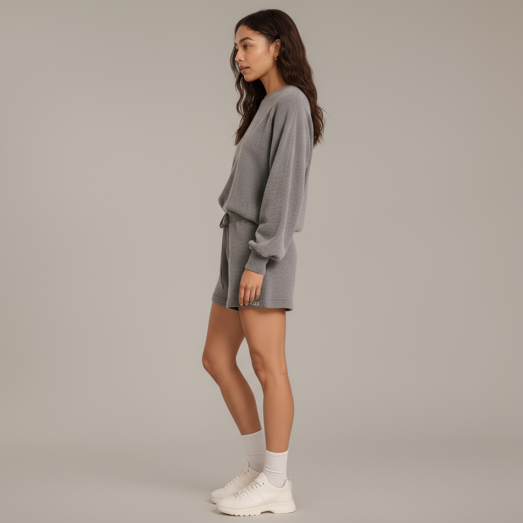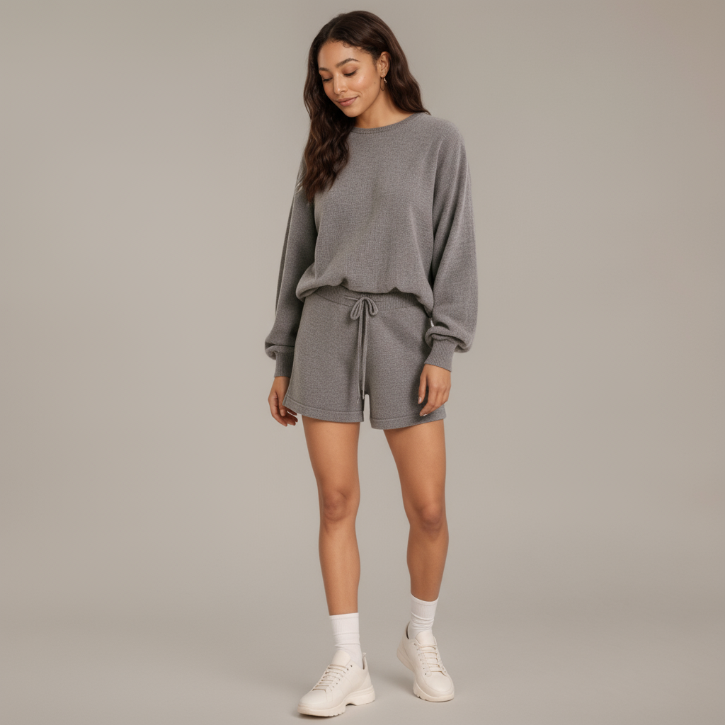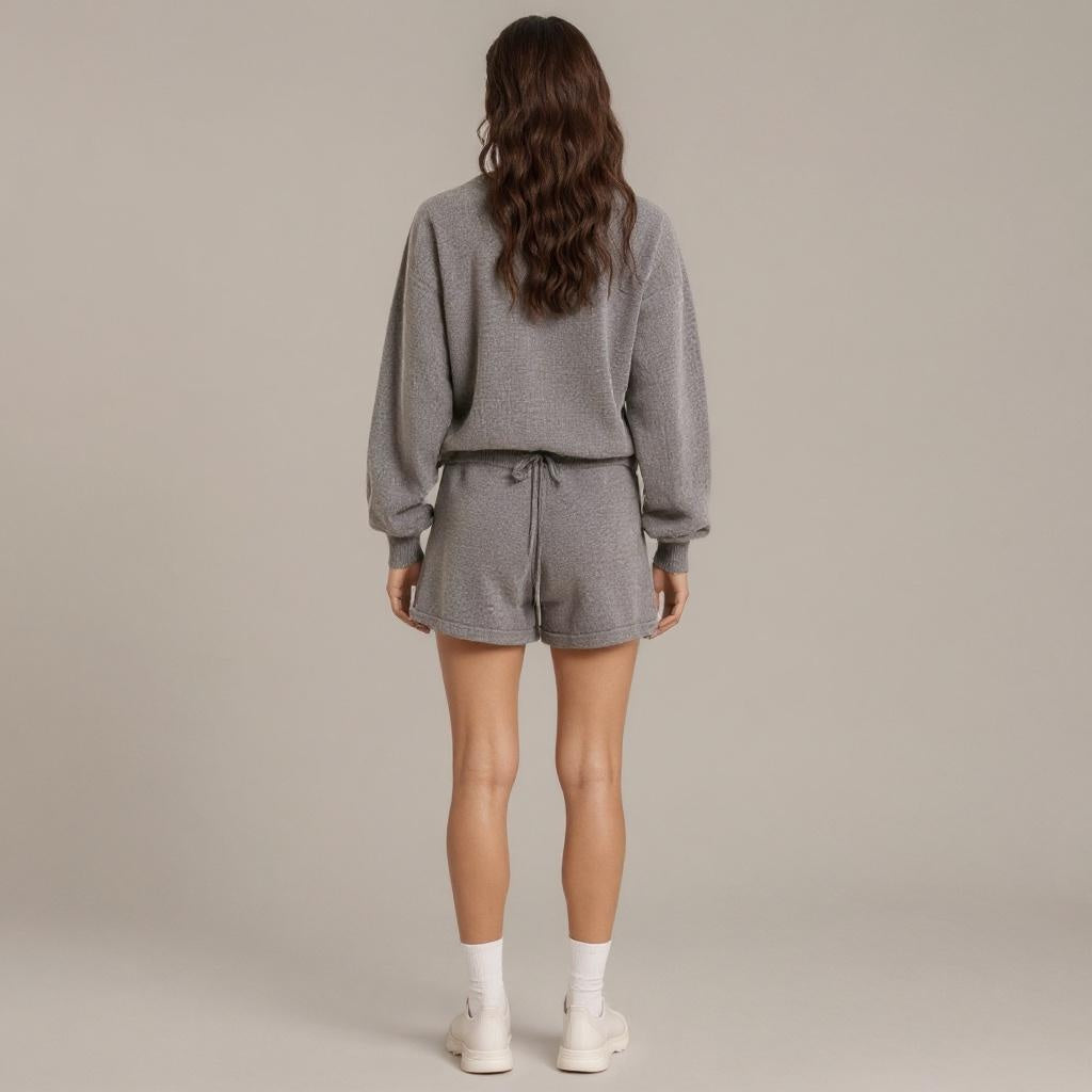This lounge set offers an effortlessly chic look with cozy knit construction. The pullover features soft balloon sleeves and a relaxed fit, while the matching drawstring shorts provide easy adjustability and comfort. Designed in a lightweight knit, it balances laid-back ease with elevated style. Perfect for both at-home lounging and casual daytime wear.