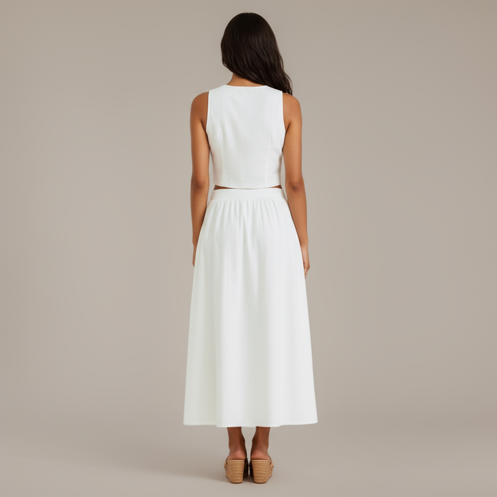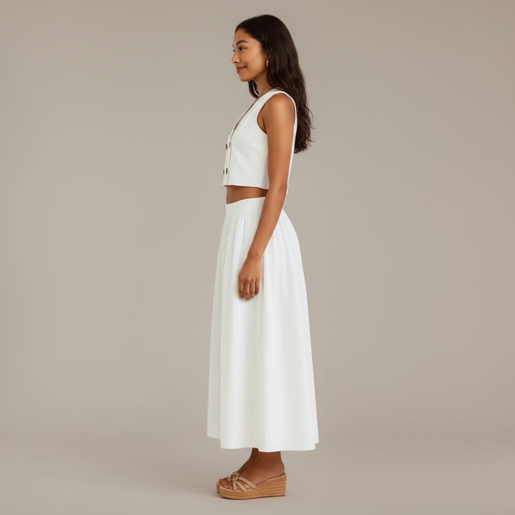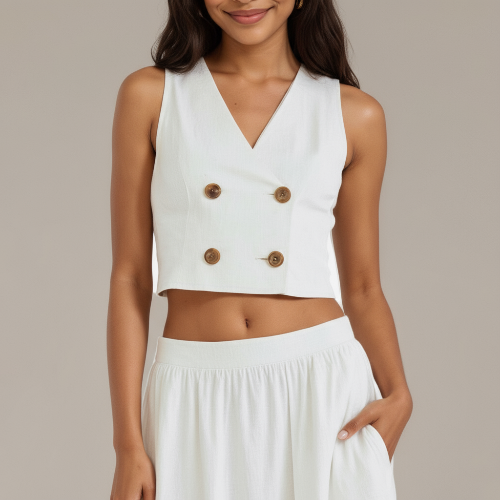 This two-piece set offers a refined yet relaxed silhouette with a tailored cropped vest top featuring a double-breasted button design and a deep V-neckline. The matching maxi skirt is crafted with an elastic waistband for all-day comfort and subtle side pockets for functionality. Perfect for pairing with sandals or wedges for a fresh, effortless look.