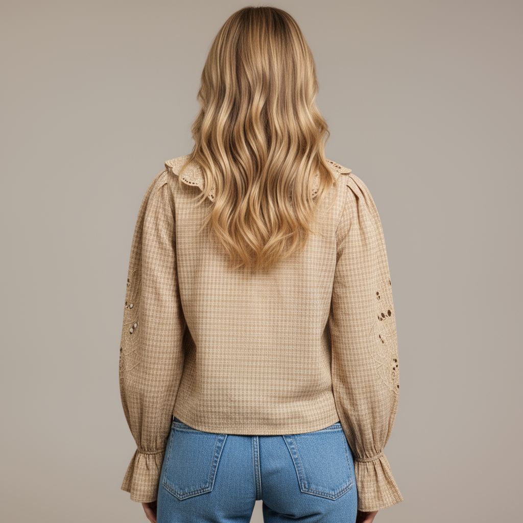 This embroidered blouse brings a touch of vintage charm to your wardrobe. Crafted from lightweight woven fabric with a subtle check pattern, it features a ruffle collar, scalloped hem, and delicate cutout embroidery for a feminine finish. Long puff sleeves with shirred cuffs add a romantic silhouette, while the button-front closure makes it effortlessly wearable for both casual and refined looks.