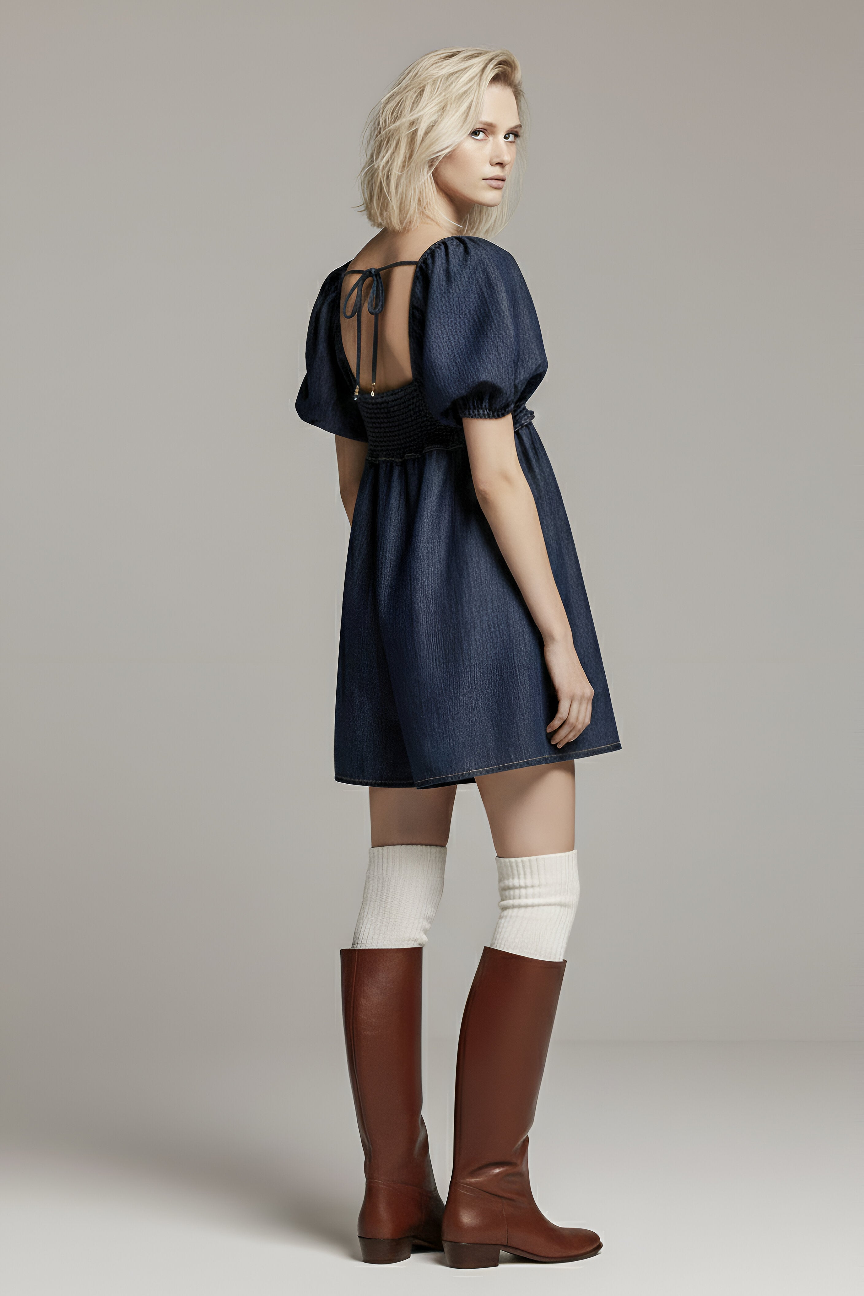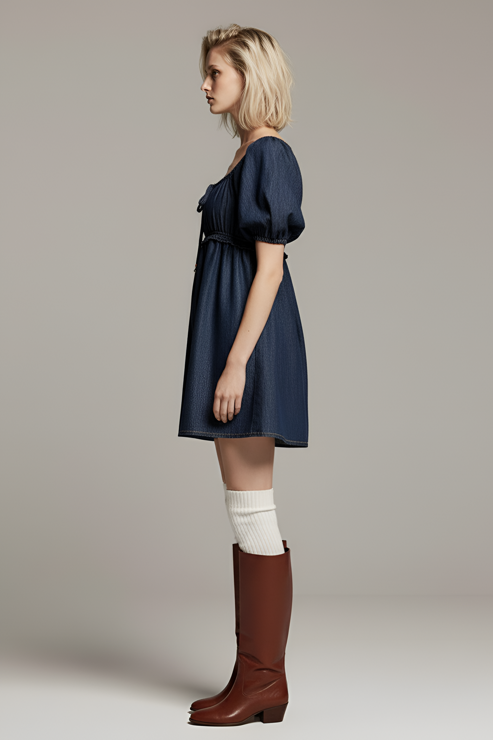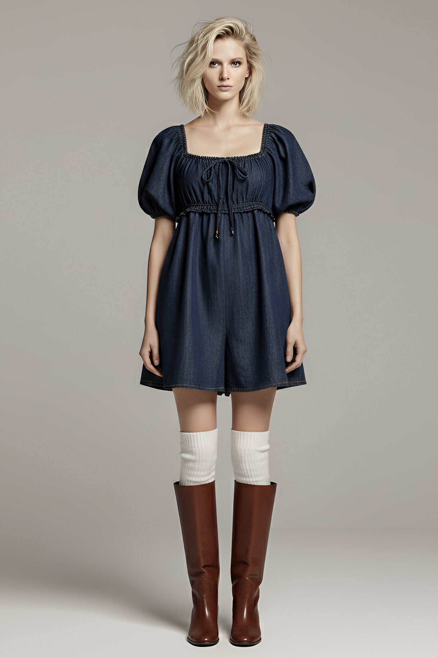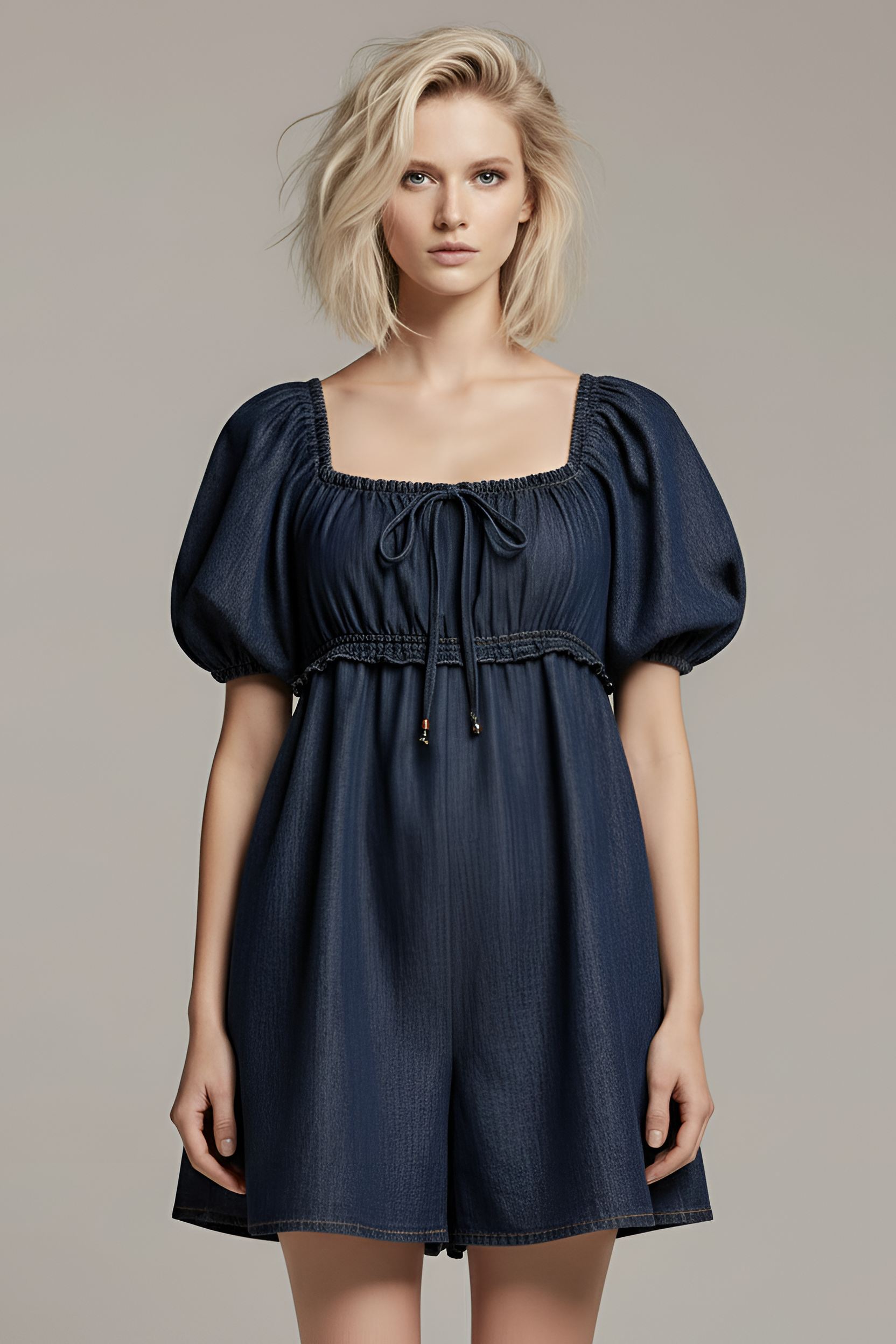 This light blue romper is effortlessly playful with its puff sleeves, empire waistline, and tie-front neckline that adds a delicate touch. The relaxed silhouette and soft, lightweight fabric make it perfect for sunny days, while the flowy shorts and functional side pockets add comfort and practicality. A dreamy one-piece for warm-weather styling that pairs perfectly with sandals or sneakers.