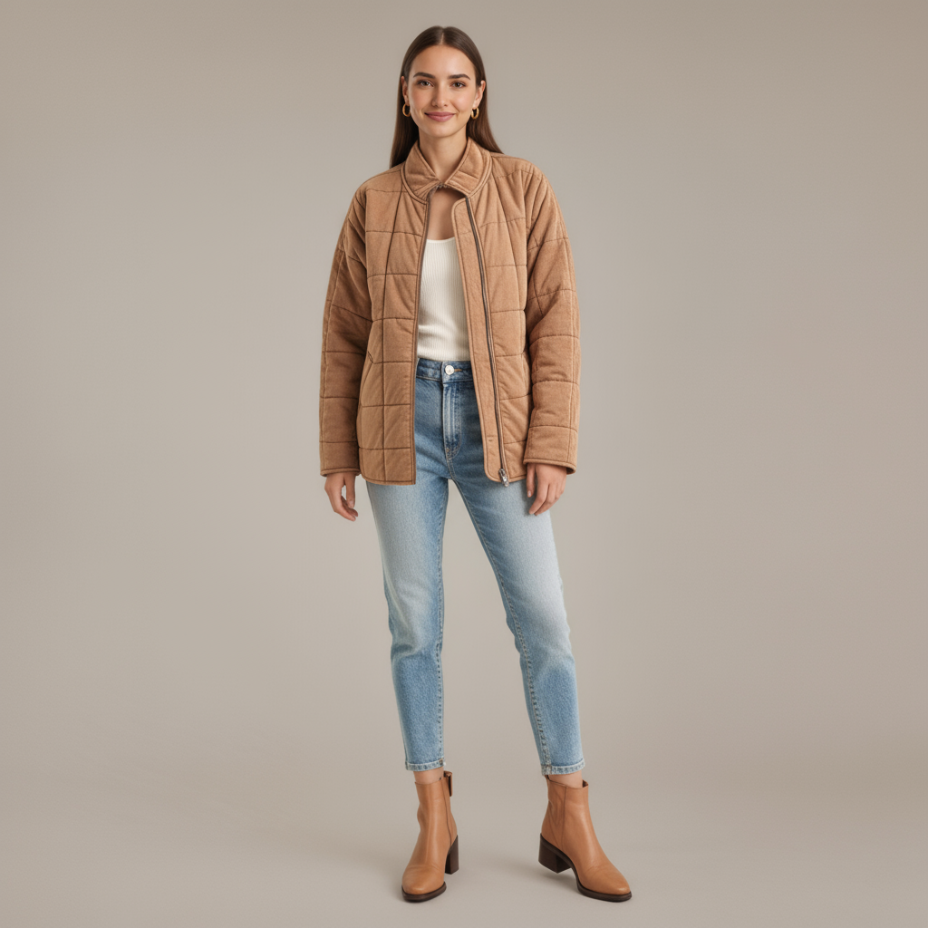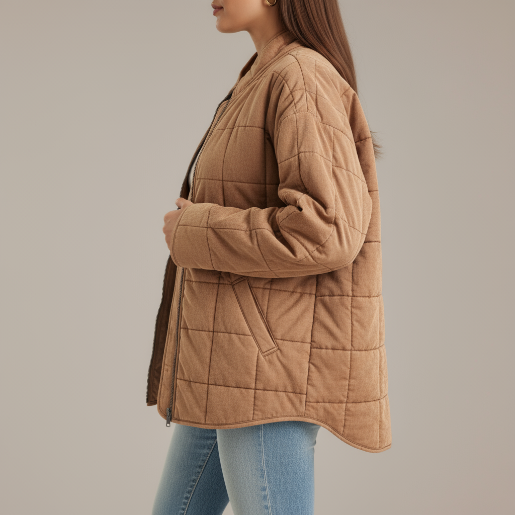 This cozy quilted jacket is crafted from ultra-soft fleece and finished with structured square stitching for a modern, utility-inspired look. Designed with a stand collar, full zip front, and drop shoulders, it offers both comfort and a clean silhouette. Side pockets add function while maintaining the streamlined shape. Ideal for layering on brisk days, this jacket blends practical warmth with elevated everyday style.