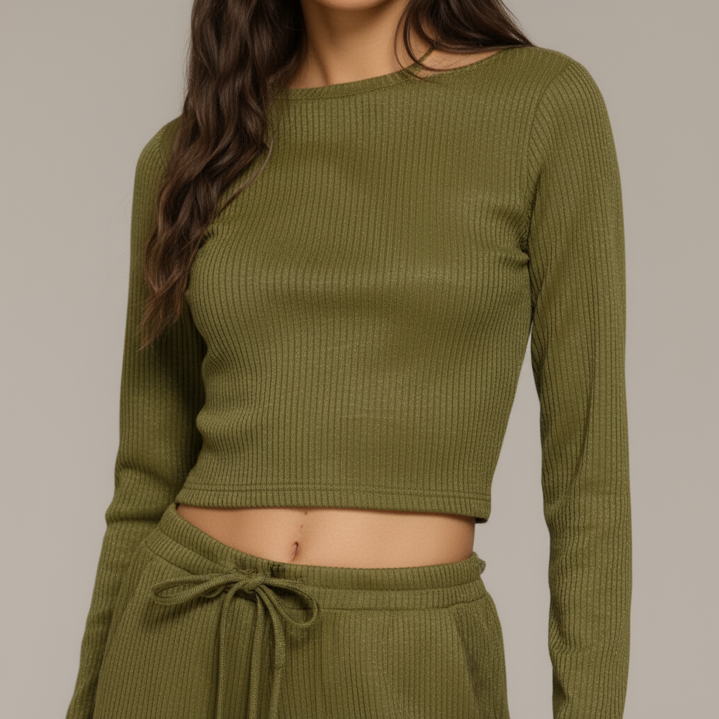 This ribbed lounge set combines a fitted long sleeve crop top with relaxed, wide leg pants for a modern take on cozy essentials. The soft, stretchy knit ensures all-day comfort, while the pants feature a flattering high rise and adjustable drawstring waist for a personalized fit. Designed with functional side pockets, this set offers an effortless look that moves seamlessly from lounging at home to casual outings.