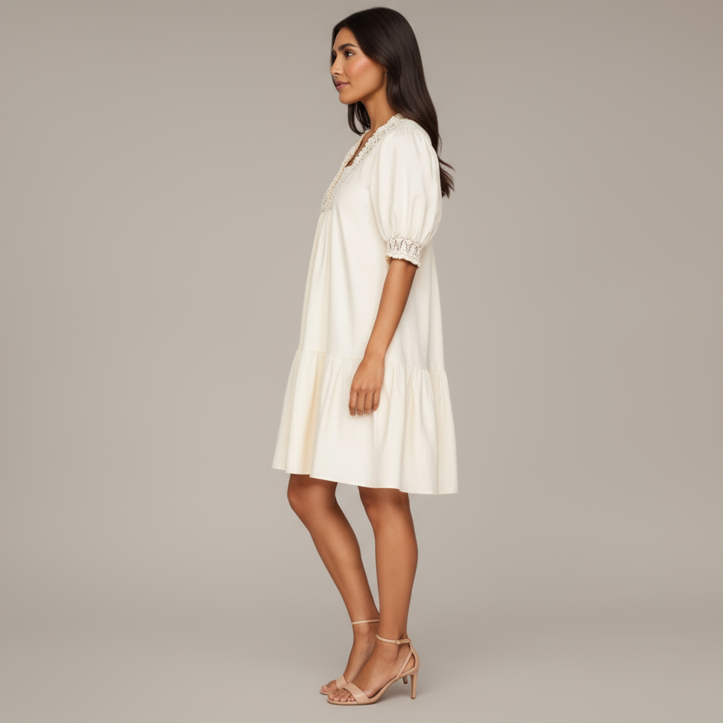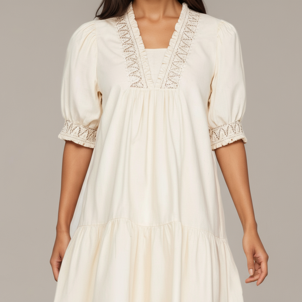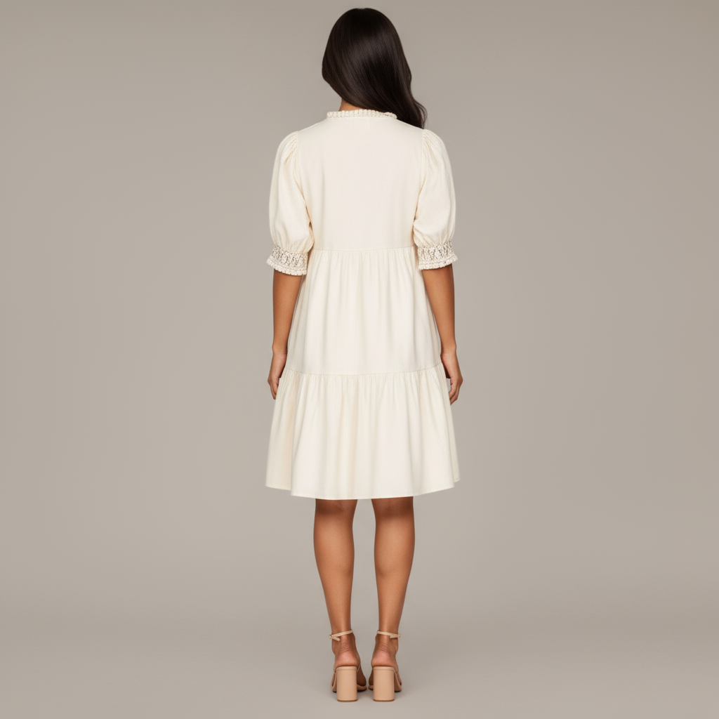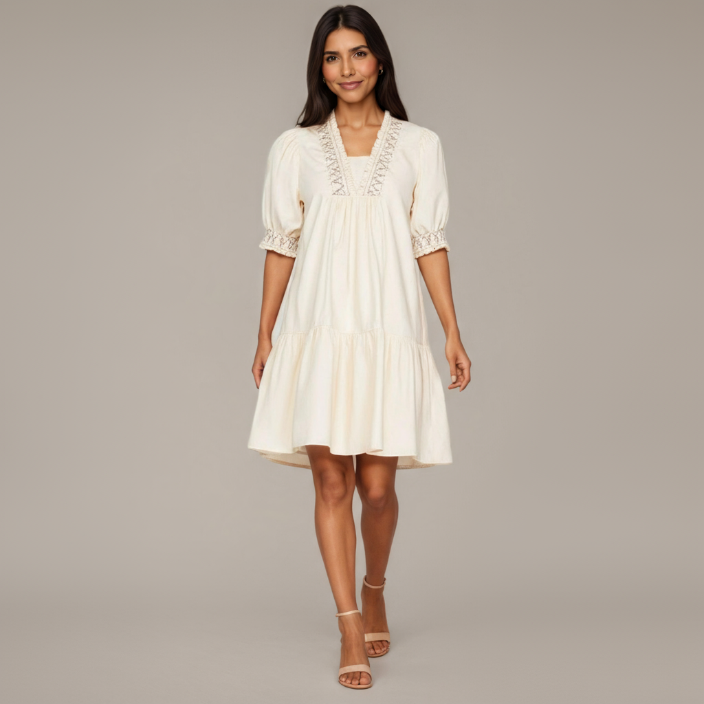 A soft, flowy silhouette defines this midi dress, finished with a delicately embroidered neckline for an artisanal touch. The smocked puff sleeves add texture and shape, while the tiered hem creates easy movement. Side pockets bring a casual functionality, balancing its feminine details. Lightweight and relaxed, this dress is ideal for effortless styling with sandals or boots.