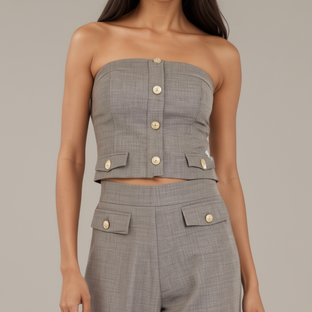 This strapless two-piece set offers a modern take on tailoring with a sleek, fitted crop top and coordinating wide-leg pants. The crop top features a button-front design with gold-tone detailing, adding a polished accent to its structured silhouette. Matching pants with a high waist and buttoned flap accents create a balanced, elongated look. Perfect for versatile styling, this set transitions seamlessly from day to night.