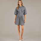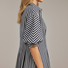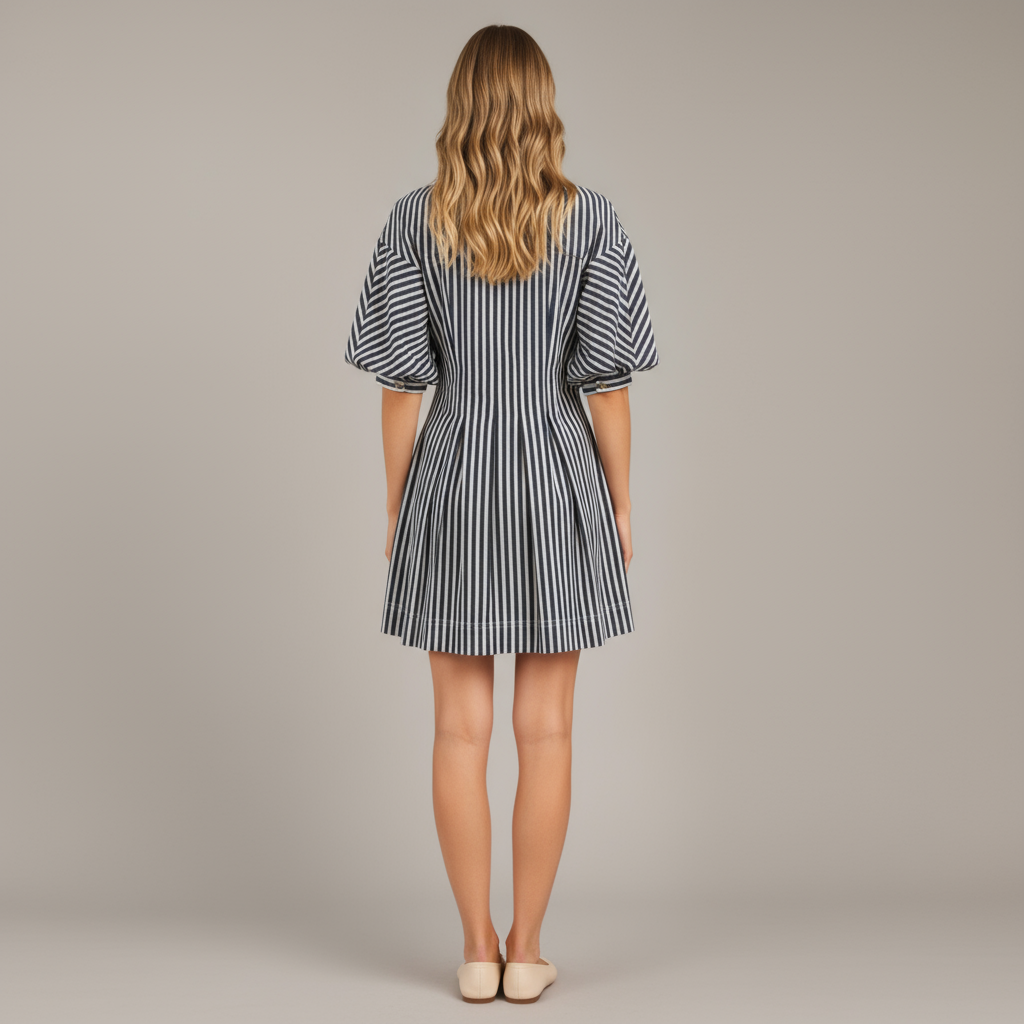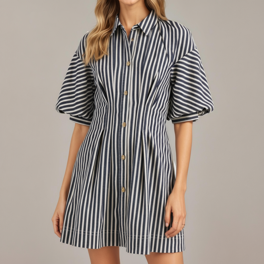 This striped shirt dress combines classic tailoring with bold design, featuring exaggerated puff sleeves and a defined waist. The vertical stripe pattern elongates the silhouette while the structured elbow-length sleeves add dramatic volume. A full button front and sharp collar bring a polished finish to the feminine cut. A modern staple that pairs effortlessly with sandals, heels, or boots.