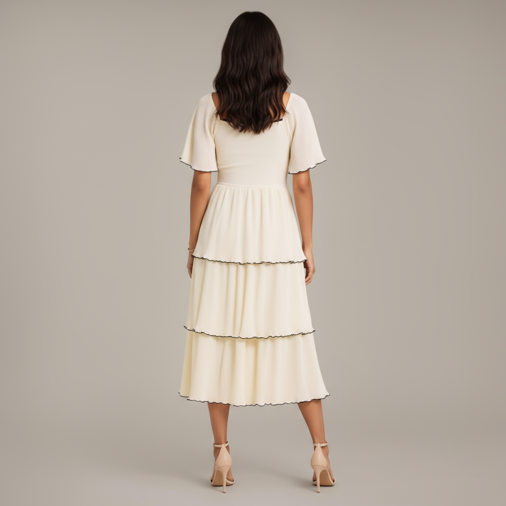 This elegant midi dress features a tiered pleated skirt that moves beautifully with every step, while flutter sleeves add a touch of romance. A square neckline with a dainty tie detail is framed by contrast trim that defines the silhouette with modern charm. The soft pleating creates graceful flow and dimension, making this dress ideal for both casual gatherings and elevated occasions. A refined blend of feminine ease and contemporary style.