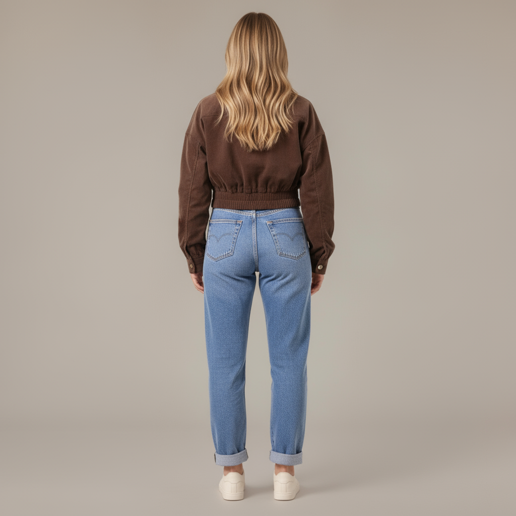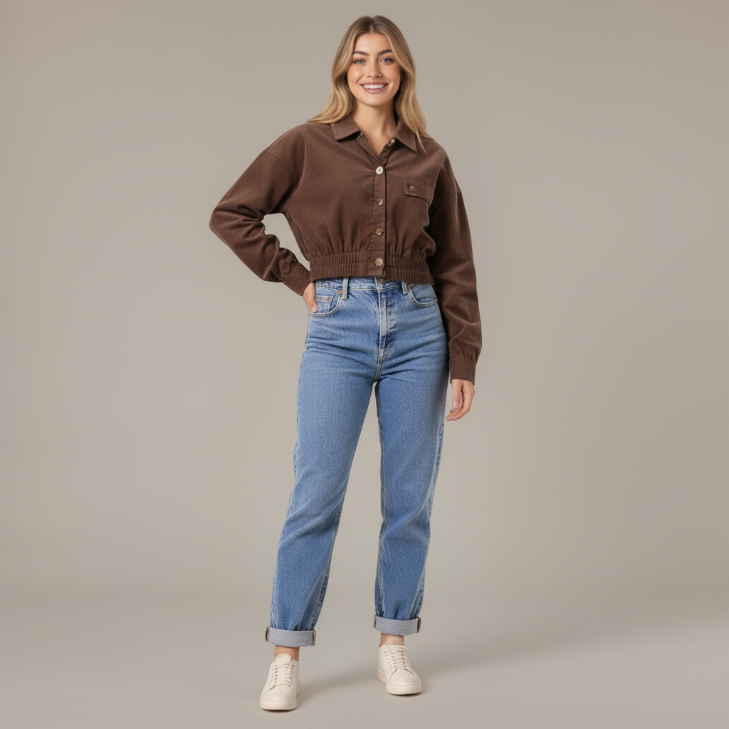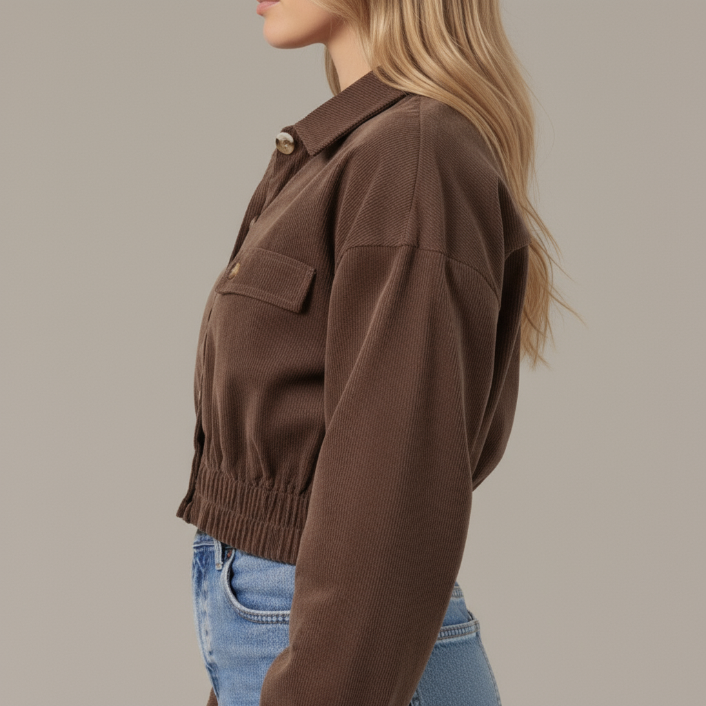 This cropped jacket is crafted from a soft, structured woven fabric with a polished finish and just enough drape. Featuring a sharp collared neckline and glossy button-front closure, it balances classic tailoring with a modern cropped silhouette. The stretch hemline cinches gently at the waist for a defined fit, while drop shoulders and long sleeves offer a relaxed shape. Pair it with high-rise denim or tailored pants for a bold, confident look.