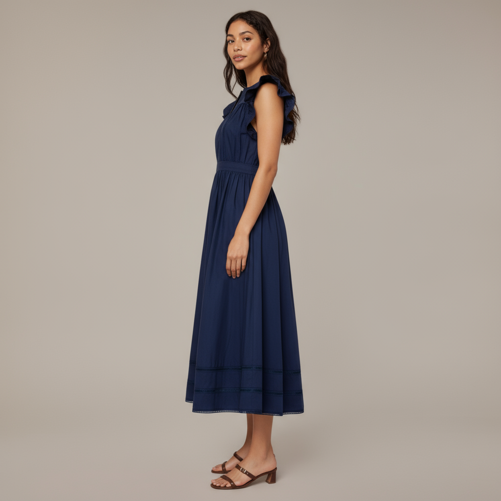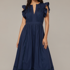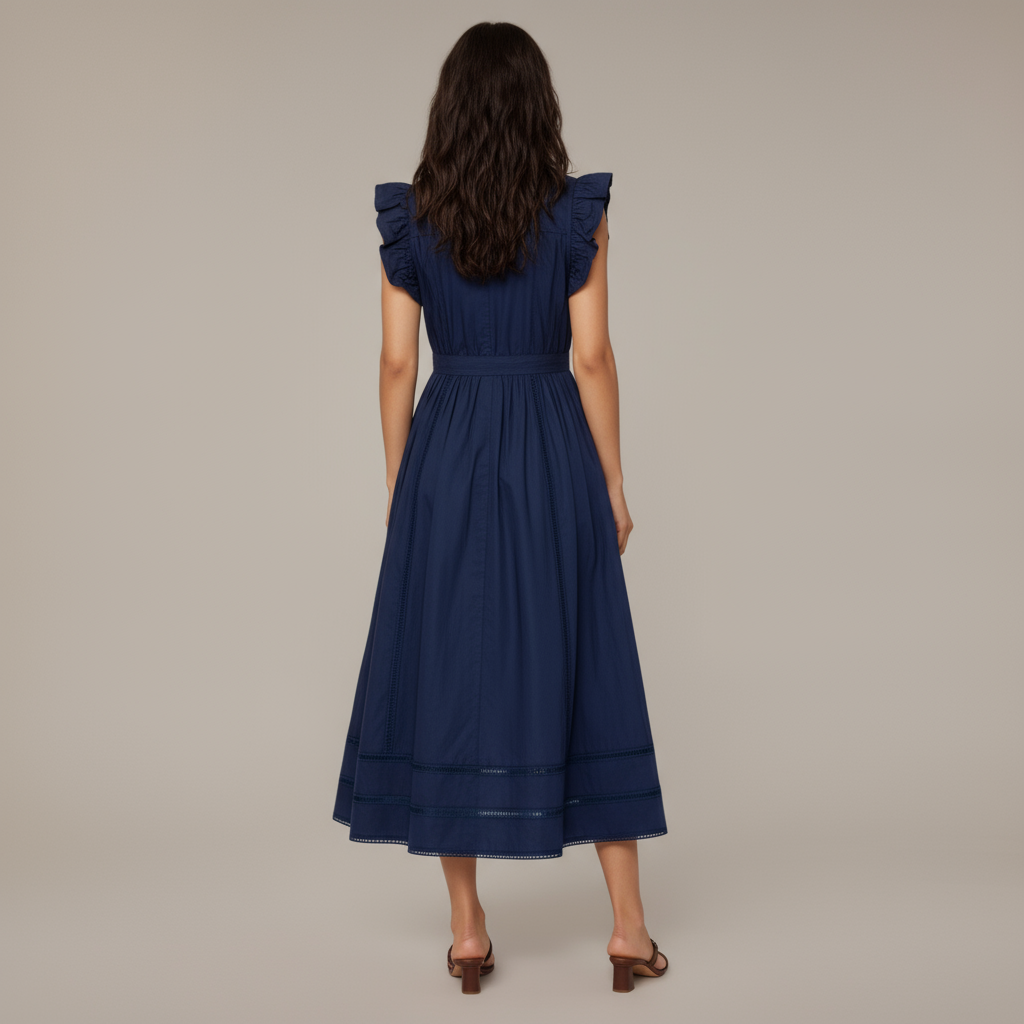This elegant midi dress features flutter sleeves and a flattering deep V-neckline for a feminine touch. Intricate seaming and a defined waistband create a beautifully tailored silhouette, while the tiered skirt adds movement and charm. Crafted from a lightweight woven fabric, it’s finished with subtle lace insets at the hem for extra detail. Dress it up with strappy heels or keep it casual with flats for versatile day-to-evening style.