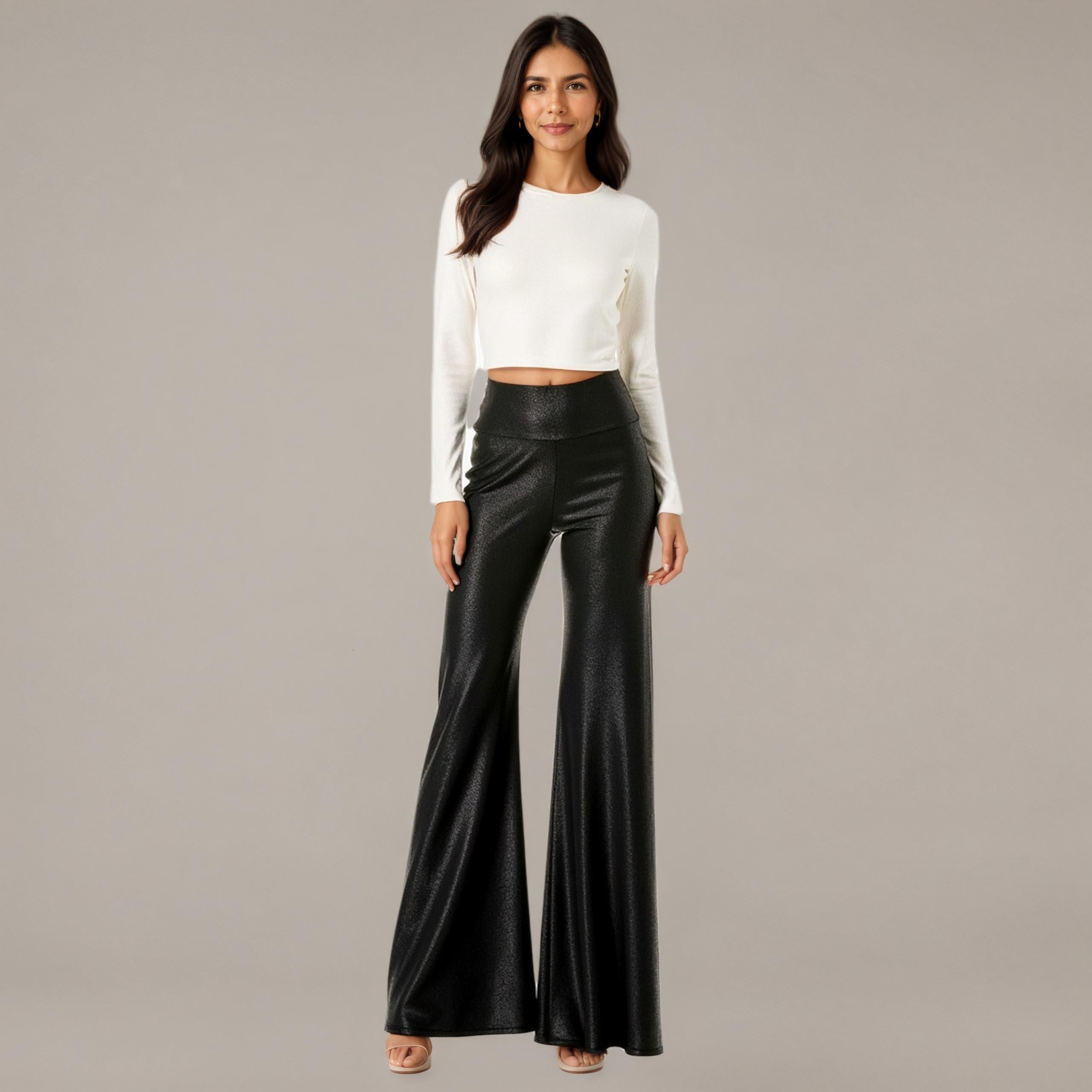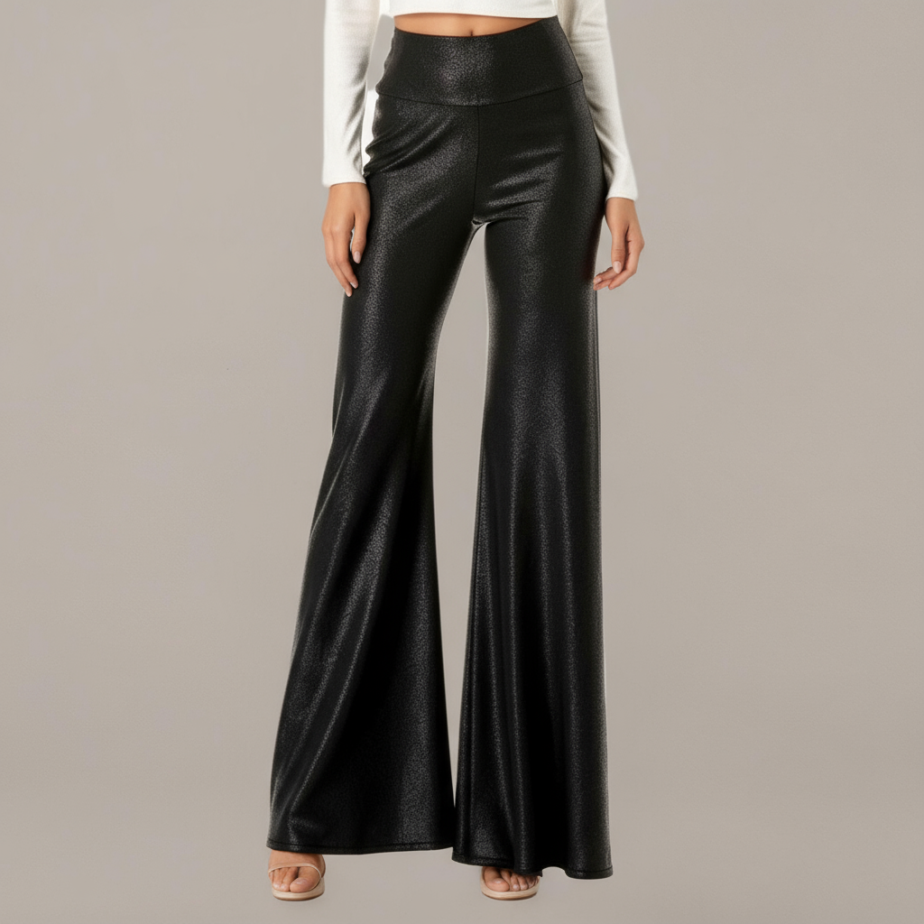 These high waist wide-leg pants offer a sleek and elongating silhouette, perfect for both day and night styling. Designed with a flattering waistband and a flowing flared leg, they bring effortless movement and comfort while maintaining a polished look. The smooth, subtly lustrous finish adds a refined touch, making them easy to pair with blouses, knits, or statement tops. An essential addition to your modern wardrobe, balancing versatility with understated elegance.