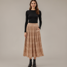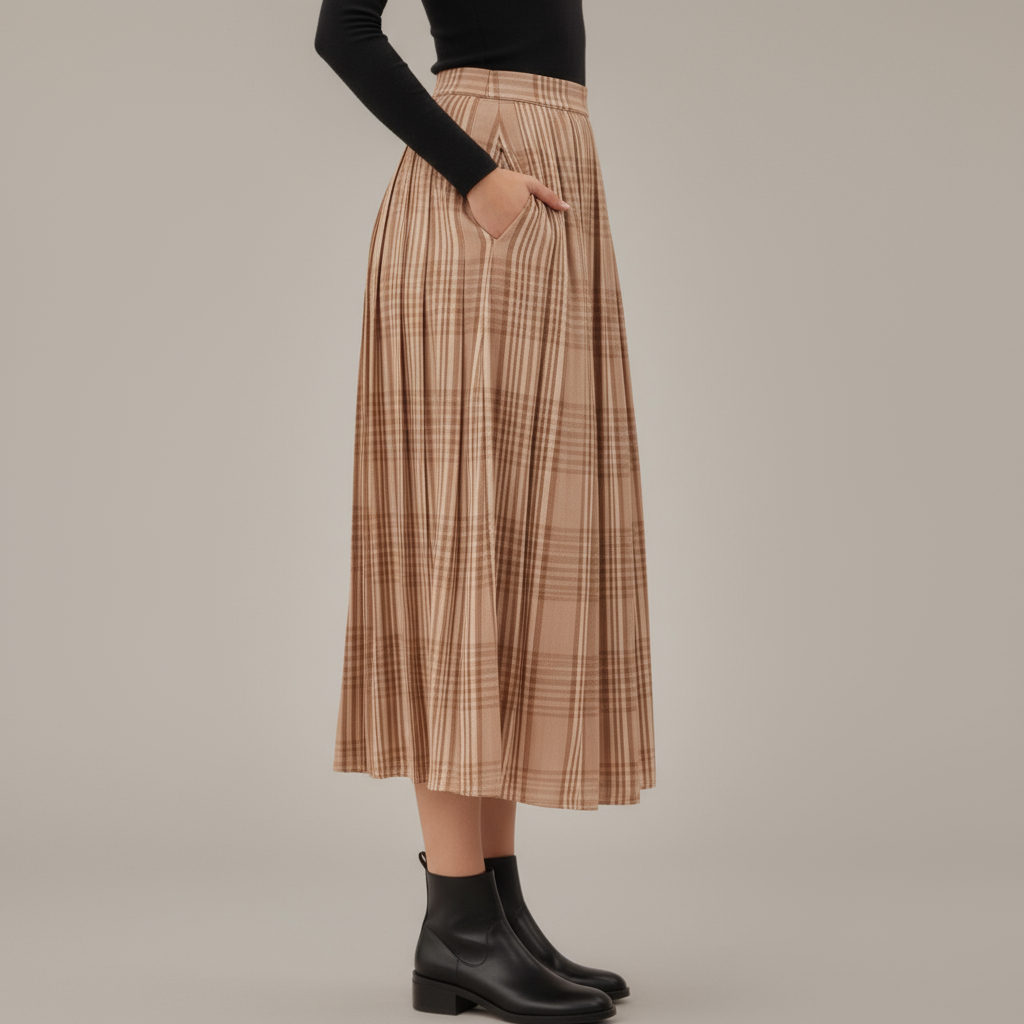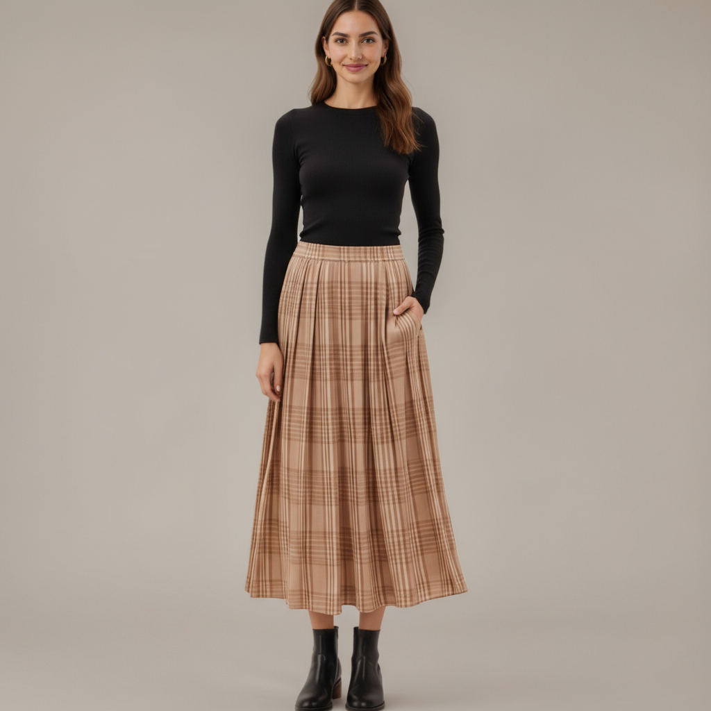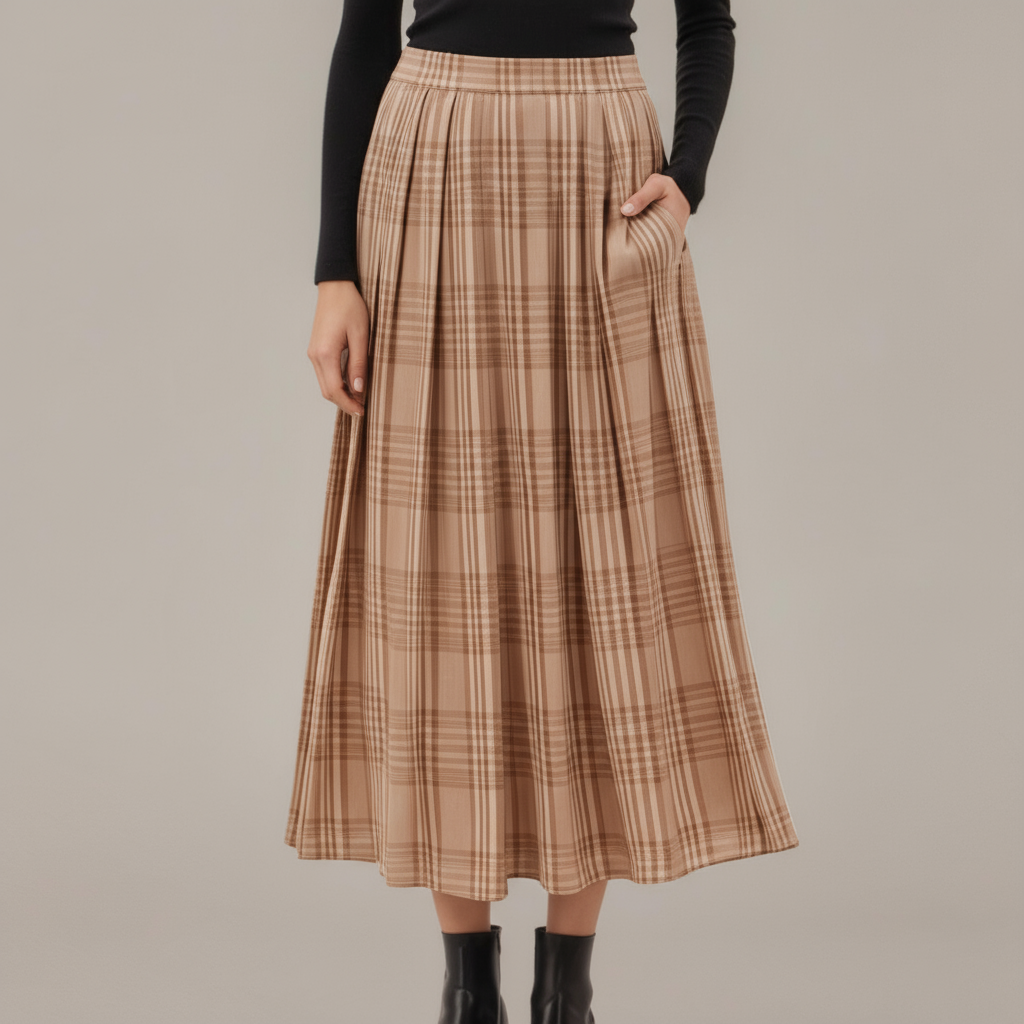 This flowing maxi skirt features a timeless plaid pattern and allover pleats for elegant movement with every step. The soft, lightweight fabric drapes beautifully, while the elastic waistband ensures a comfortable and secure fit. Side pockets add a practical touch to the classic silhouette, making it as functional as it is stylish. Perfect for pairing with fitted tops or cozy knits, this skirt brings effortless polish to your wardrobe.