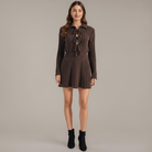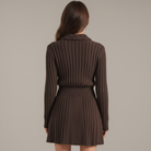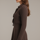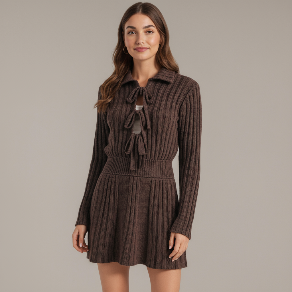 This ribbed knit mini dress balances playful charm with classic texture. The bow tie front detail adds a feminine touch, while the fitted waist creates a flattering silhouette that flows into a lightly flared skirt. Long sleeves make it a versatile option for transitional weather, pairing effortlessly with ankle boots or layered outerwear.