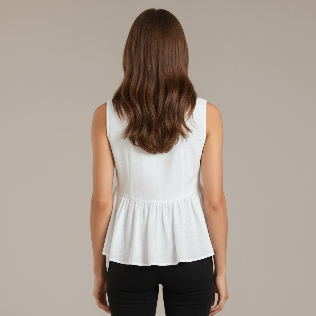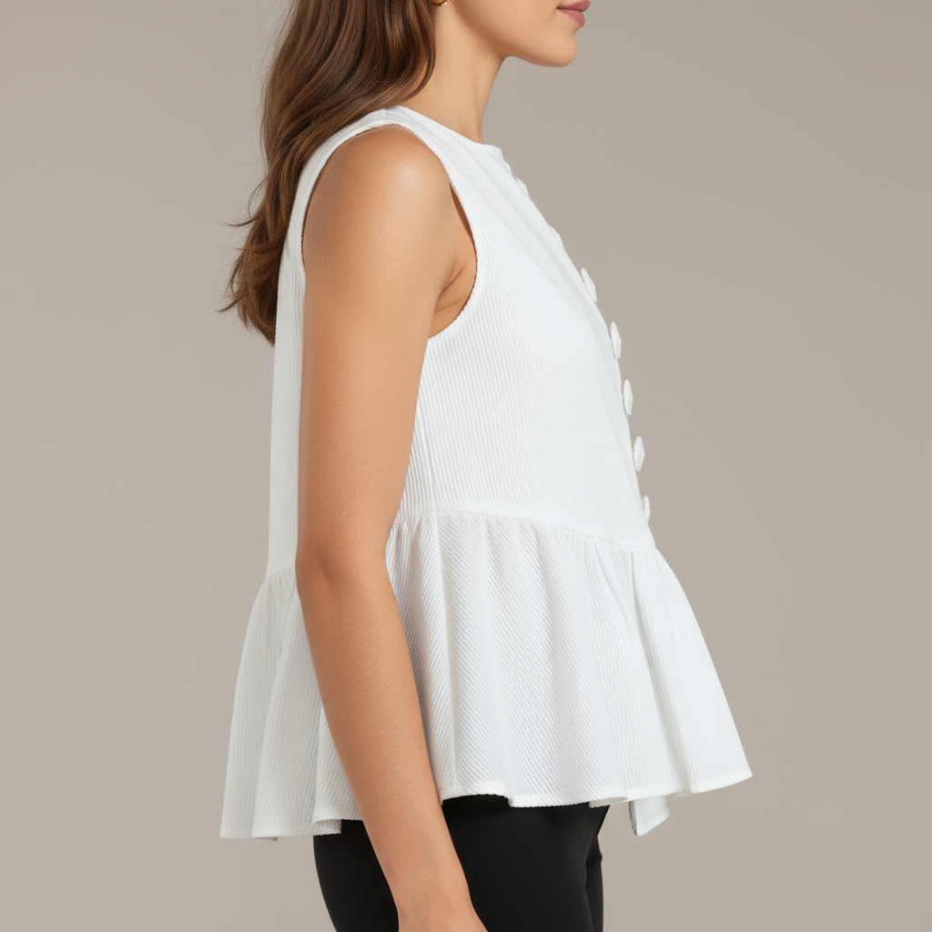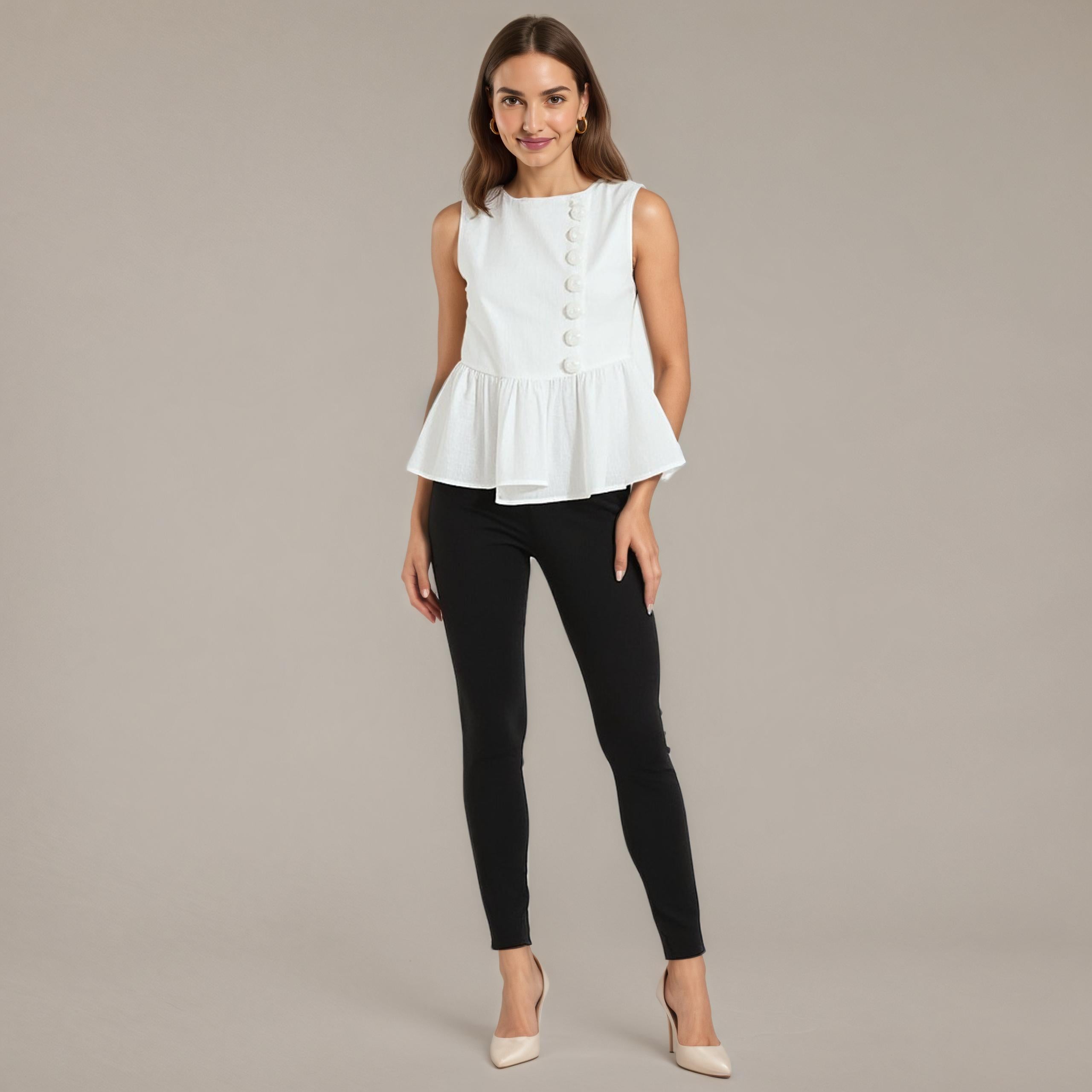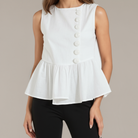 This sleeveless peplum top combines tailored elegance with playful detailing. The asymmetric pearl button front adds a refined focal point, while the peplum hem creates a flattering, feminine silhouette. Crafted from a smooth, structured fabric, it offers a polished look ideal for pairing with tailored pants or skirts.
