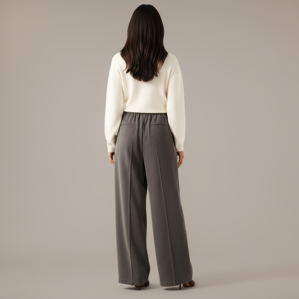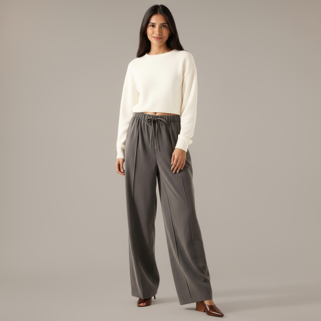 These wide leg trousers are designed in a soft, fluid fabric with subtle stretch for all-day ease and elegance. The high-rise elastic waistband is detailed with a functional drawstring and belt loops for customizable styling. Front center seams add polished structure, while the wide leg cut enhances movement and comfort. Perfect for pairing with fitted knits, tucked blouses, or relaxed tees, these trousers balance laid-back ease with refined appeal.