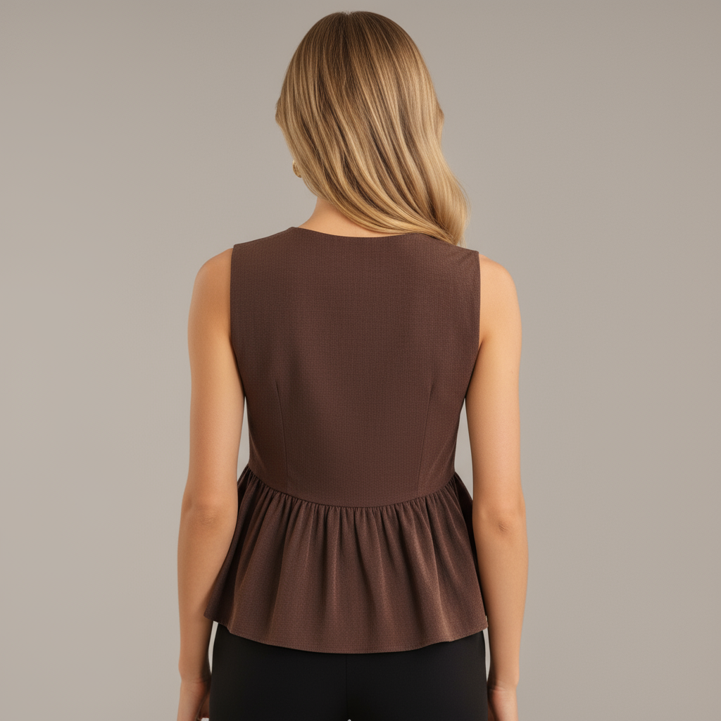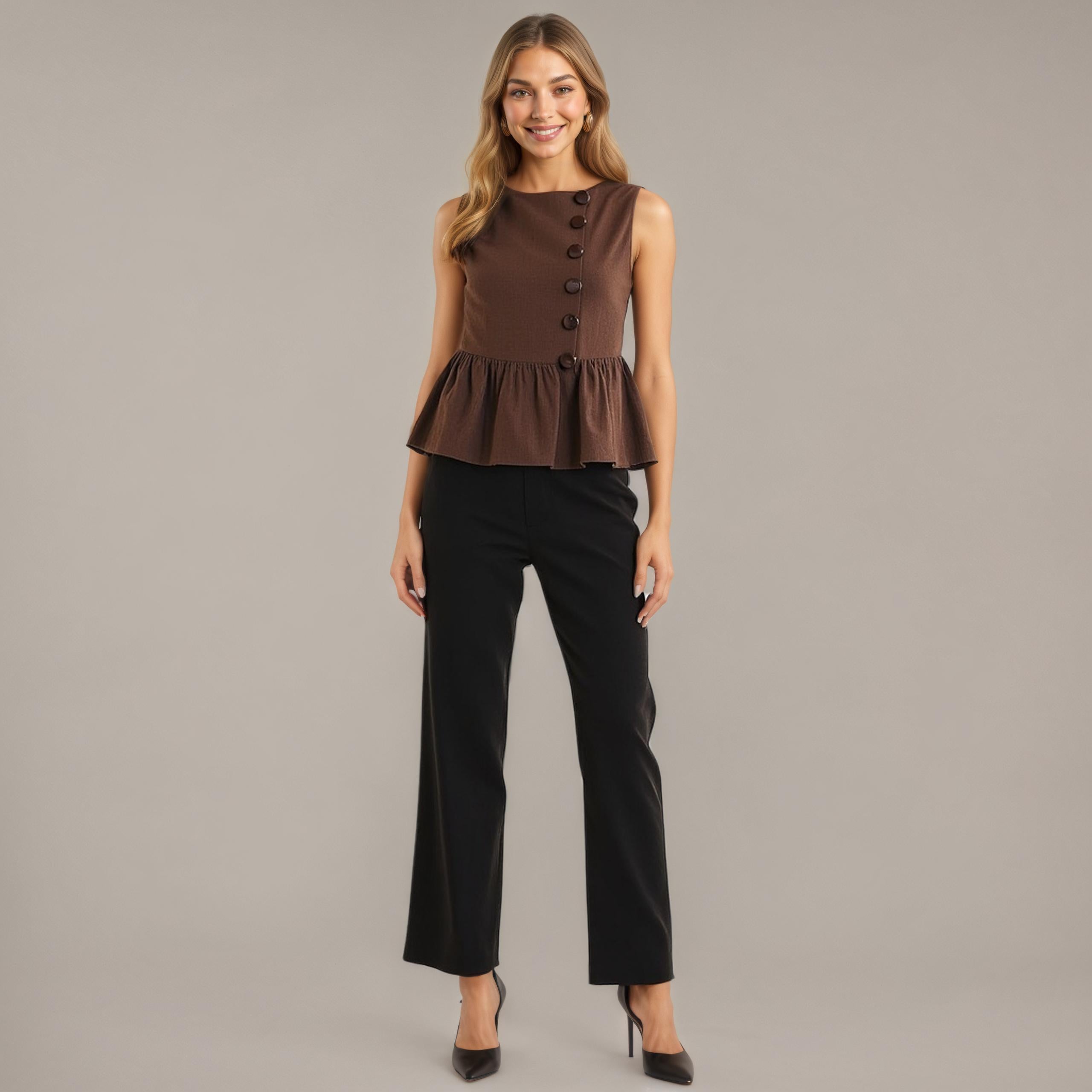 This sleeveless peplum top combines tailored elegance with playful detailing. The asymmetric pearl button front adds a refined focal point, while the peplum hem creates a flattering, feminine silhouette. Crafted from a smooth, structured fabric, it offers a polished look ideal for pairing with tailored pants or skirts.