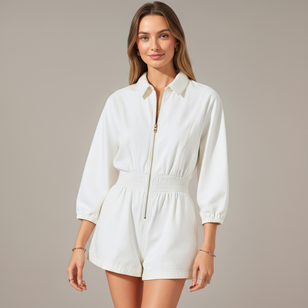 This long sleeve romper combines comfort and style with its zip front closure, classic collared neckline, and flattering elastic waistband. The gathered waist accentuates the silhouette, while the relaxed sleeves and cuffed hems add a casual yet elevated touch. Ideal for daytime outings or travel looks, this polished romper brings structure and ease into one effortless piece.