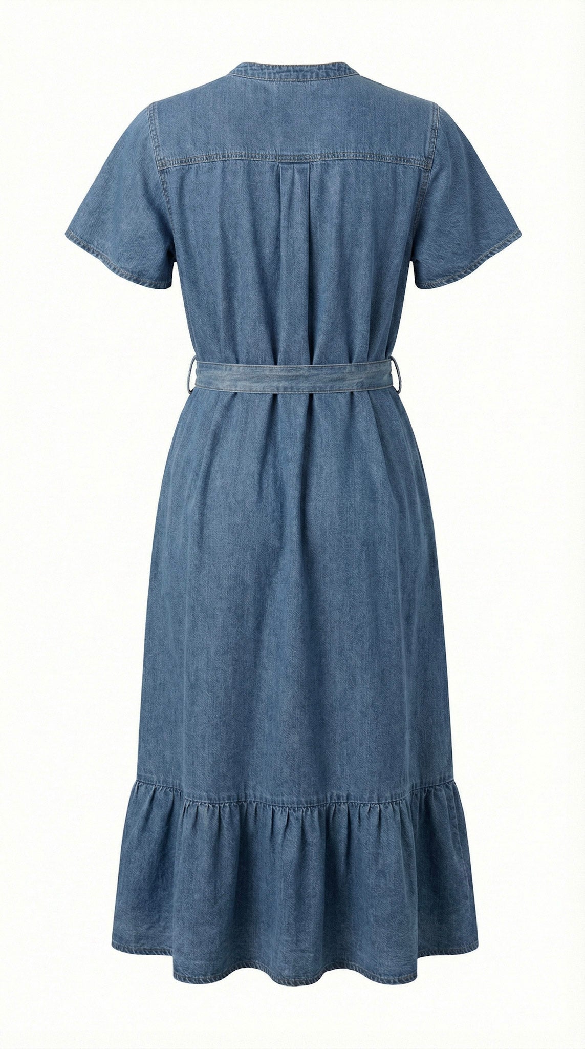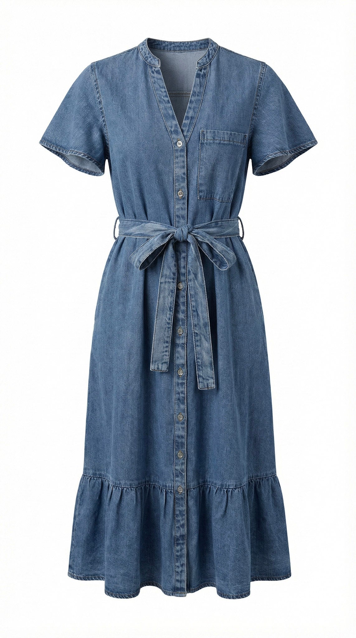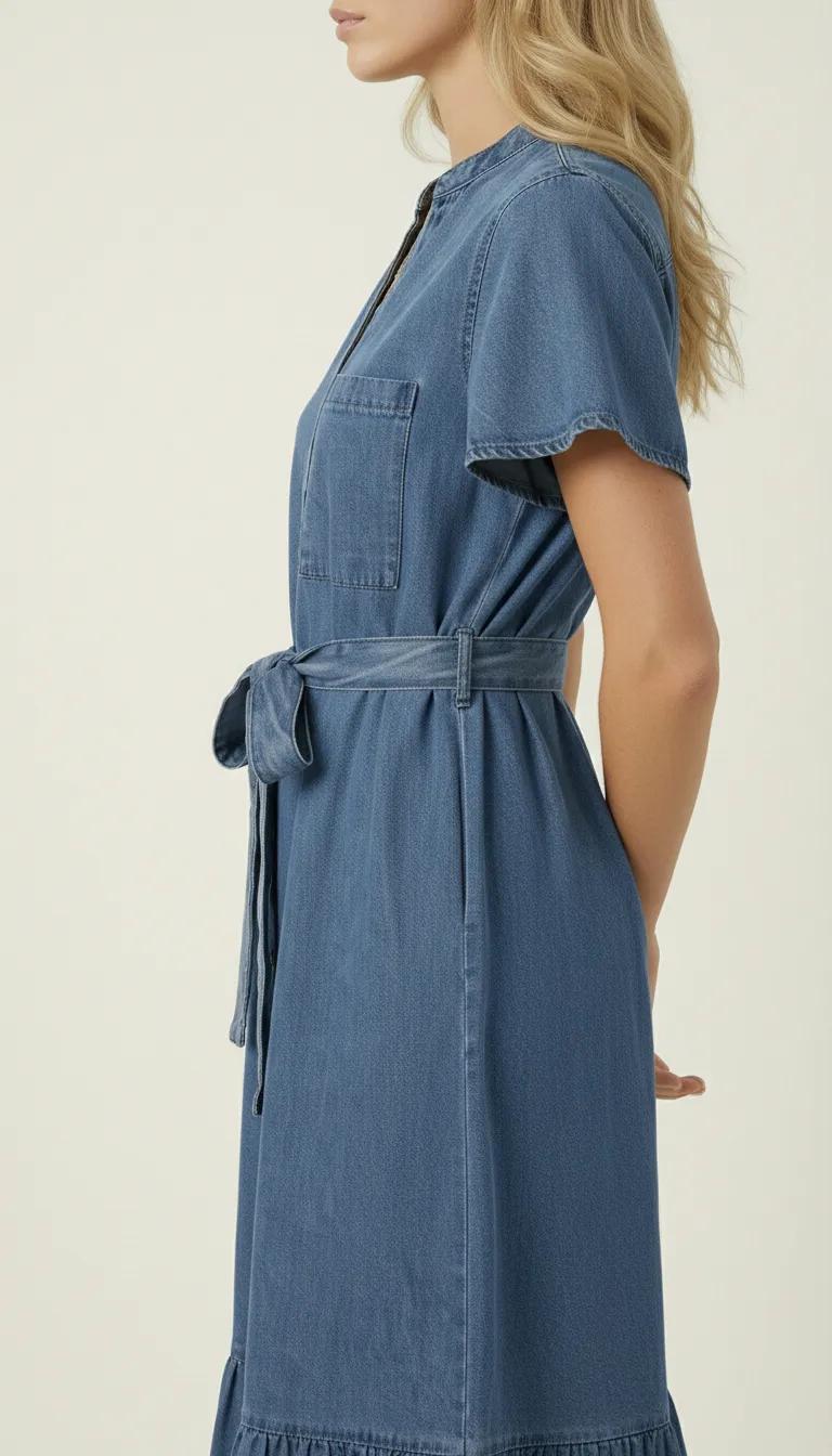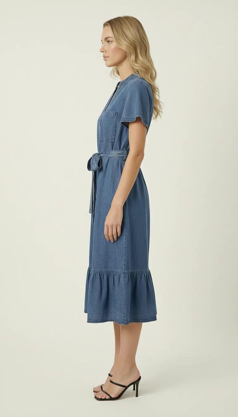 This midi shirt dress is crafted from soft, structured denim that offers a relaxed drape with a tailored finish. A band collar and button front create a clean, modern neckline, while short sleeves and a chest pocket add understated utility detail. The self-tie belt defines the waist for a flattering silhouette before falling into a softly gathered ruffle hem. Style it with minimalist heels for polished ease or pair with flats and a woven bag for effortless daytime refinement.