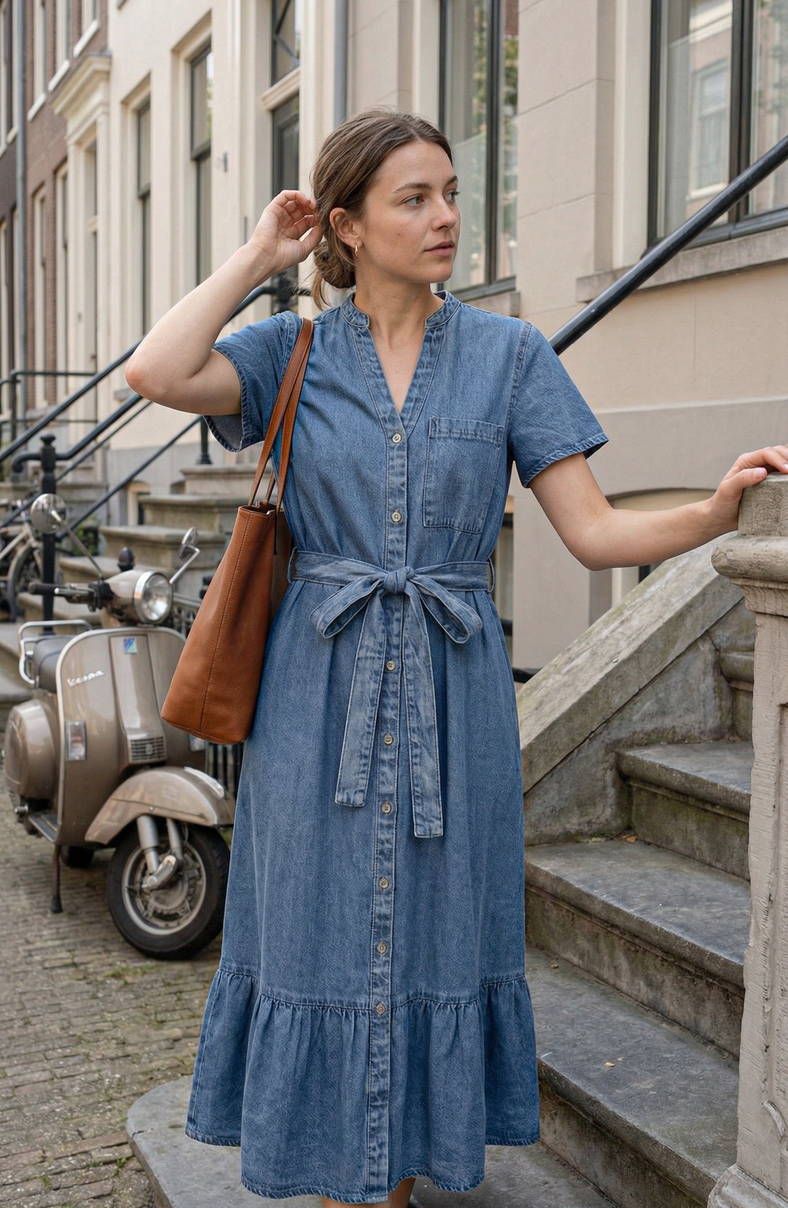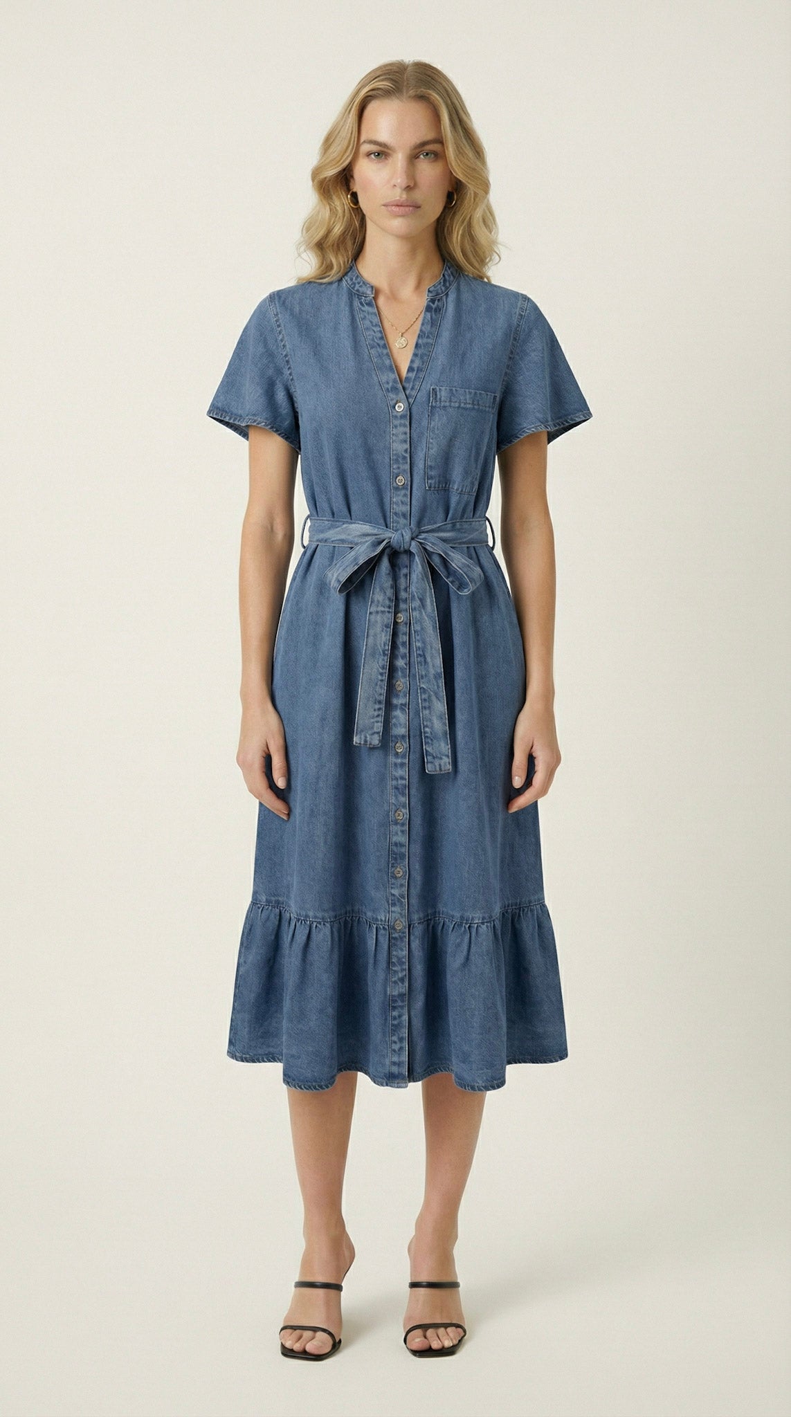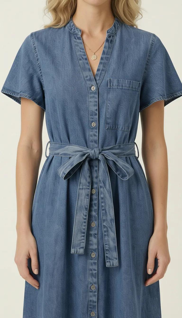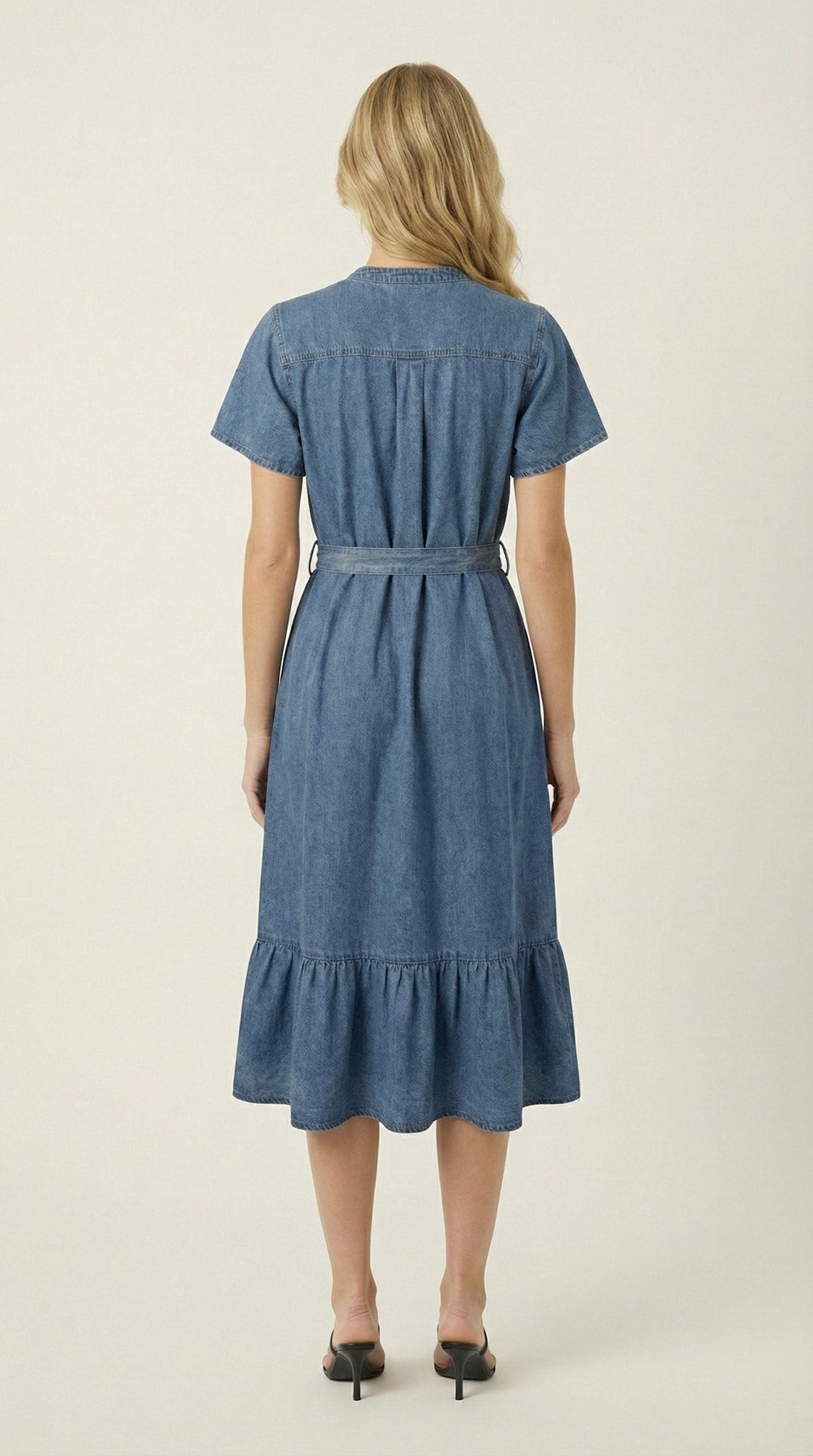 This midi shirt dress is crafted from soft, structured denim that offers a relaxed drape with a tailored finish. A band collar and button front create a clean, modern neckline, while short sleeves and a chest pocket add understated utility detail. The self-tie belt defines the waist for a flattering silhouette before falling into a softly gathered ruffle hem. Style it with minimalist heels for polished ease or pair with flats and a woven bag for effortless daytime refinement.