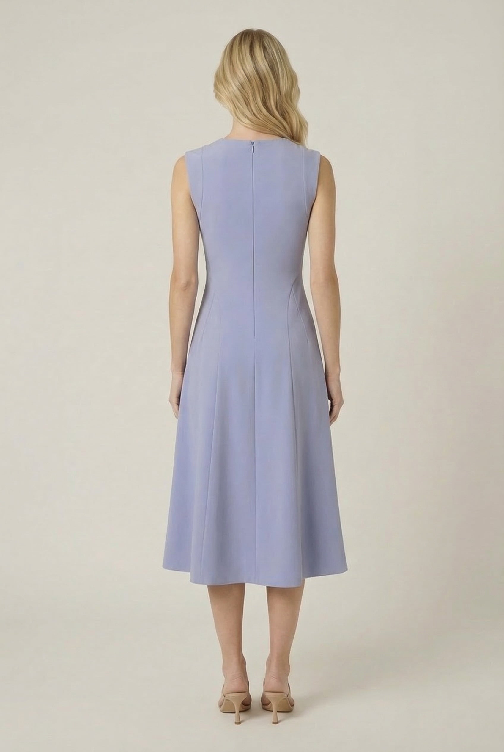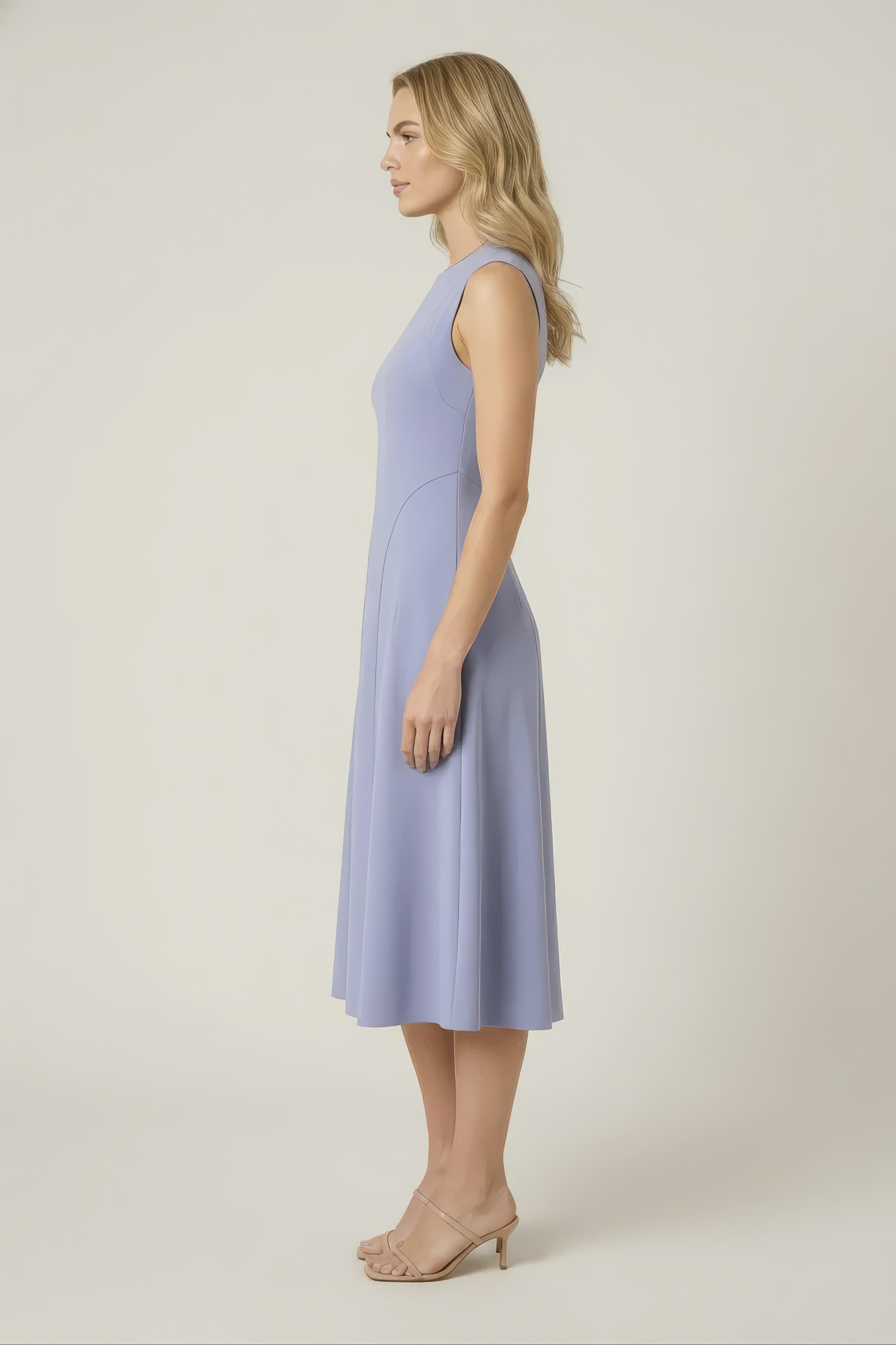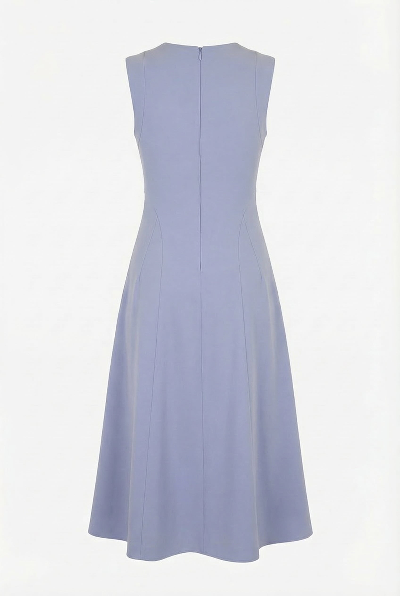 This sleeveless midi dress features a clean, tailored silhouette enhanced by structured seaming that contours the body for a refined fit. The fitted bodice transitions into a softly flared skirt, creating elegant movement and a balanced, feminine shape. Its minimalist neckline and smooth finish give it a polished, modern feel. Style it with simple heels or flats for a versatile look that feels timeless, sophisticated, and effortlessly elevated.