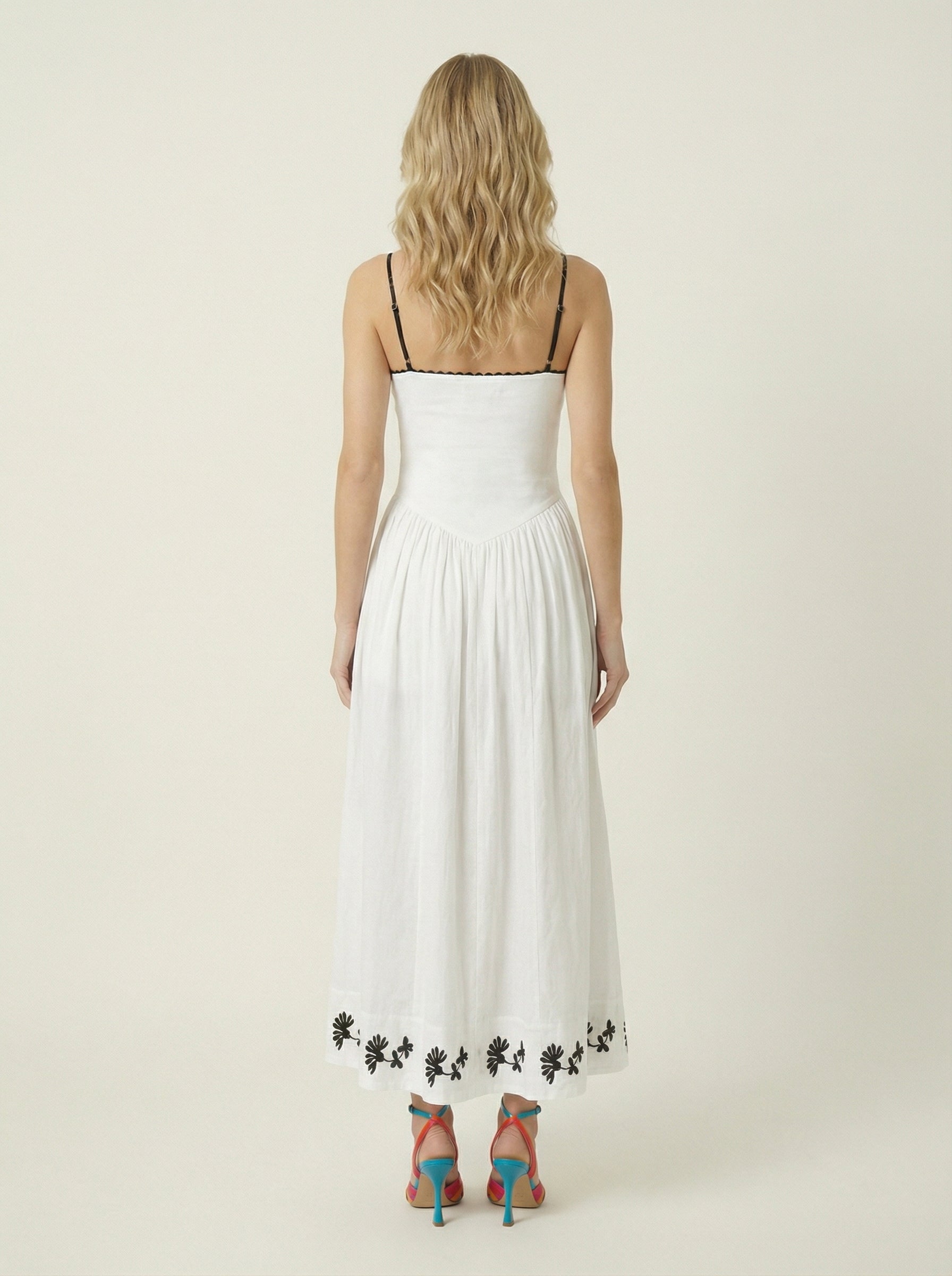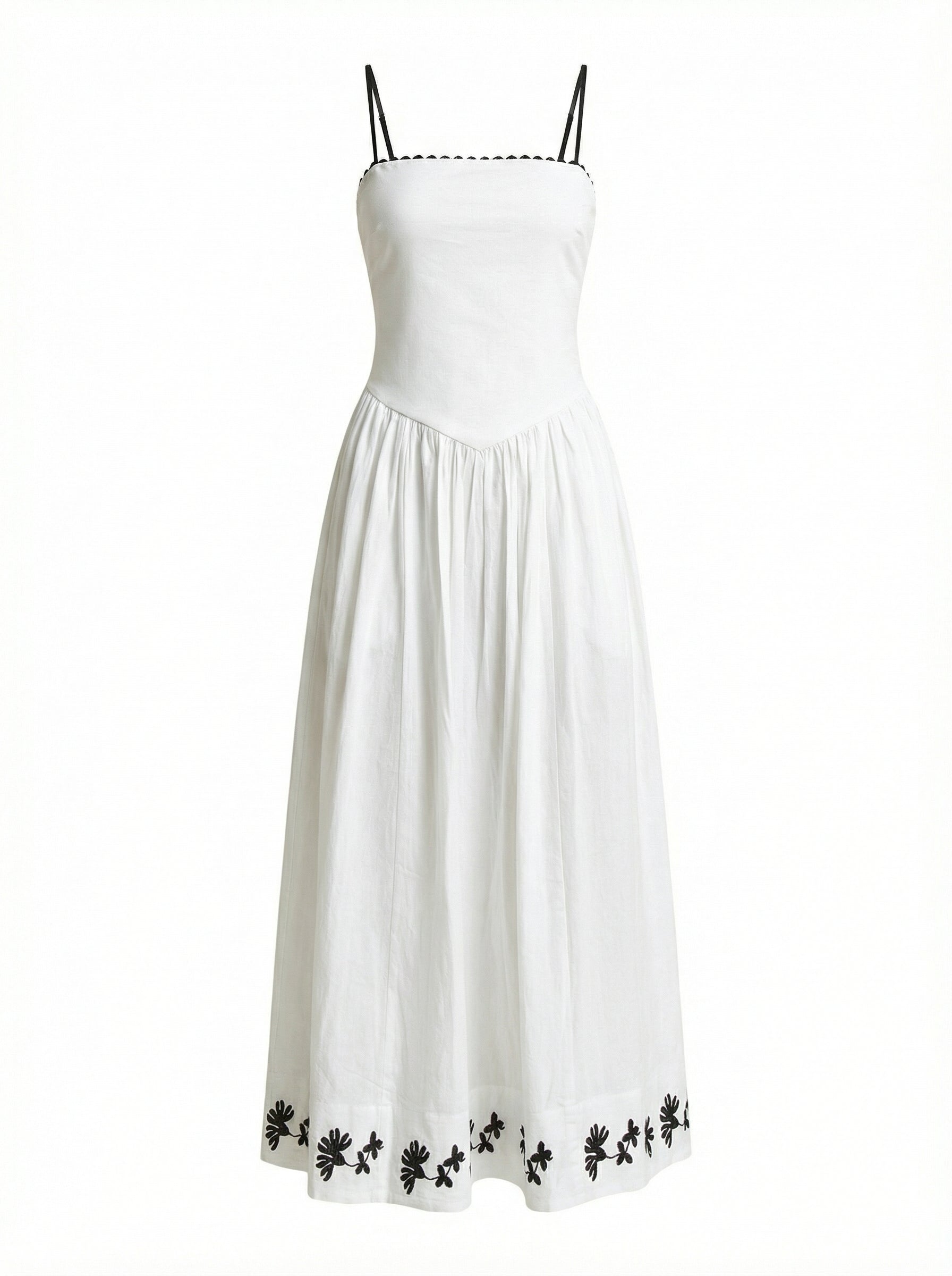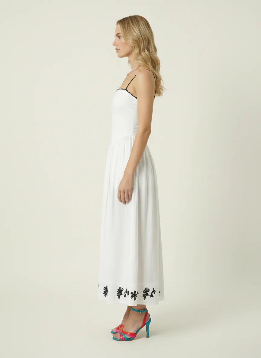 Elegantly tailored with a nod to vintage charm, this strapless A-line dress combines minimalist structure with artisanal embroidery. The bodice features delicate contrast piping and a corset-inspired waistline that softly sculpts the figure before cascading into a voluminous, gathered skirt. Black floral embroidery adorns the hem for a refined finish, while side pockets add a practical touch. A timeless silhouette designed for warm-weather soirées, resort escapes, or elevated daytime dressing.