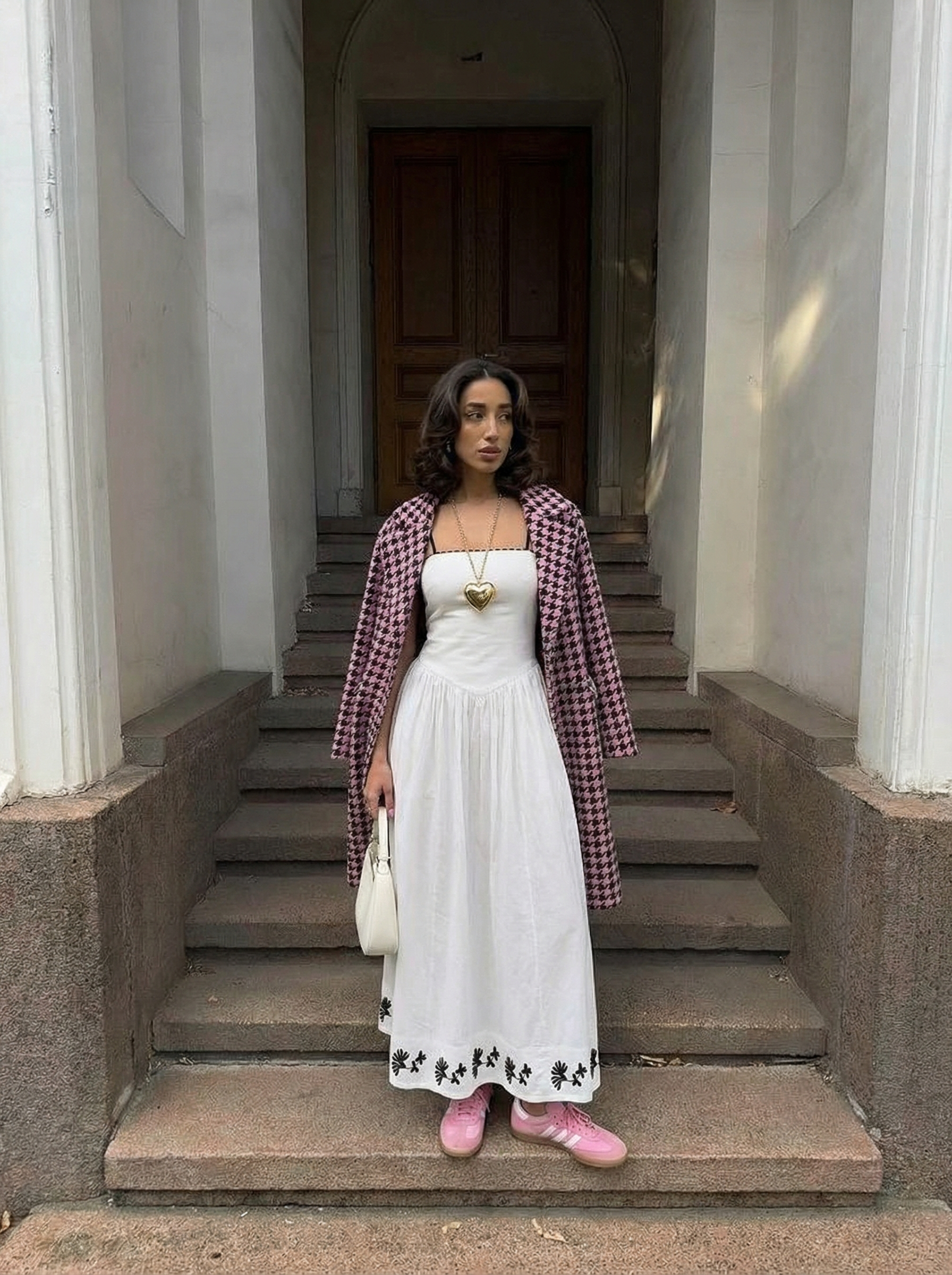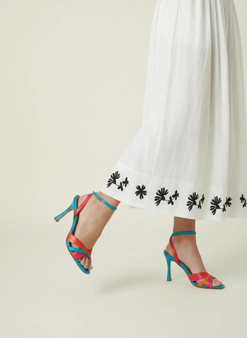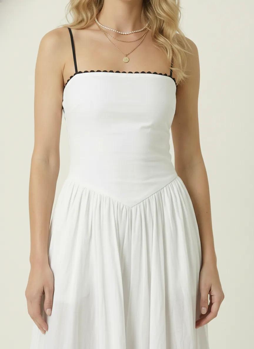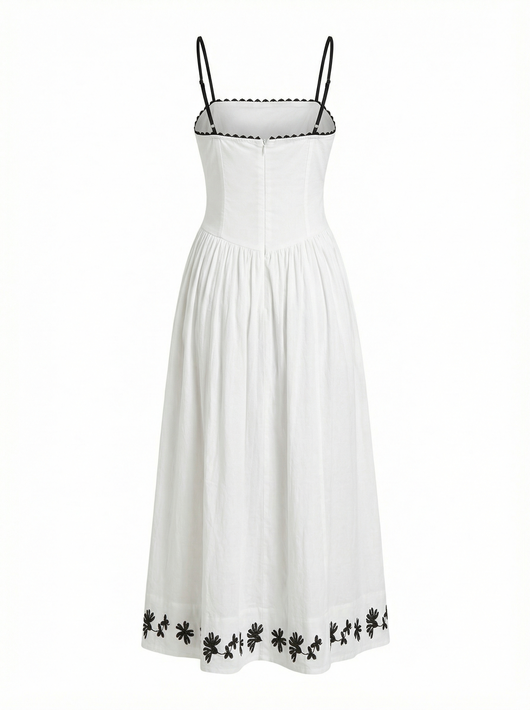 Elegantly tailored with a nod to vintage charm, this strapless A-line dress combines minimalist structure with artisanal embroidery. The bodice features delicate contrast piping and a corset-inspired waistline that softly sculpts the figure before cascading into a voluminous, gathered skirt. Black floral embroidery adorns the hem for a refined finish, while side pockets add a practical touch. A timeless silhouette designed for warm-weather soirées, resort escapes, or elevated daytime dressing.