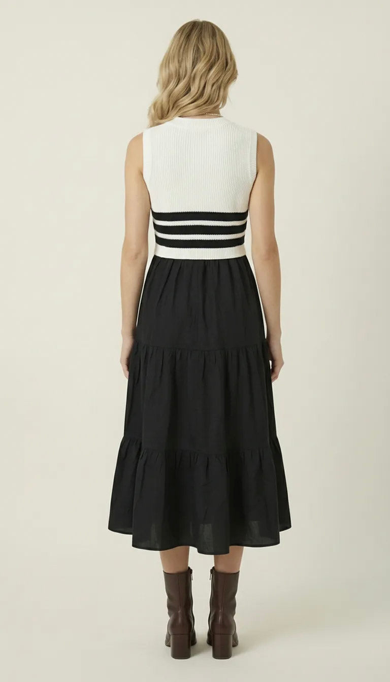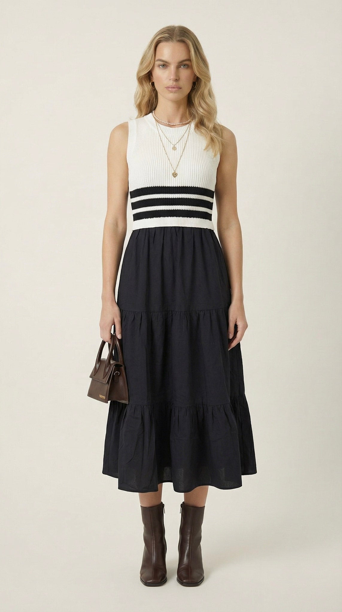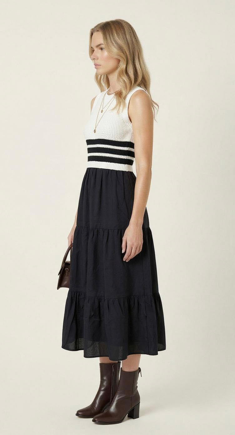 This sleeveless midi dress features a structured knit sweater bodice with bold horizontal stripe detailing that cinches the waist with a refined, tailored feel. The soft contrast skirt flows into subtle tiered panels, creating graceful movement and balanced volume. A classic crew neckline keeps the silhouette polished while blending elevated texture with effortless femininity. Style it with knee-high boots for a modern statement or pair it with sleek flats for a sophisticated daytime look.