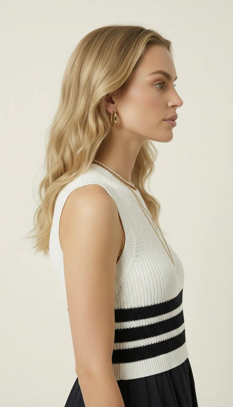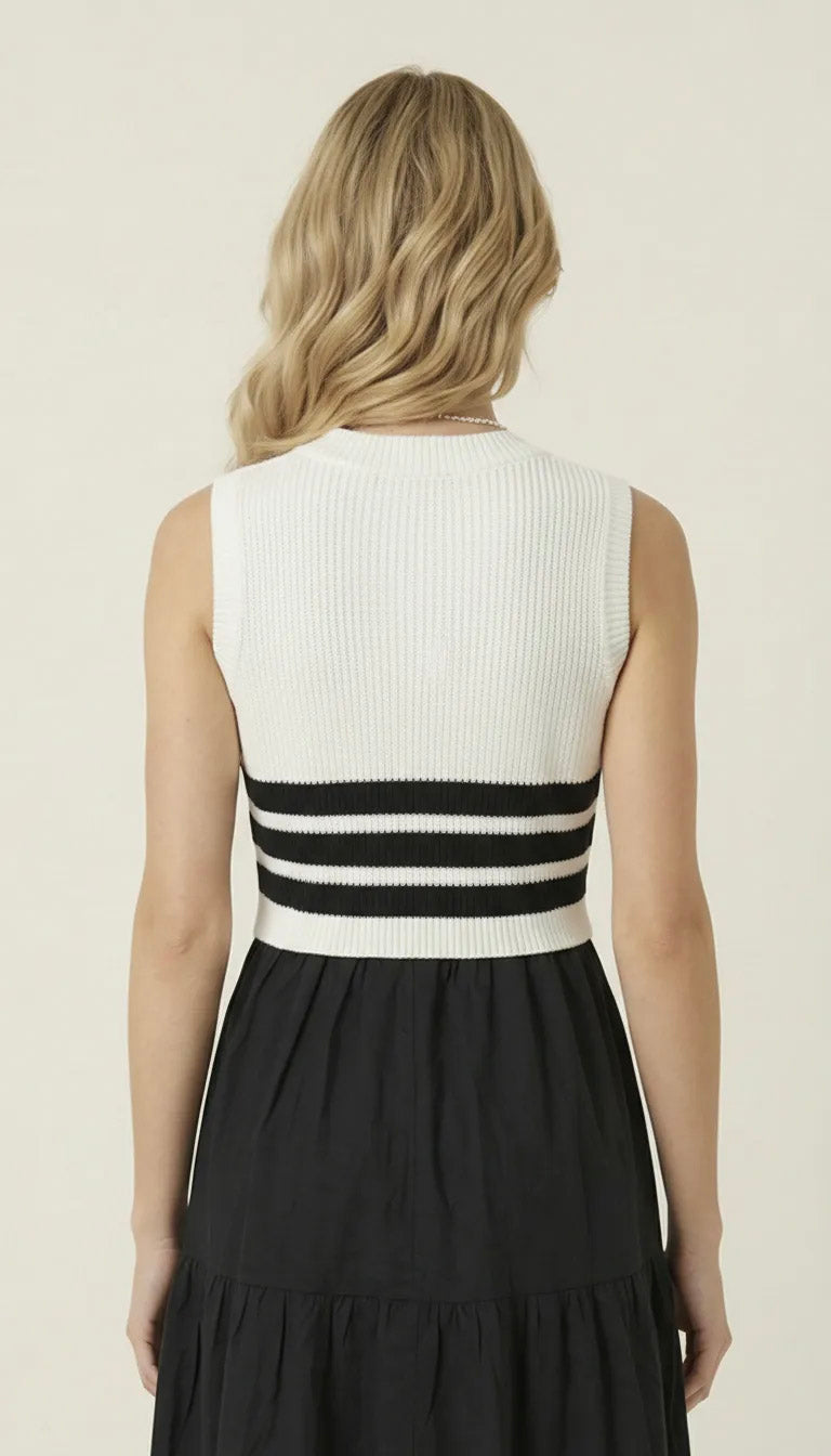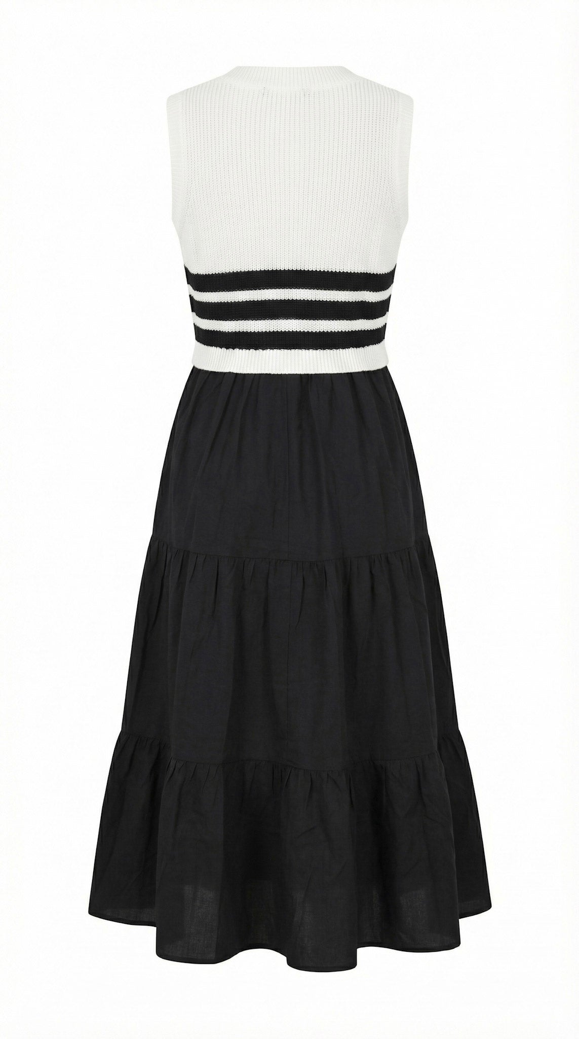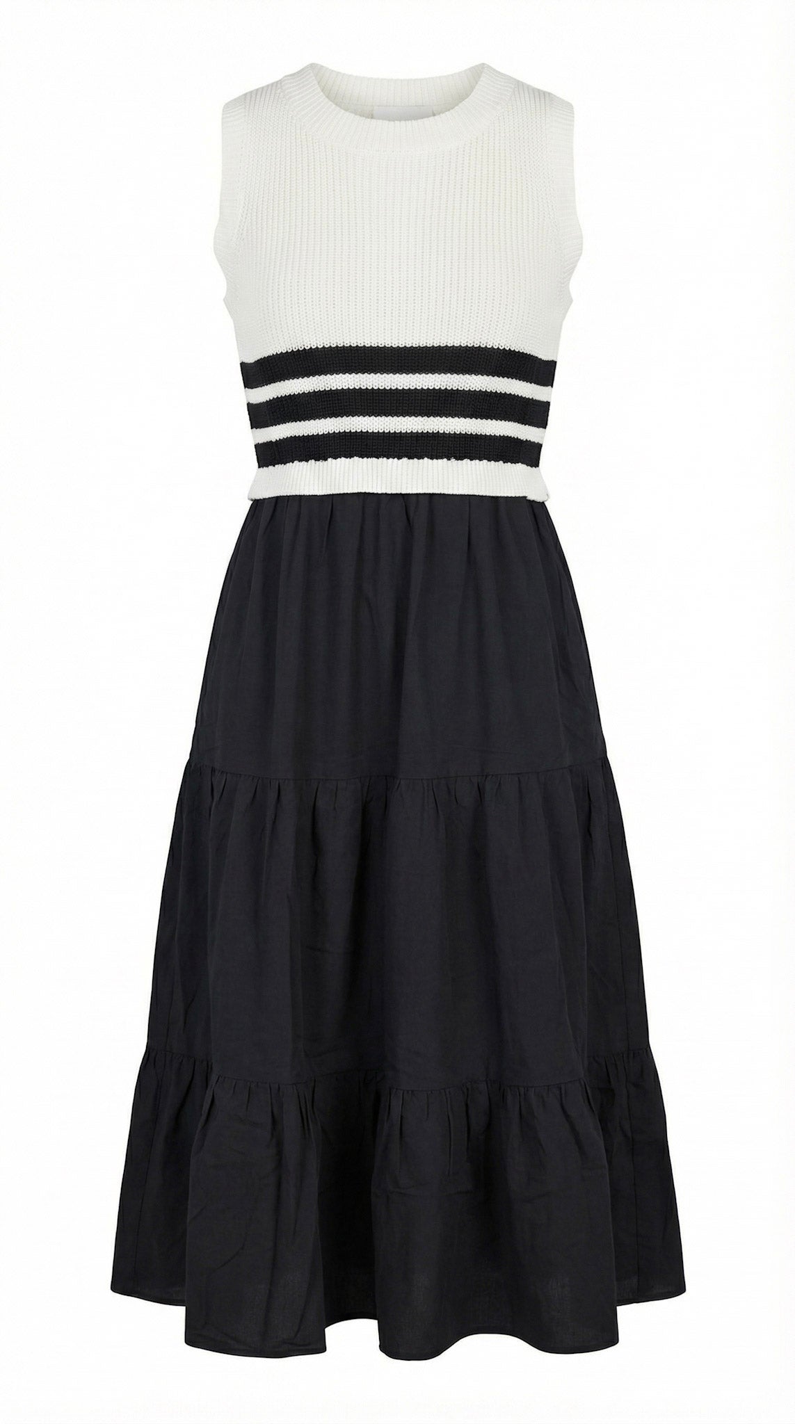 This sleeveless midi dress features a structured knit sweater bodice with bold horizontal stripe detailing that cinches the waist with a refined, tailored feel. The soft contrast skirt flows into subtle tiered panels, creating graceful movement and balanced volume. A classic crew neckline keeps the silhouette polished while blending elevated texture with effortless femininity. Style it with knee-high boots for a modern statement or pair it with sleek flats for a sophisticated daytime look.