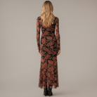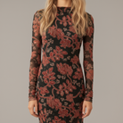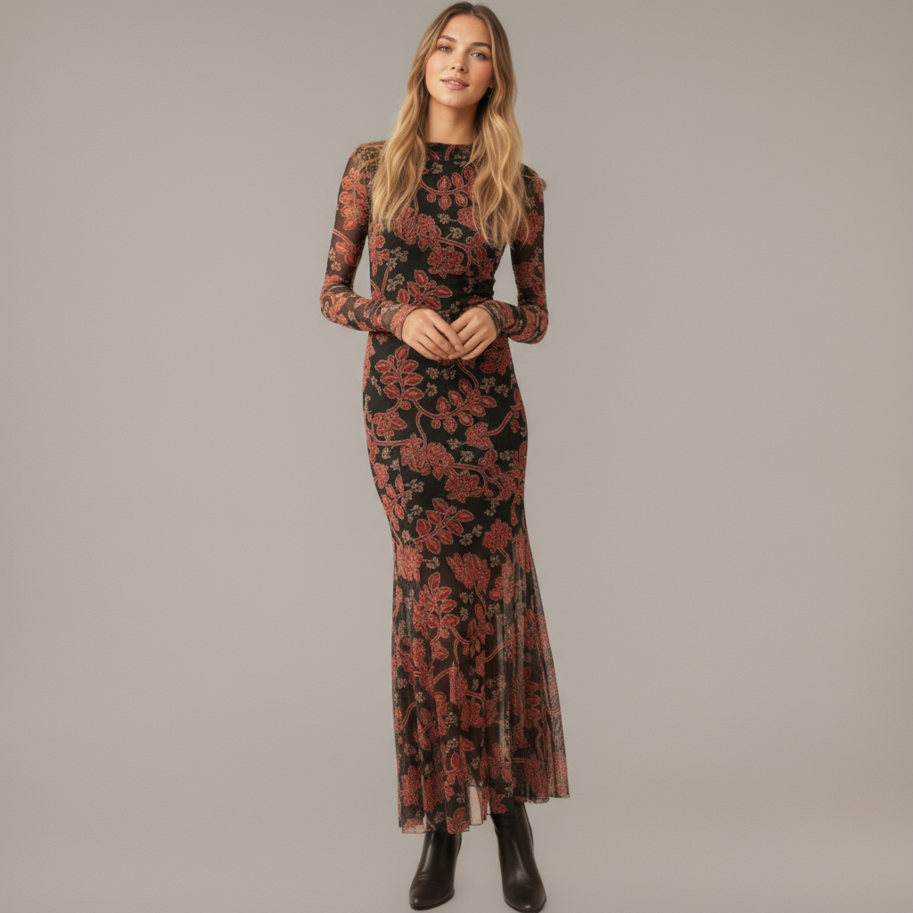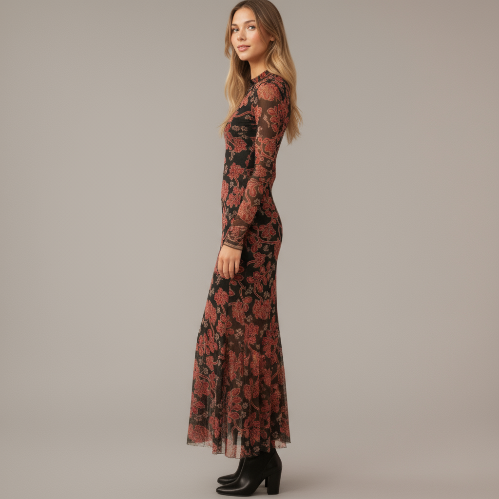 An ornate floral-print mesh maxi dress that combines modern detail with feminine allure. Designed with a mock neckline and long sleeves featuring thumbhole cuffs, this style is finished with delicate lettuce edges at the cuffs and hem. A back keyhole with button closure adds ease, while the fitted silhouette skims the body over a sleeveless thigh-length lining for confident coverage.