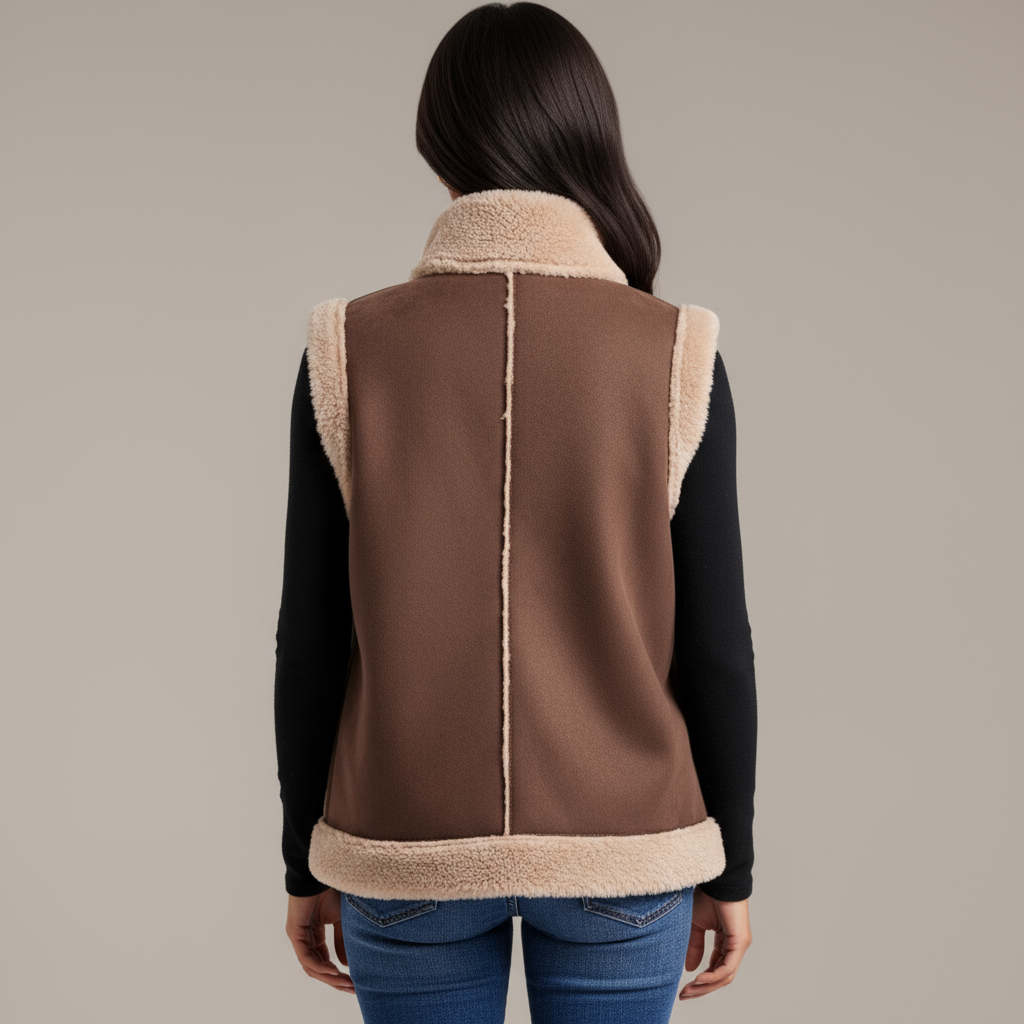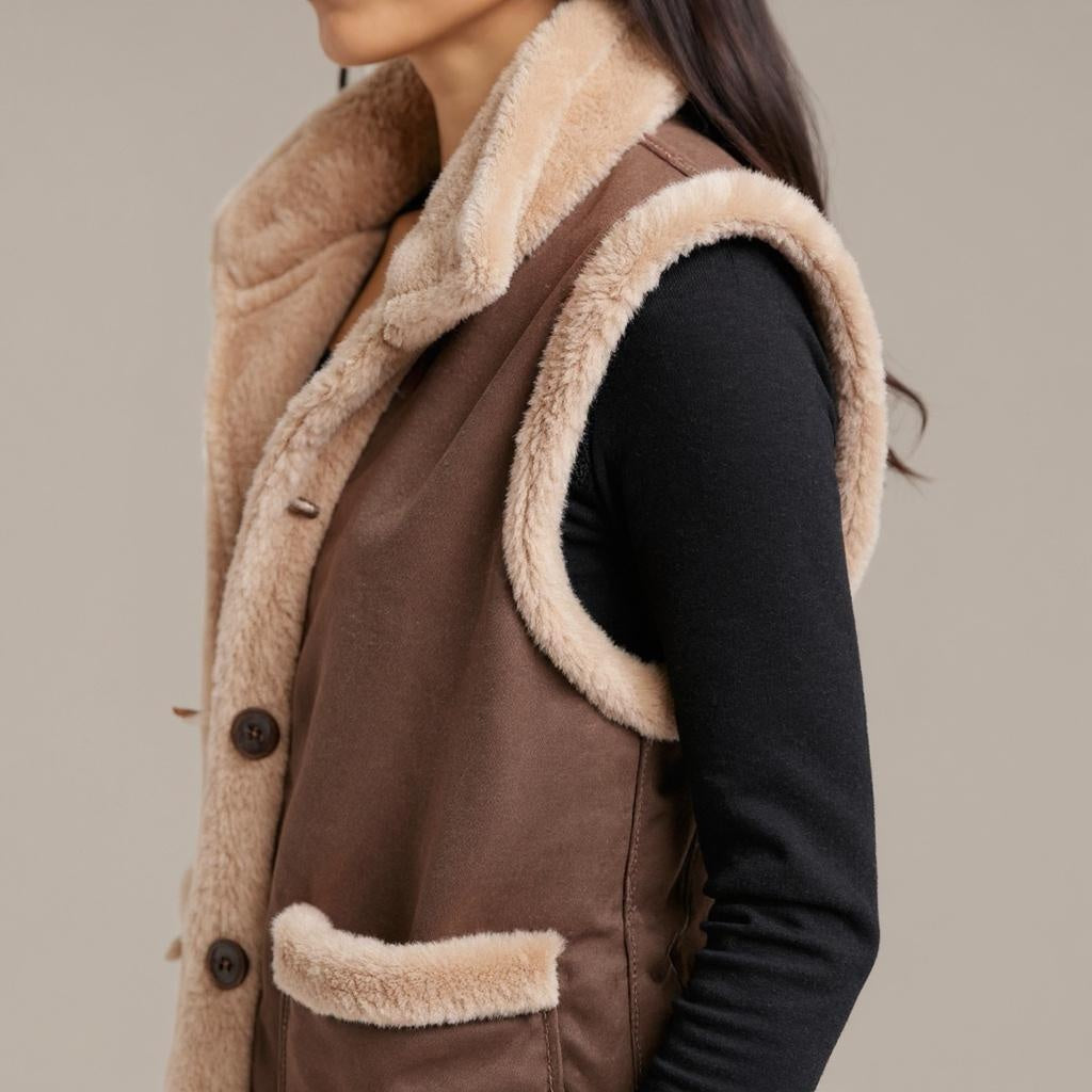 This faux shearling trim vest offers a cozy yet polished touch to your seasonal wardrobe. Designed with a stand collar, button-front closure, and soft faux shearling lining, it delivers both warmth and style. Patch pockets add functional charm, while the tailored fit makes it ideal for layering over sweaters or tees for an effortlessly chic look.