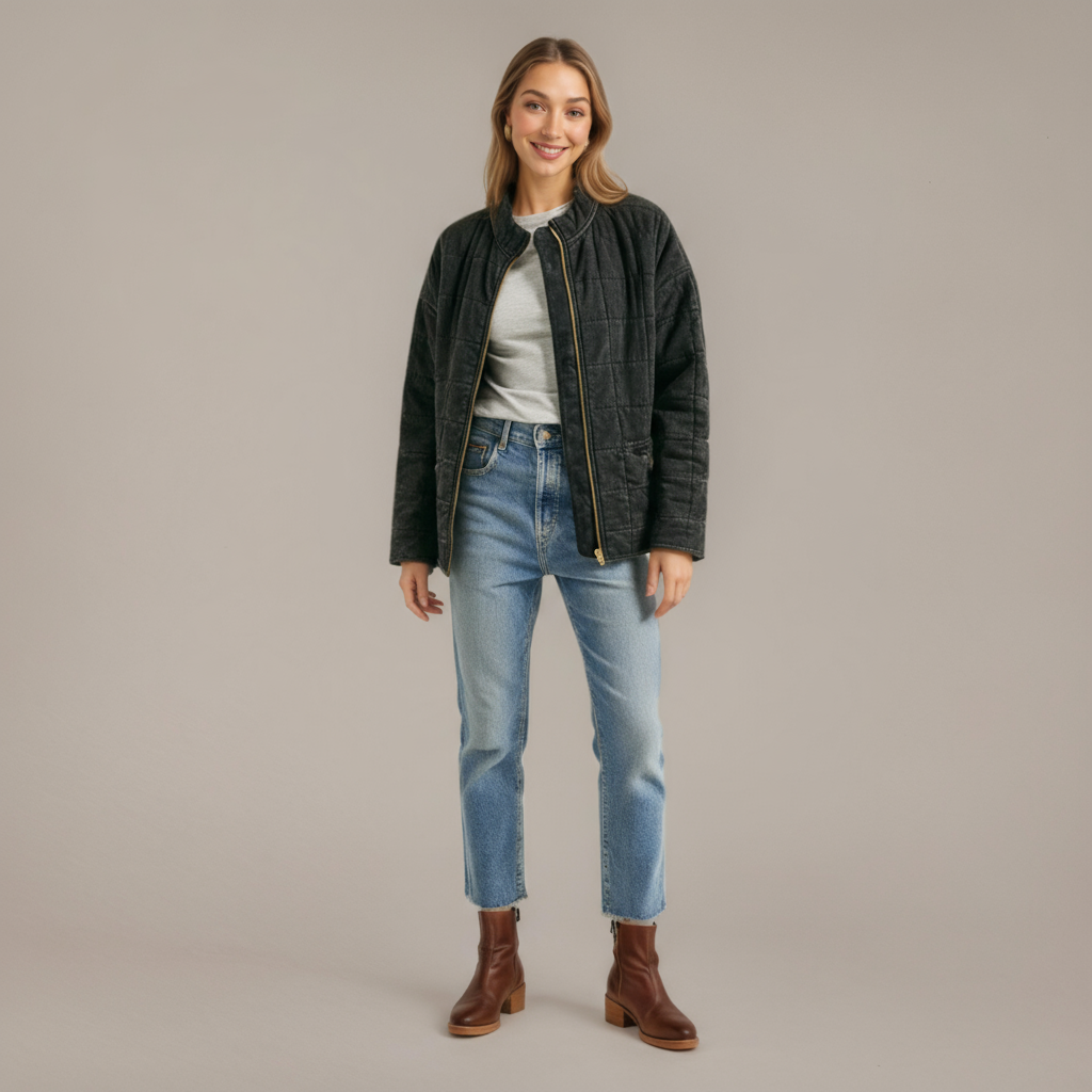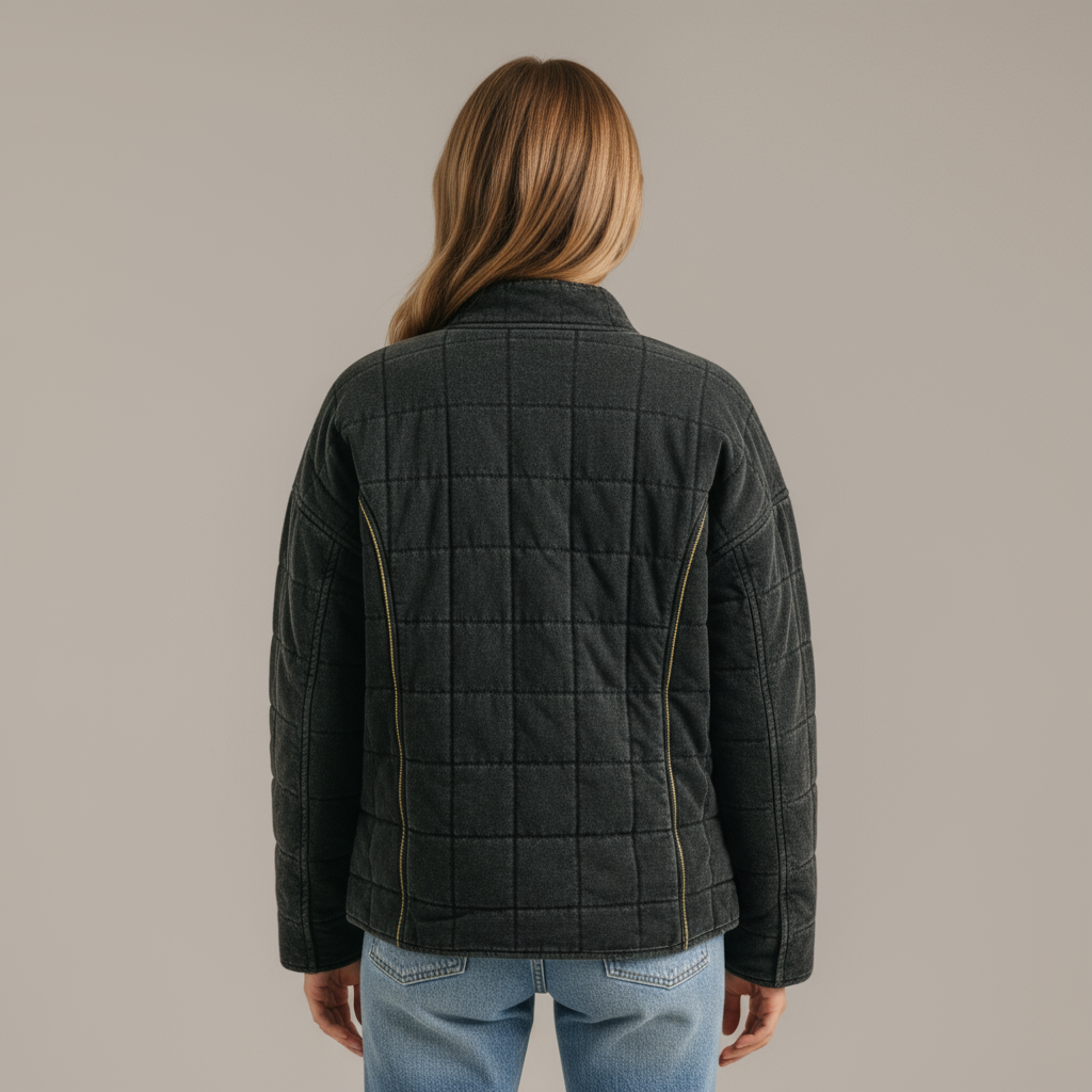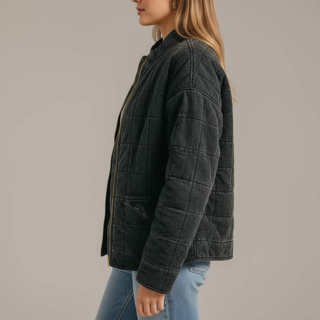 This cozy quilted jacket is crafted from ultra-soft fleece and finished with structured square stitching for a modern, utility-inspired look. Designed with a stand collar, full zip front, and drop shoulders, it offers both comfort and a clean silhouette. Side pockets add function while maintaining the streamlined shape. Ideal for layering on brisk days, this jacket blends practical warmth with elevated everyday style.