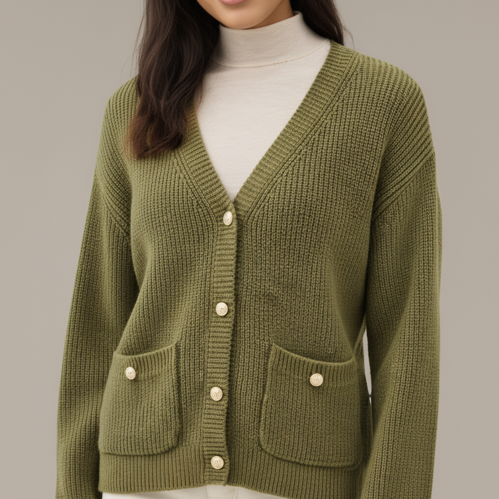 This ribbed knit cardigan is designed in a boxy fit with drop shoulders for a relaxed, modern feel. Featuring a flattering V-neckline, gold-tone button closure, and practical front pockets, it’s the perfect layering piece for cooler days. Crafted with a soft, cozy texture, this fall-to-winter essential offers effortless style and comfort for any casual or polished look.
