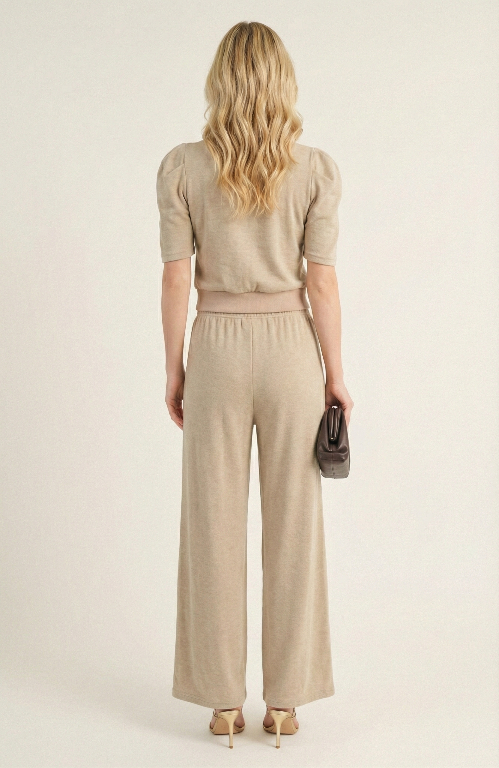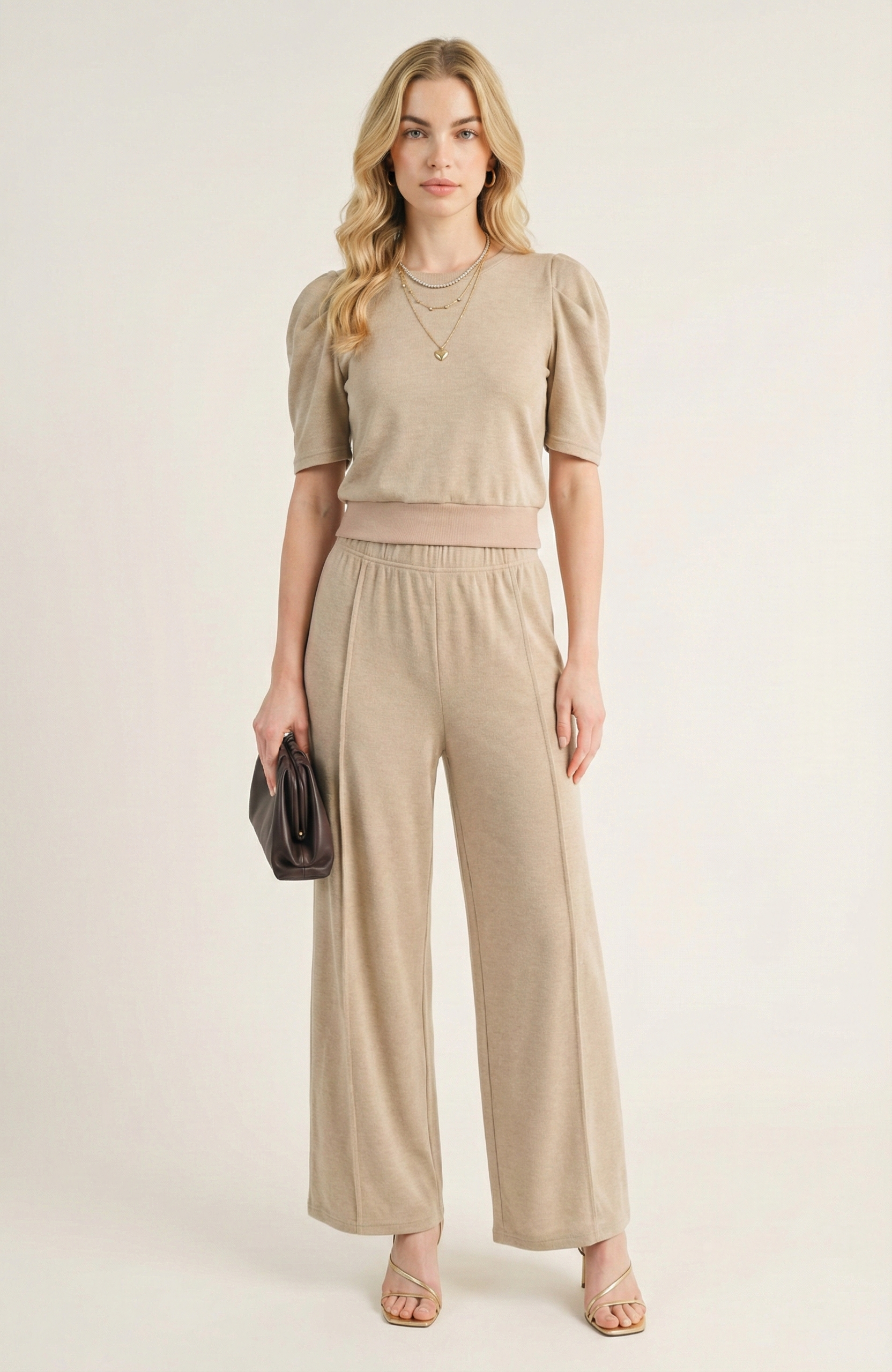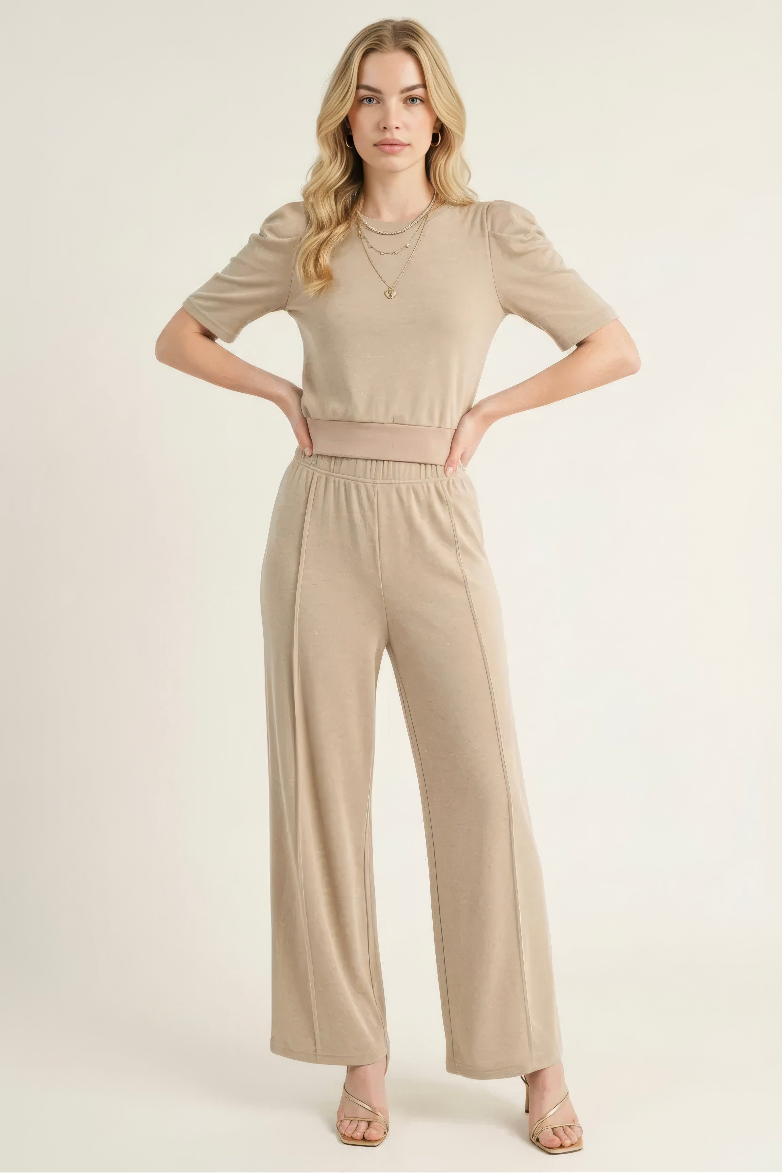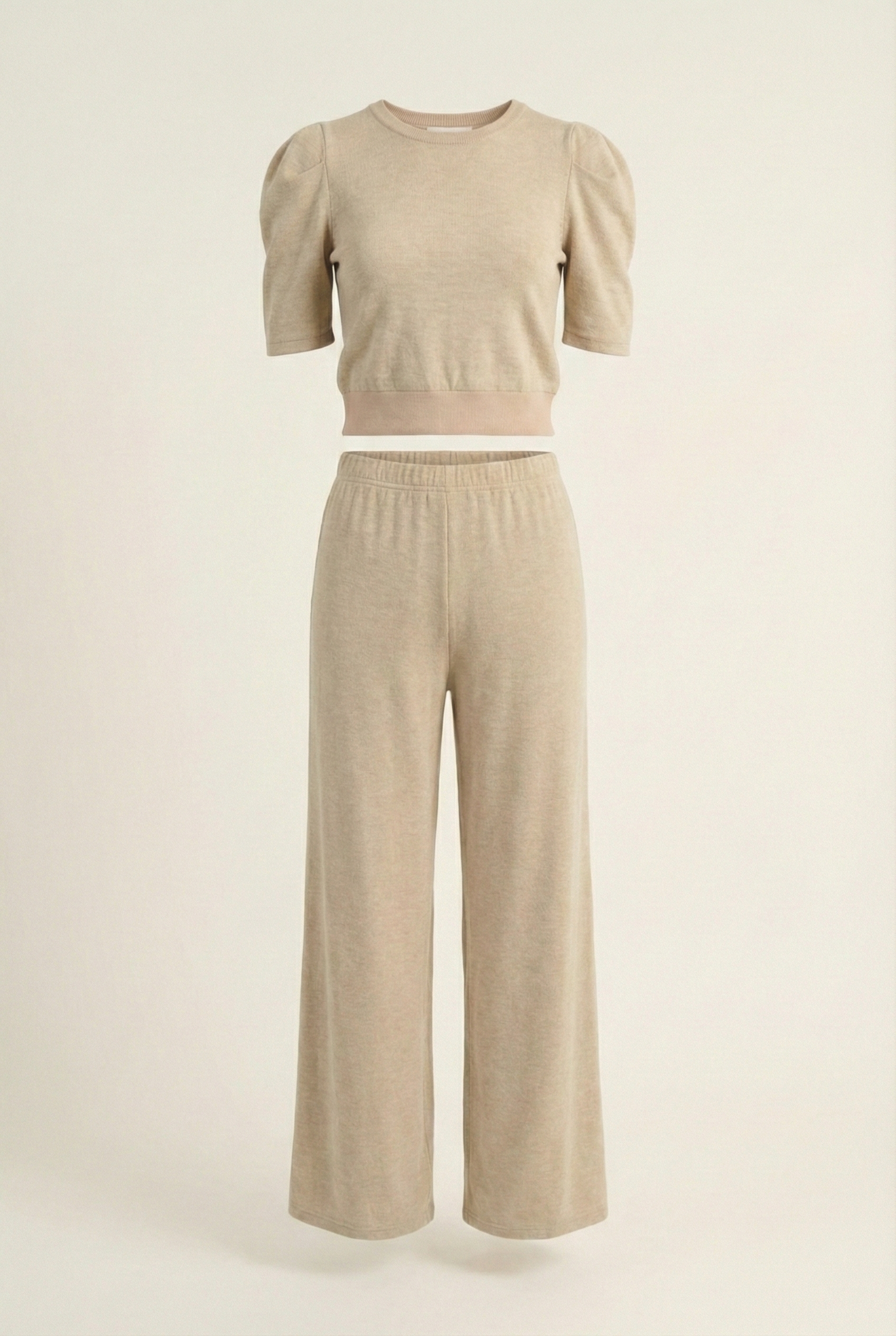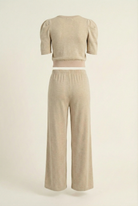 This knit set blends polished comfort with modern design, featuring a puff sleeve top paired with wide leg pants for a relaxed yet refined silhouette. The fitted waistband of the top and elastic stretch waist on the pants create balance and ease of wear. Soft knit fabric ensures breathability and comfort, while functional pockets add practicality. A versatile set that transitions seamlessly from lounging to casual outings.