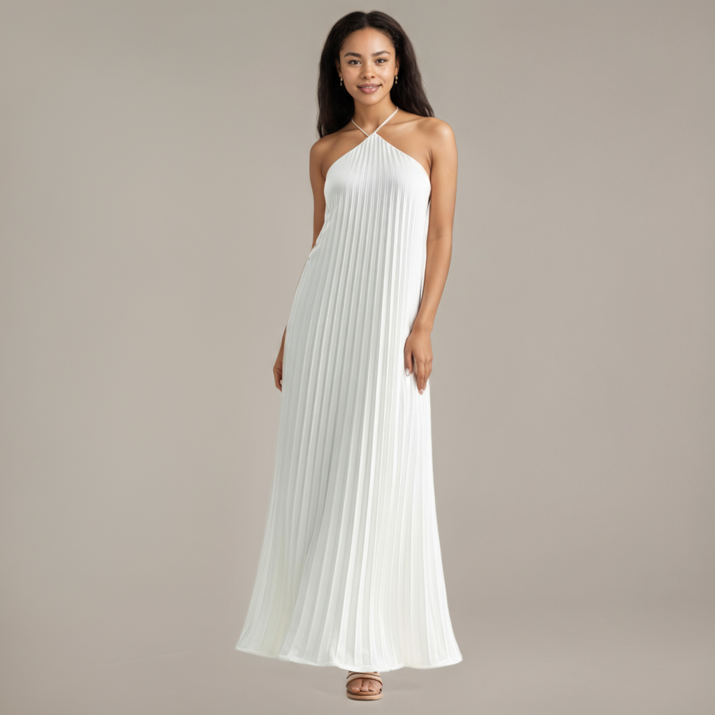 This elegant maxi dress features a beautifully pleated skirt, delicate crisscross straps, and a dramatic low back. The flowy silhouette and refined detailing make it perfect for formal occasions, evening events, or destination weddings.