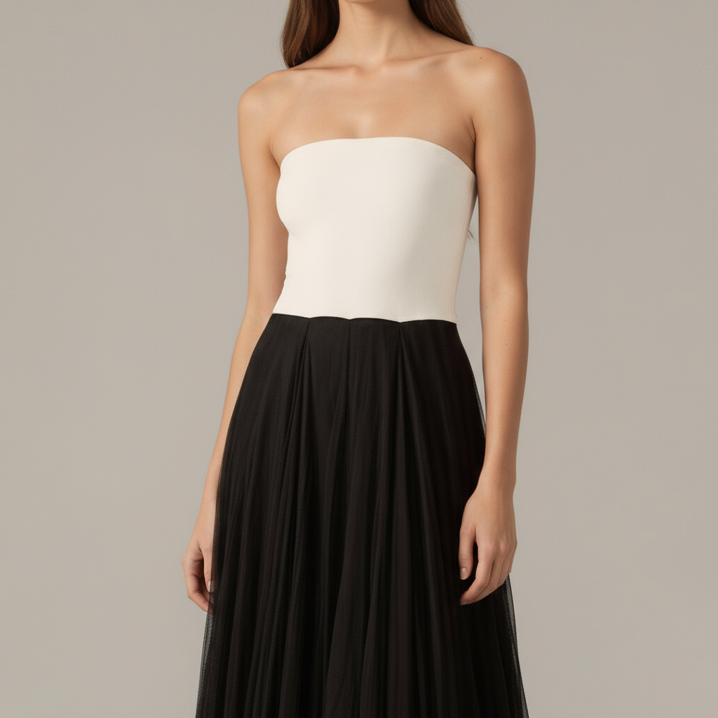 This elegant strapless gown features a sleek, fitted bodice in a contrasting tone that creates a striking silhouette. The floor-length skirt cascades in layers of soft, sheer tulle, adding graceful movement and drama with every step. Perfect for formal events or black-tie occasions, this gown offers a timeless yet modern appeal. Designed in a full-length maxi style that reaches the floor for an ultra-sophisticated look.