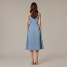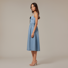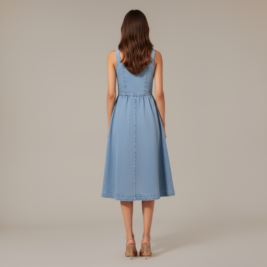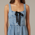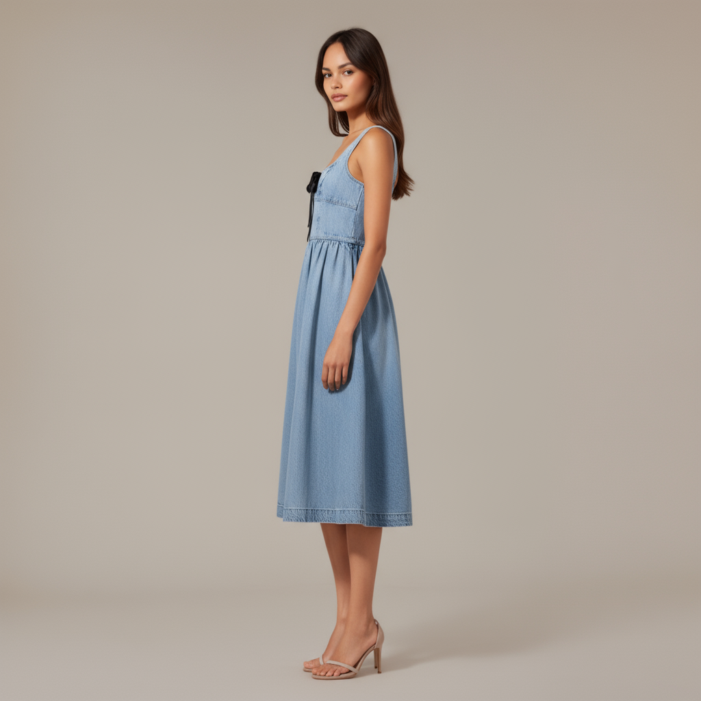 Crafted from soft, lightweight denim, this midi dress blends casual ease with feminine charm. The square neckline frames the face beautifully, while a contrasting front bow detail adds a playful, elevated touch. A gently gathered waist enhances the A-line silhouette, creating a flattering fit that moves effortlessly. Finished with a button-front design and a midi hemline, this versatile piece transitions seamlessly from day to night.