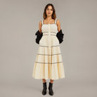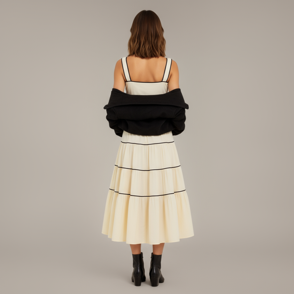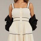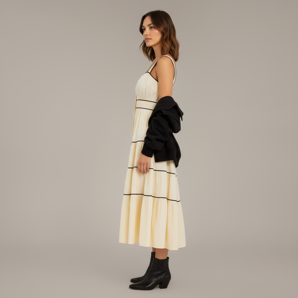 This strappy maxi dress features delicate shoulder straps, a fitted bodice, and a flowing tiered skirt accented by contrasting horizontal trim lines. Its relaxed yet elegant design makes it perfect for warm-weather occasions.