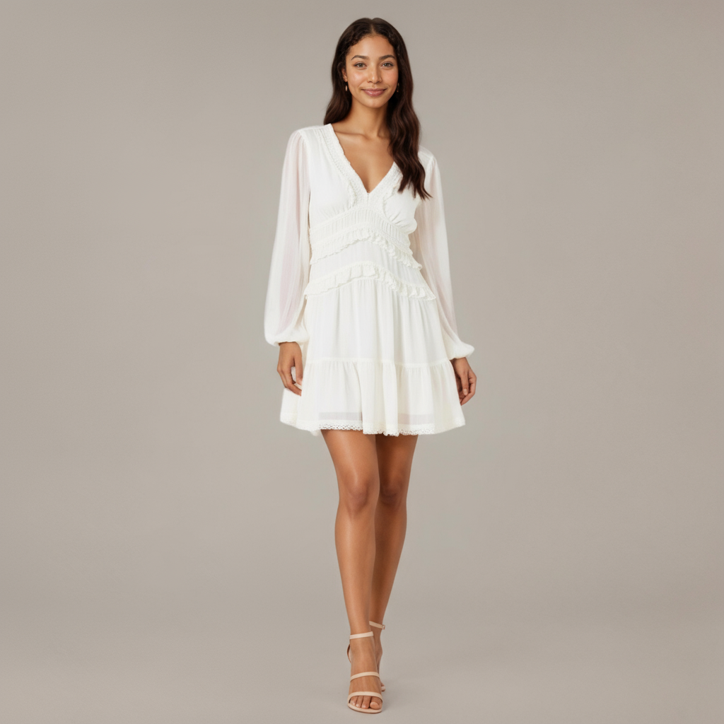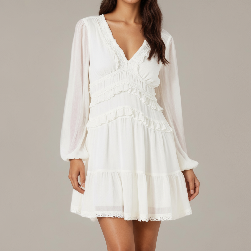 Romantic and feminine, this long sleeve mini dress features delicate chiffon layers and soft ruffle detailing for an ethereal finish. A deep V-neckline and defined waist create a flattering silhouette, while sheer sleeves and a tiered skirt add soft movement. Finished with lace trim along the hem, this piece transitions effortlessly from daytime to special occasions.