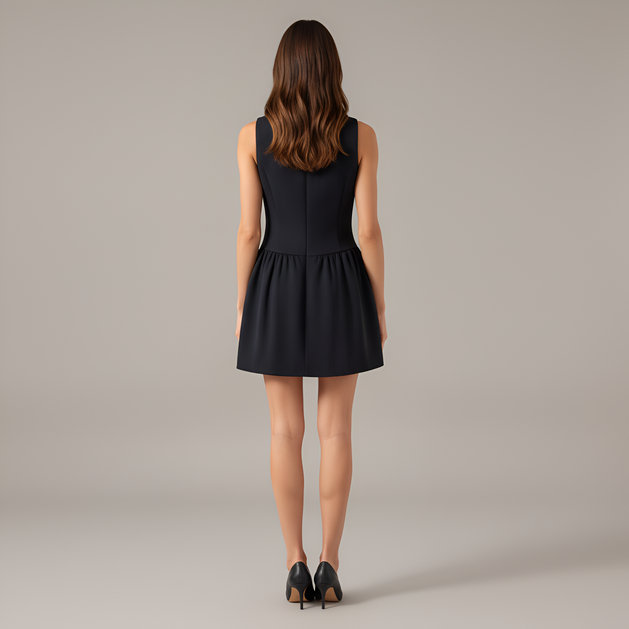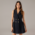 This sleeveless blazer dress combines tailored sophistication with feminine charm. Featuring a double-breasted design with gold-tone buttons and notched lapels, it offers a polished and modern look. The fitted bodice transitions into a flared hem, adding movement and a playful touch to this structured silhouette. Perfect for both work and evening events, this dress pairs beautifully with heels and statement accessories for a chic, confident outfit.