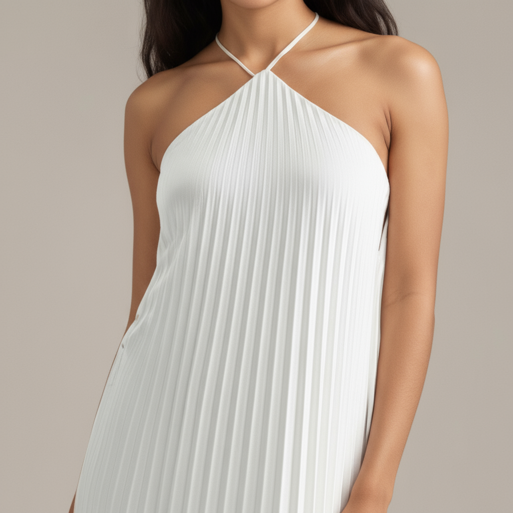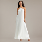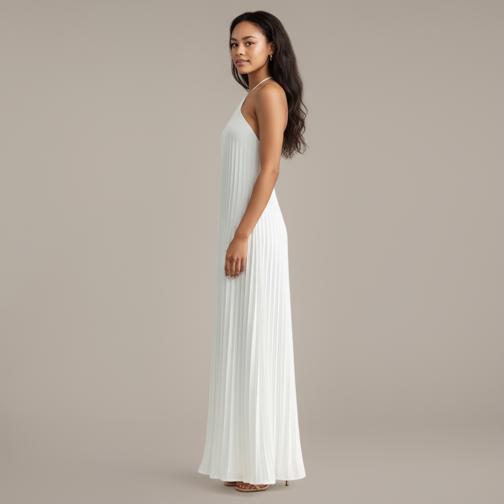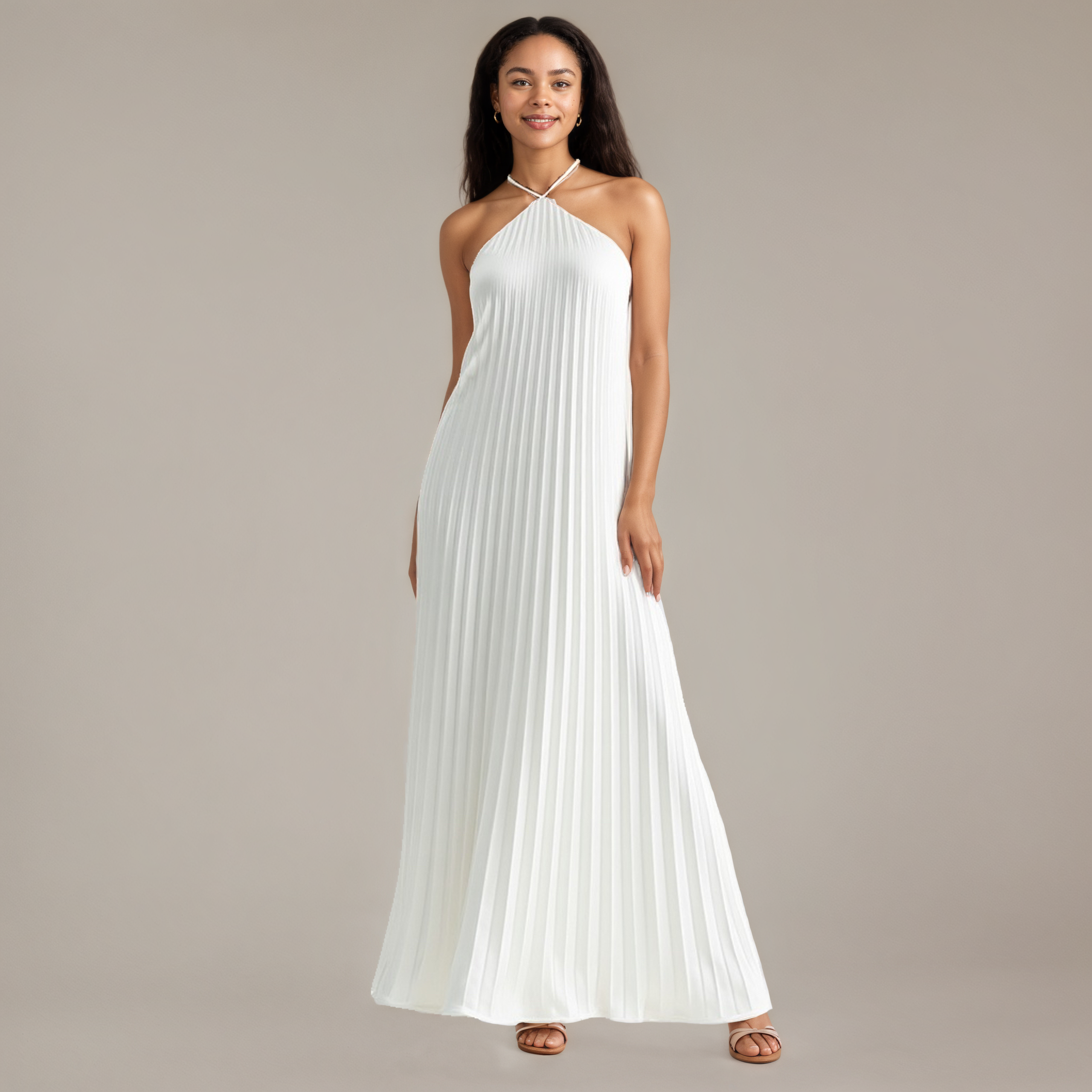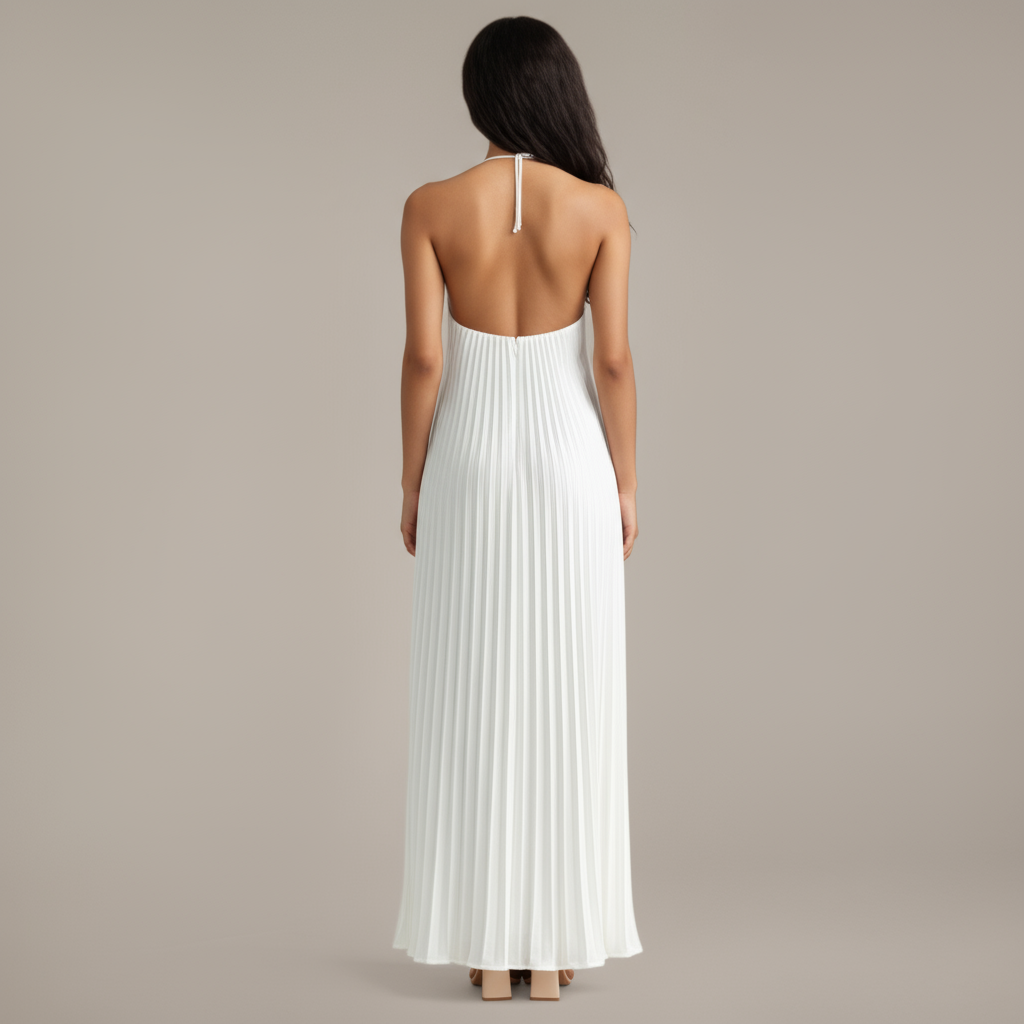 This elegant maxi dress features a beautifully pleated skirt, delicate crisscross straps, and a dramatic low back. The flowy silhouette and refined detailing make it perfect for formal occasions, evening events, or destination weddings.