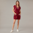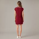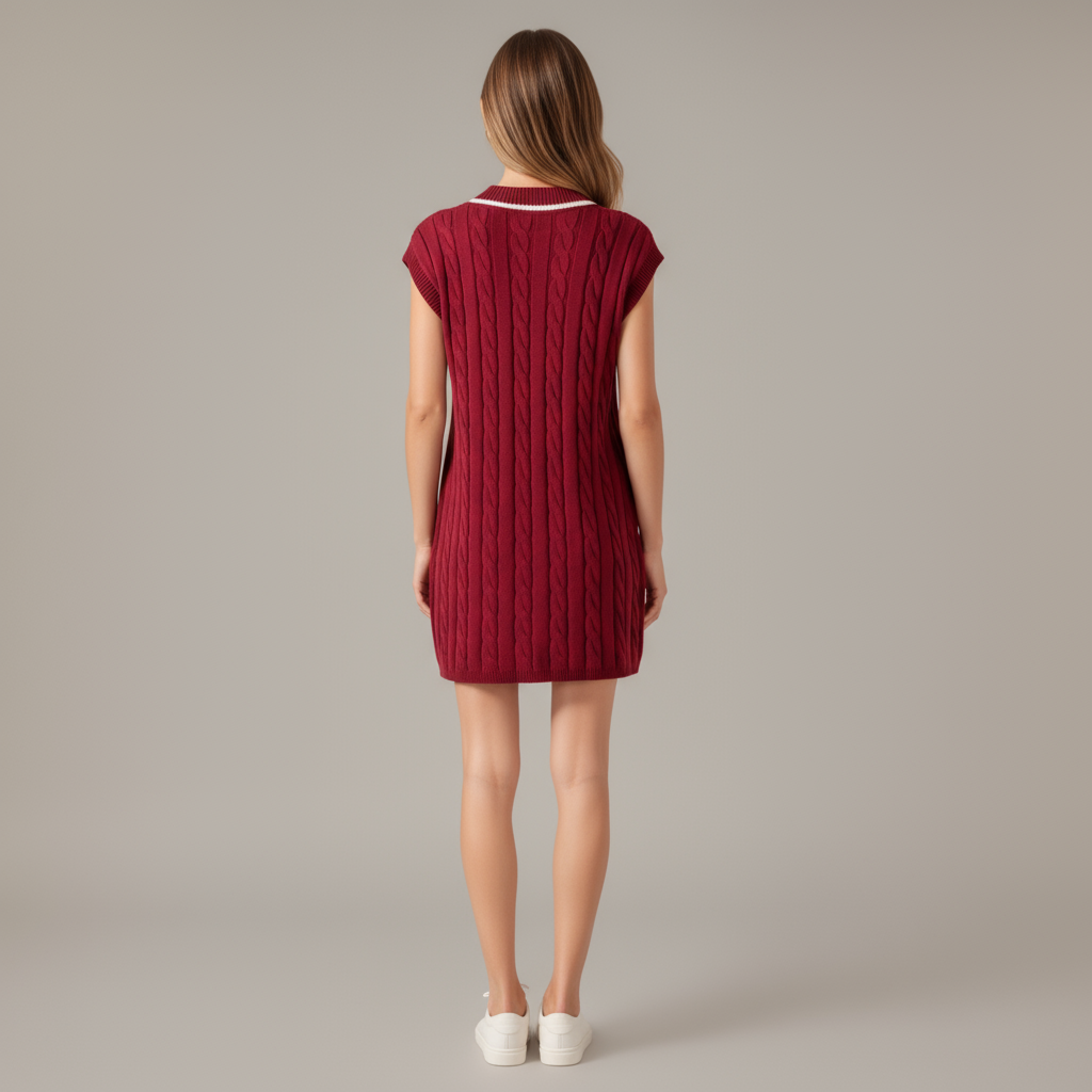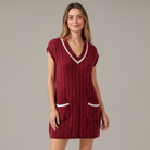 This cable knit sweater tank dress combines cozy texture with a preppy touch. Designed with a flattering V-neckline, it features crisp white contrast stripes along the neckline and pocket openings. Two functional front pockets add both charm and practicality, while the mini length offers a playful, modern silhouette. The sleeveless style makes it perfect for layering or wearing alone for a polished, effortless look.
