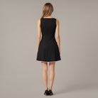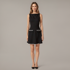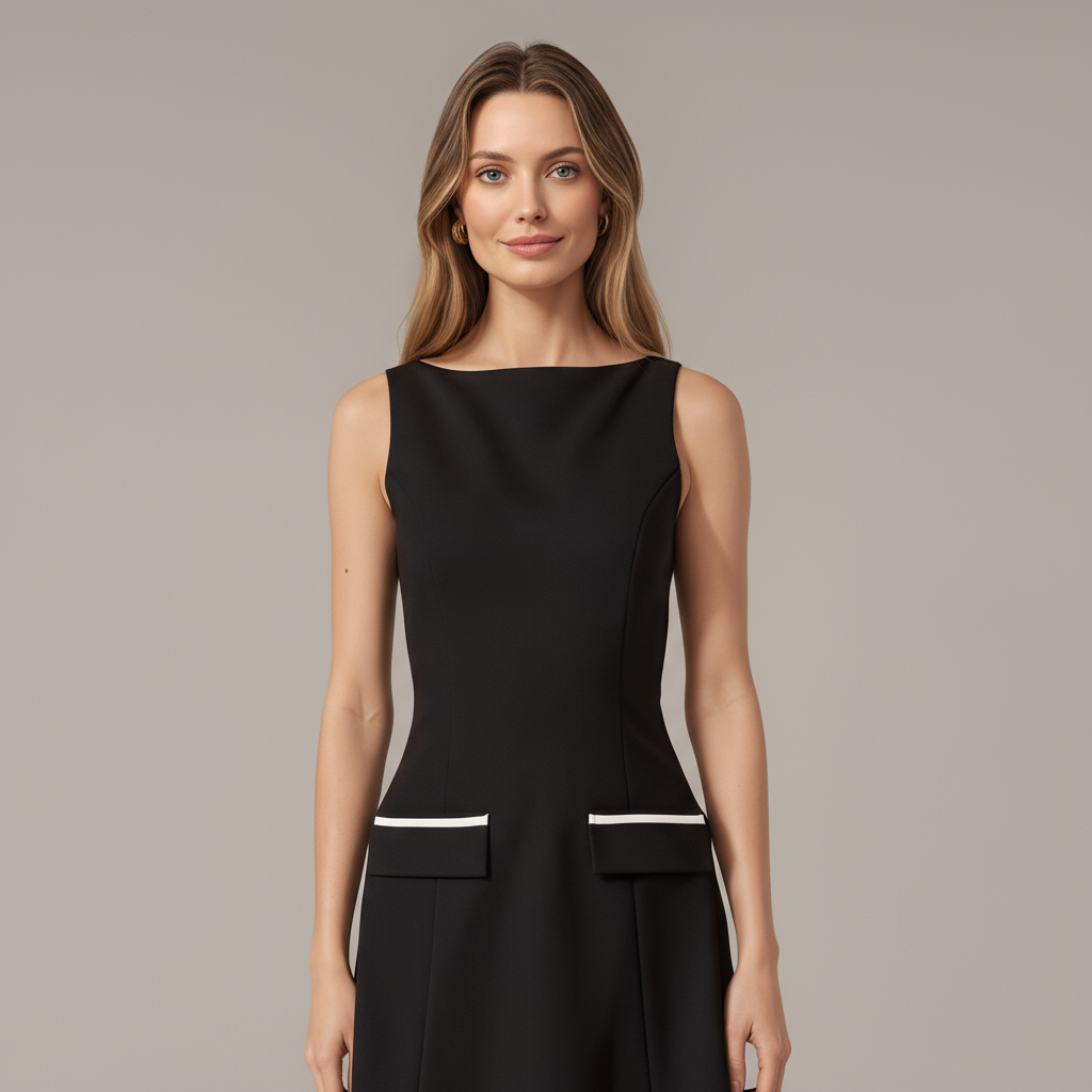 This tailored mini dress features a structured sleeveless silhouette with sleek contrast piping along the neckline, hem, and faux pocket flaps for a polished finish. The fitted bodice and subtle A-line skirt create a flattering shape, while the decorative flaps add a playful yet refined touch. Perfect for daytime events or elevated casual outings, this dress blends modern minimalism with timeless charm.