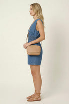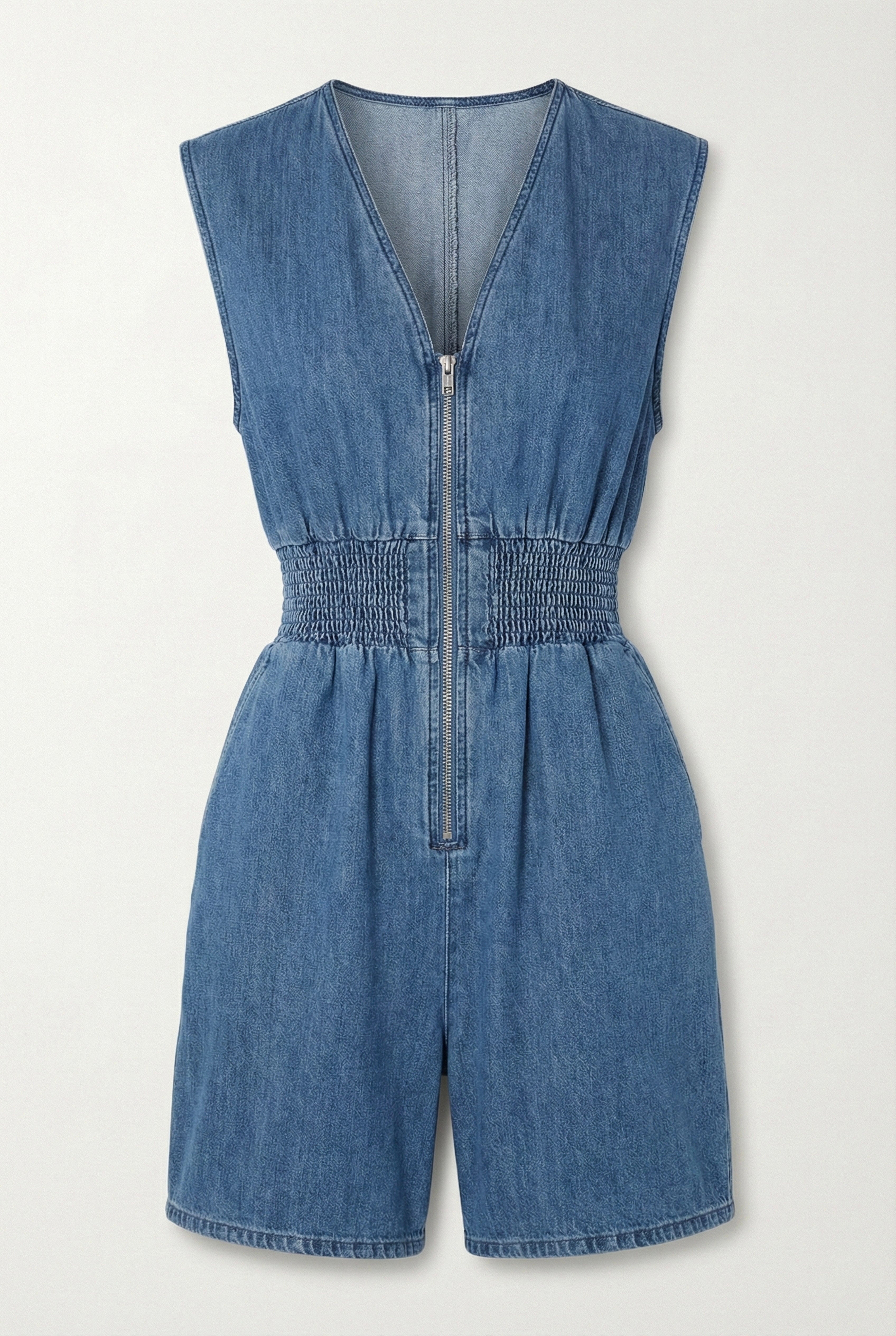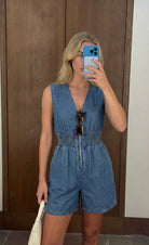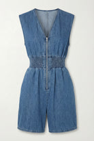 This stylish denim romper features structured cap sleeves, a flattering smocked waistband, and a full front zip closure for a modern touch. The relaxed shorts and defined waist create a balanced silhouette that’s both comfortable and chic.