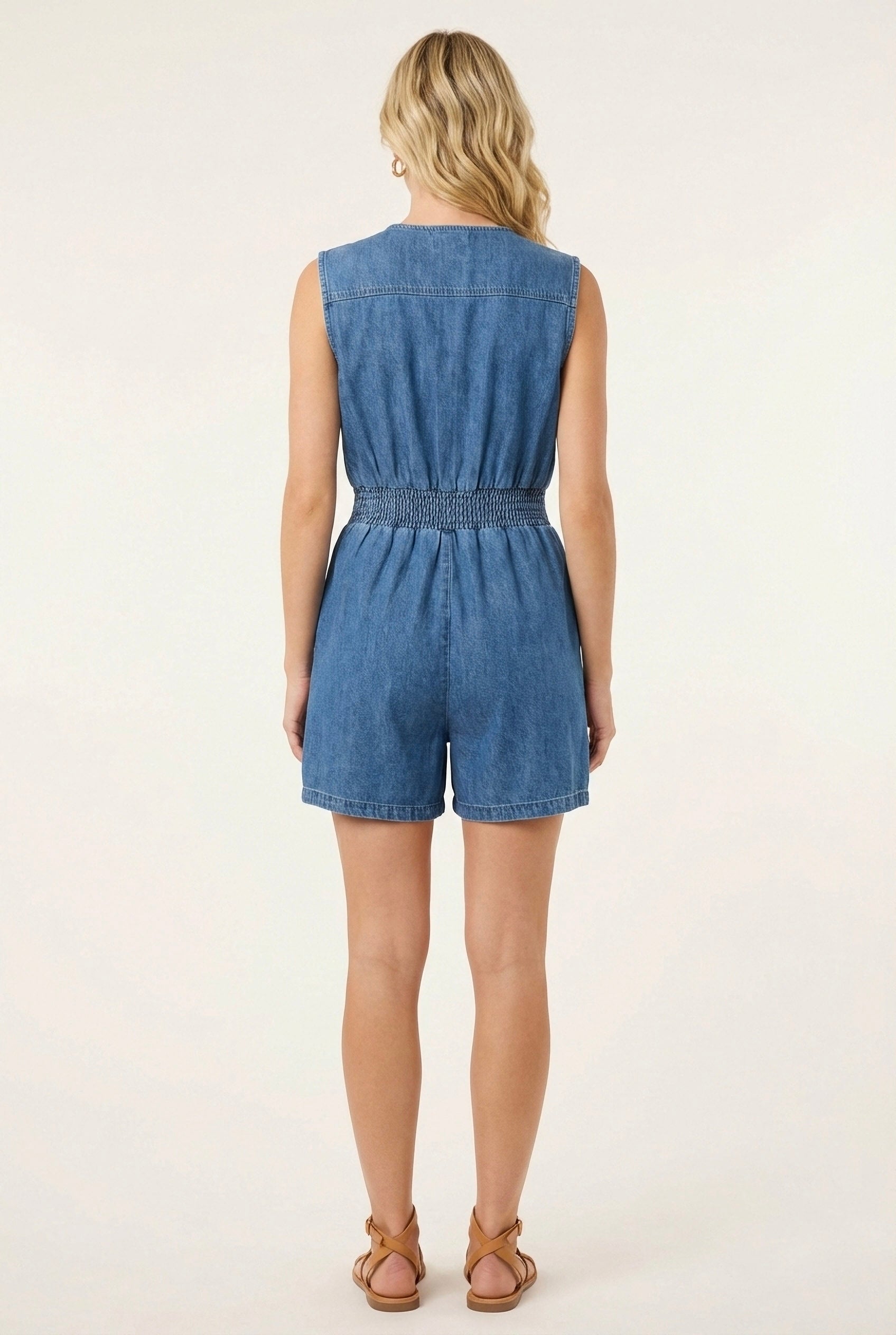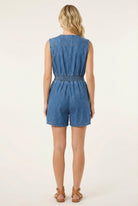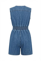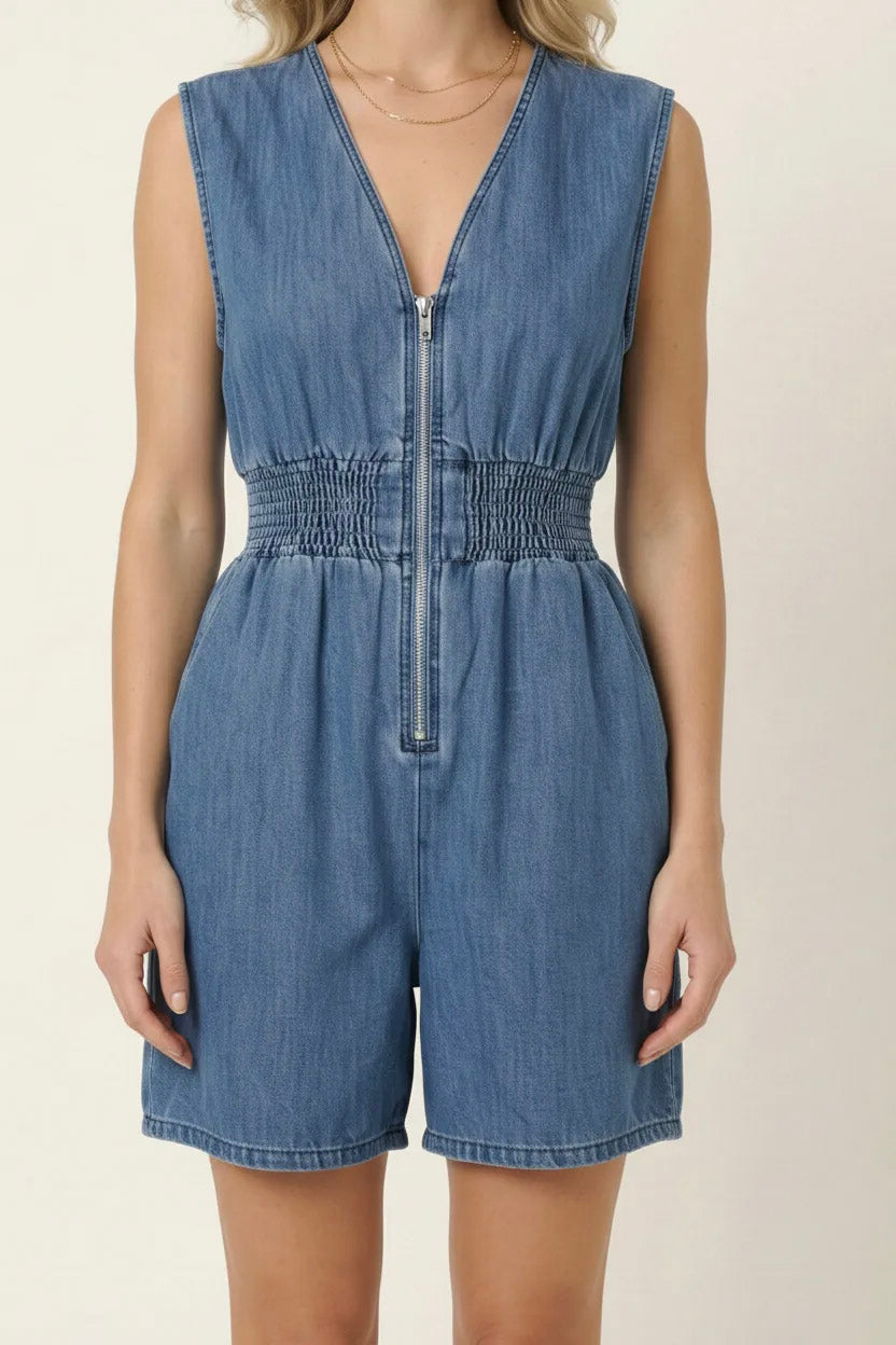 Denim Romper with Cap Sleeves Smocked Waist and Front Zip Closure (NEW)