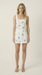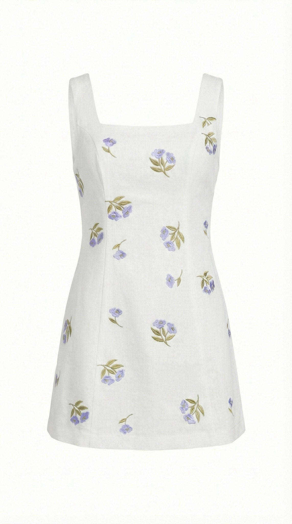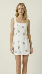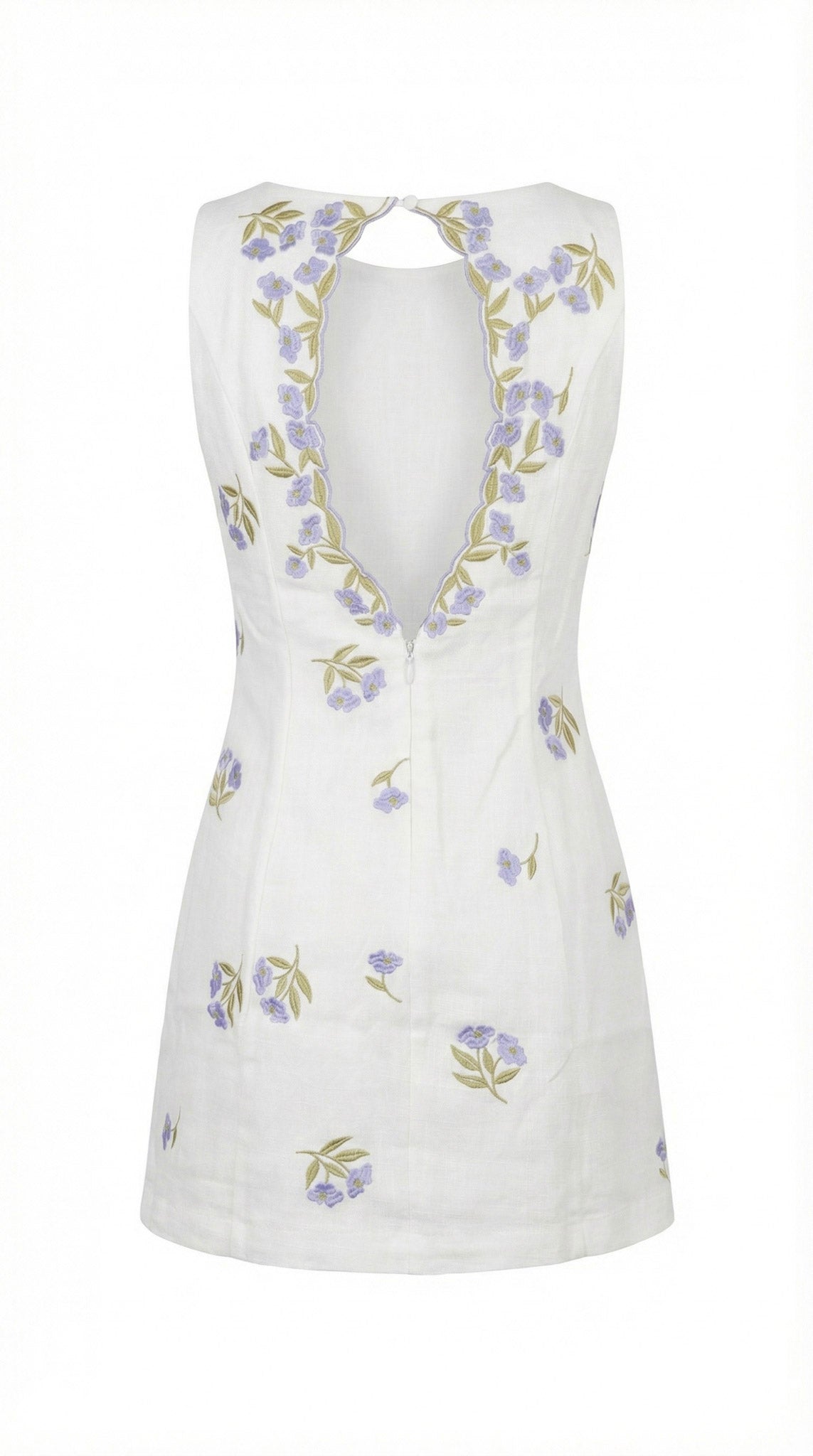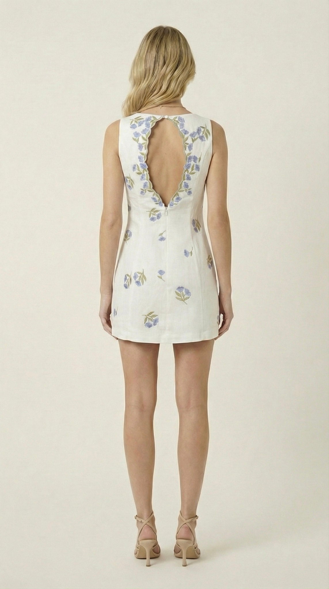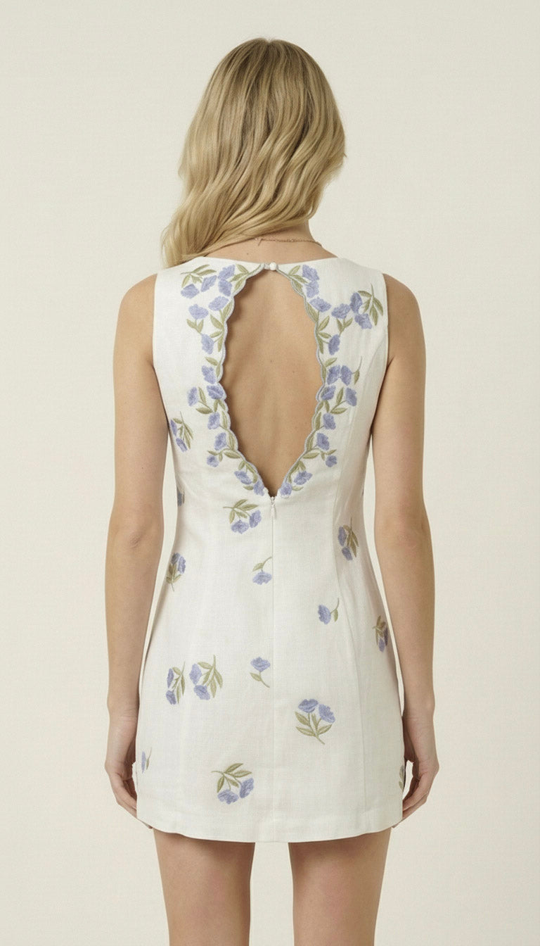 This sleeveless mini dress features delicate floral embroidery scattered across a softly structured silhouette. The square neckline offers a clean, modern frame, while the fitted bodice enhances the natural shape. A dramatic open back is accented with scalloped embroidered trim, creating an elegant focal point from every angle. Lightweight fabric and a streamlined cut make it perfect for warm-weather styling with heels or minimalist sandals.