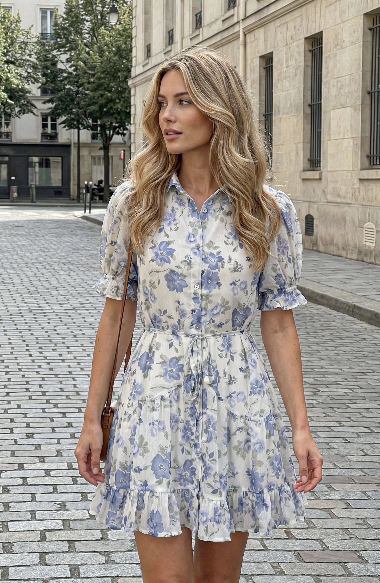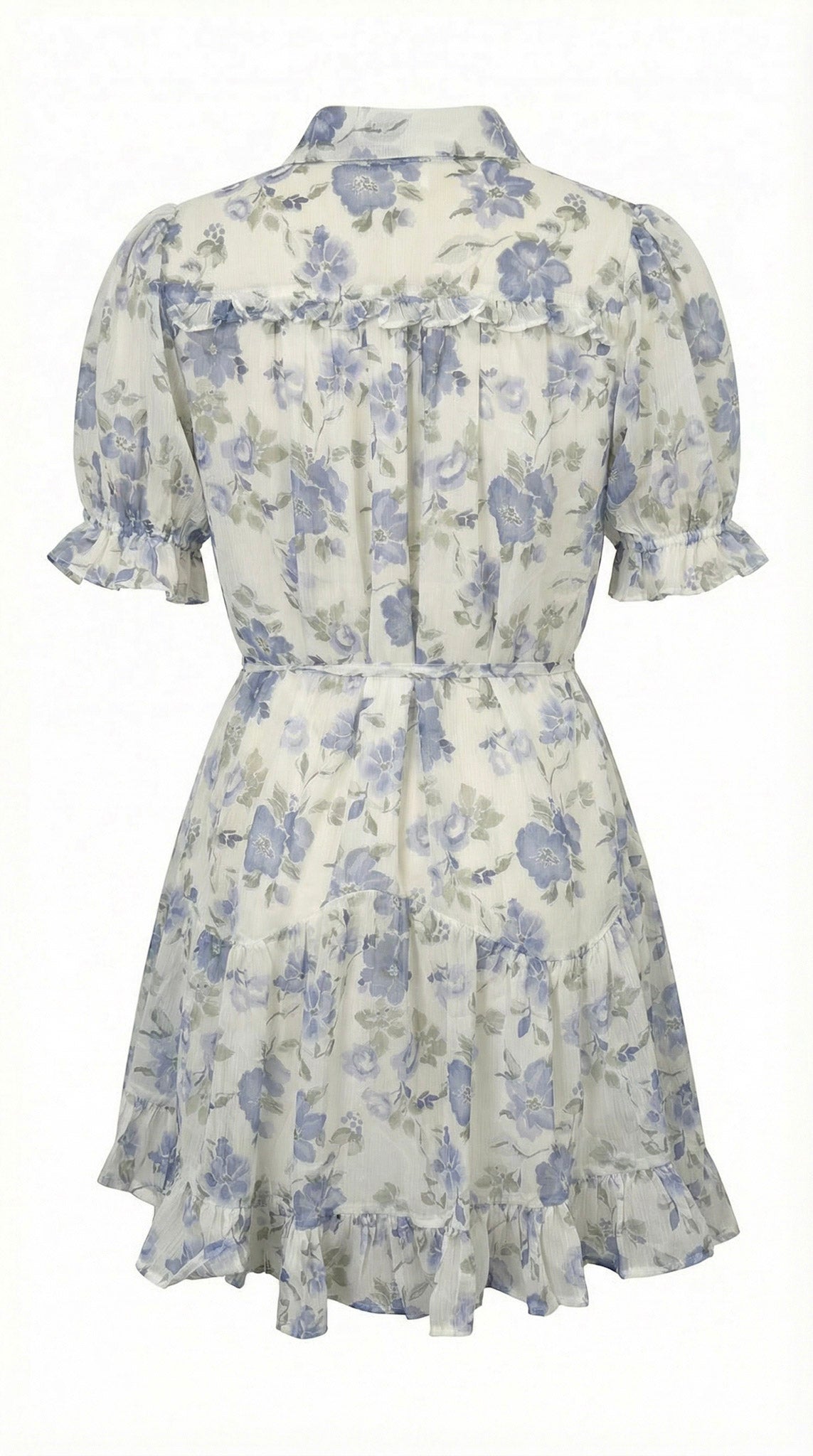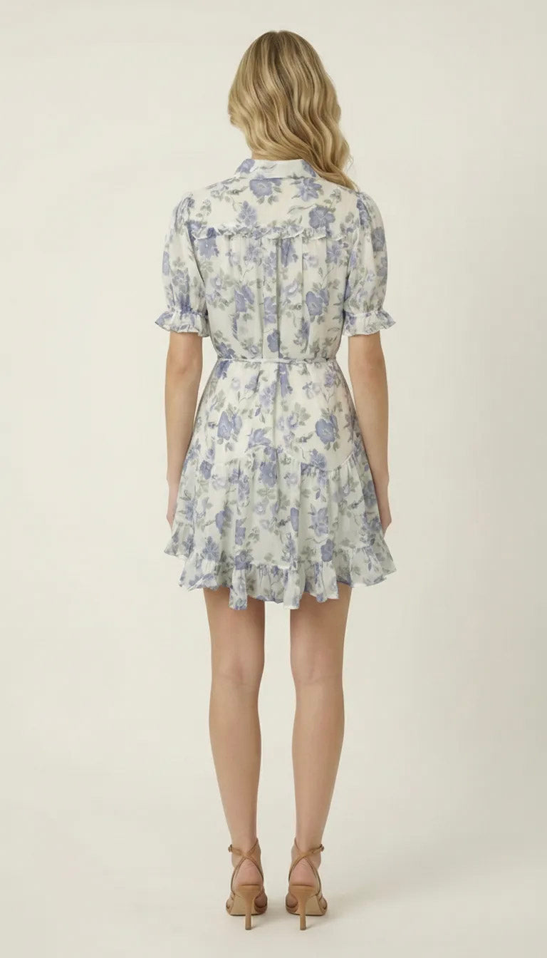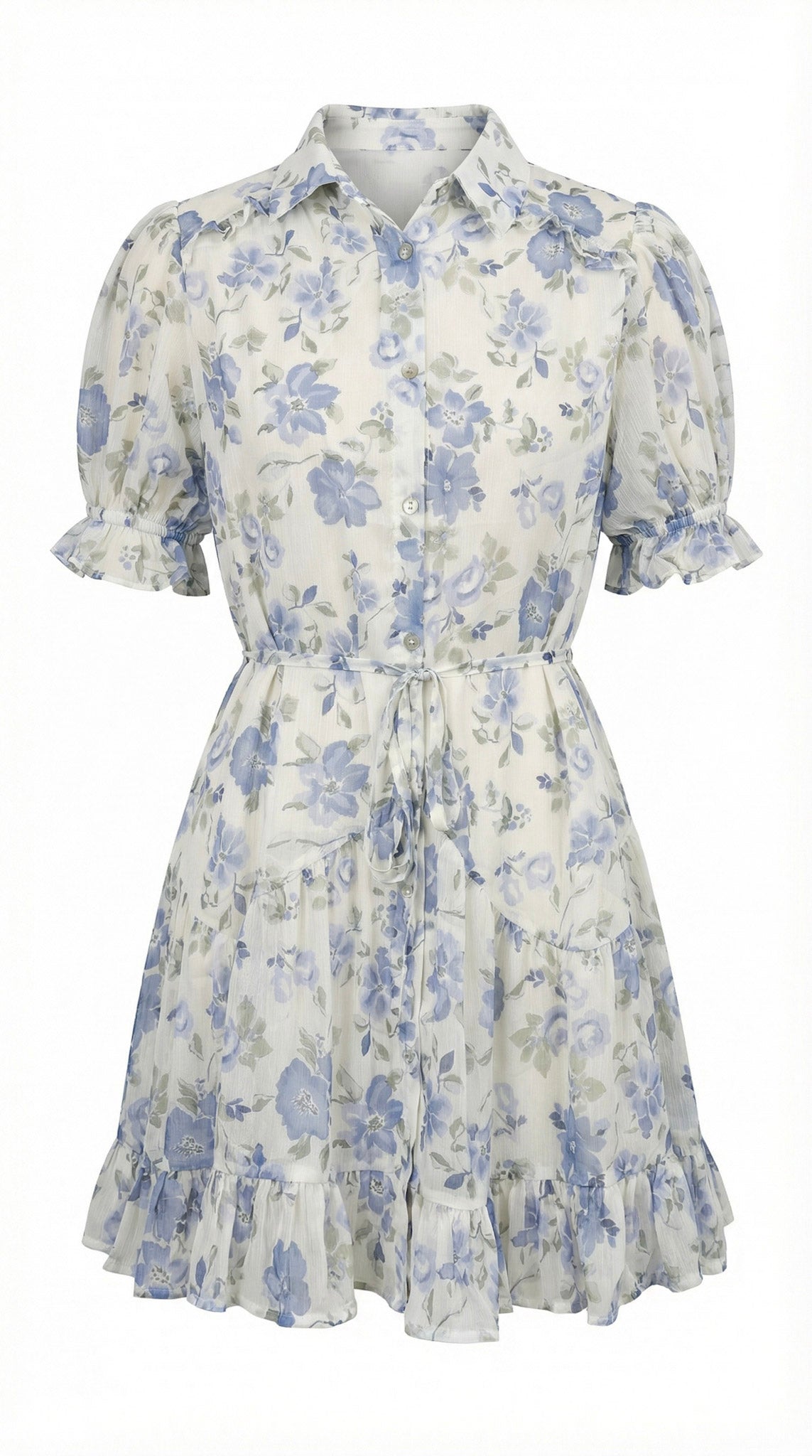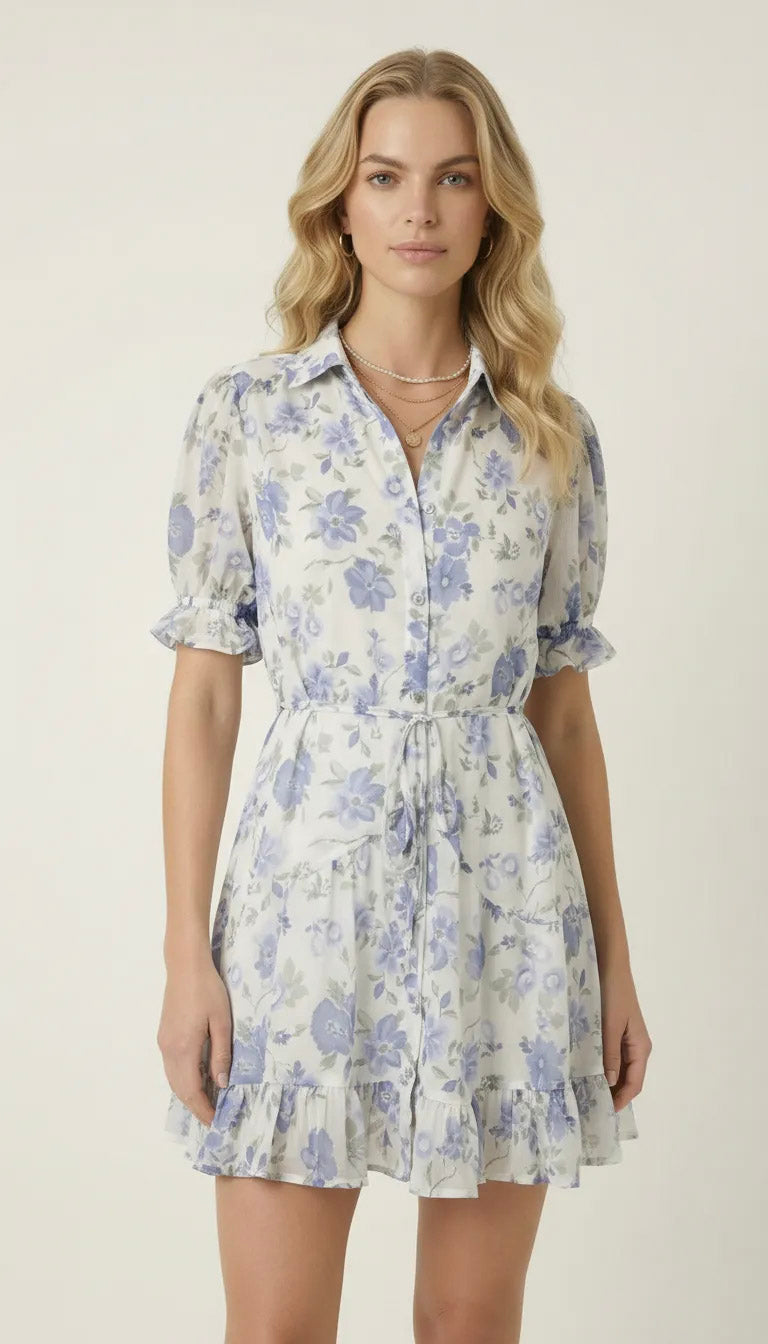 This lightweight shirt dress is crafted from airy woven fabric adorned with soft floral print for a romantic, refined feel. A classic collar and button front lend tailored structure, while short puff sleeves add subtle volume. The adjustable tie waist defines the silhouette before falling into a gently flared skirt with a ruffle hem. Style it with minimalist sandals for daytime polish or elevate it with heels and delicate jewelry for an effortlessly feminine look.