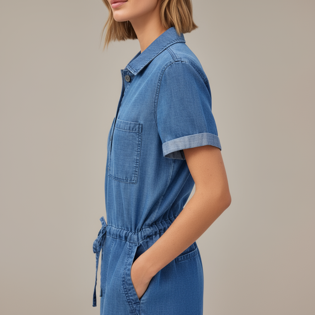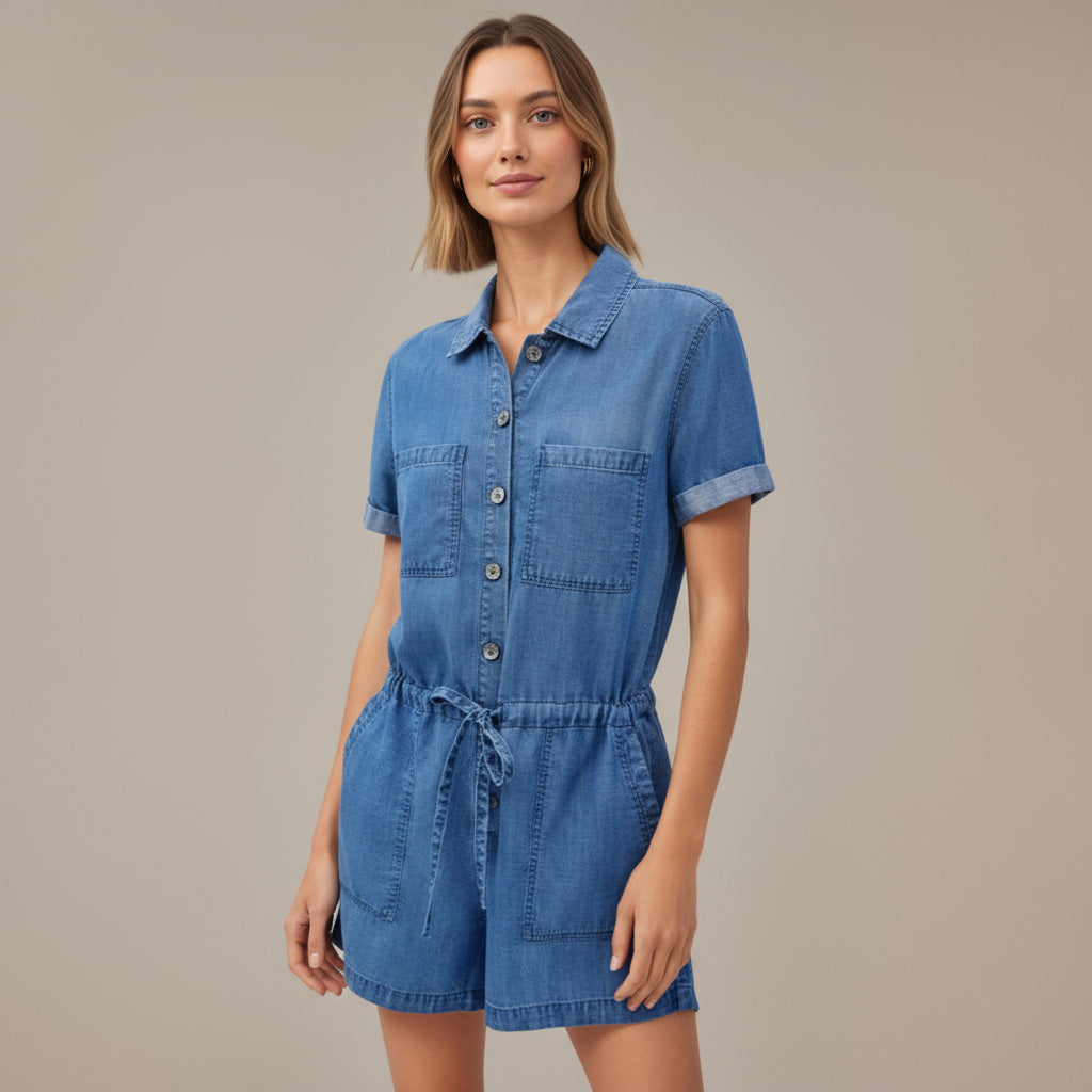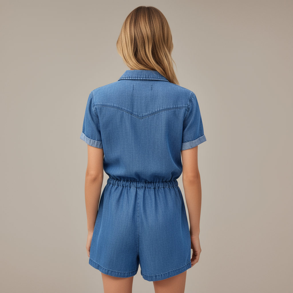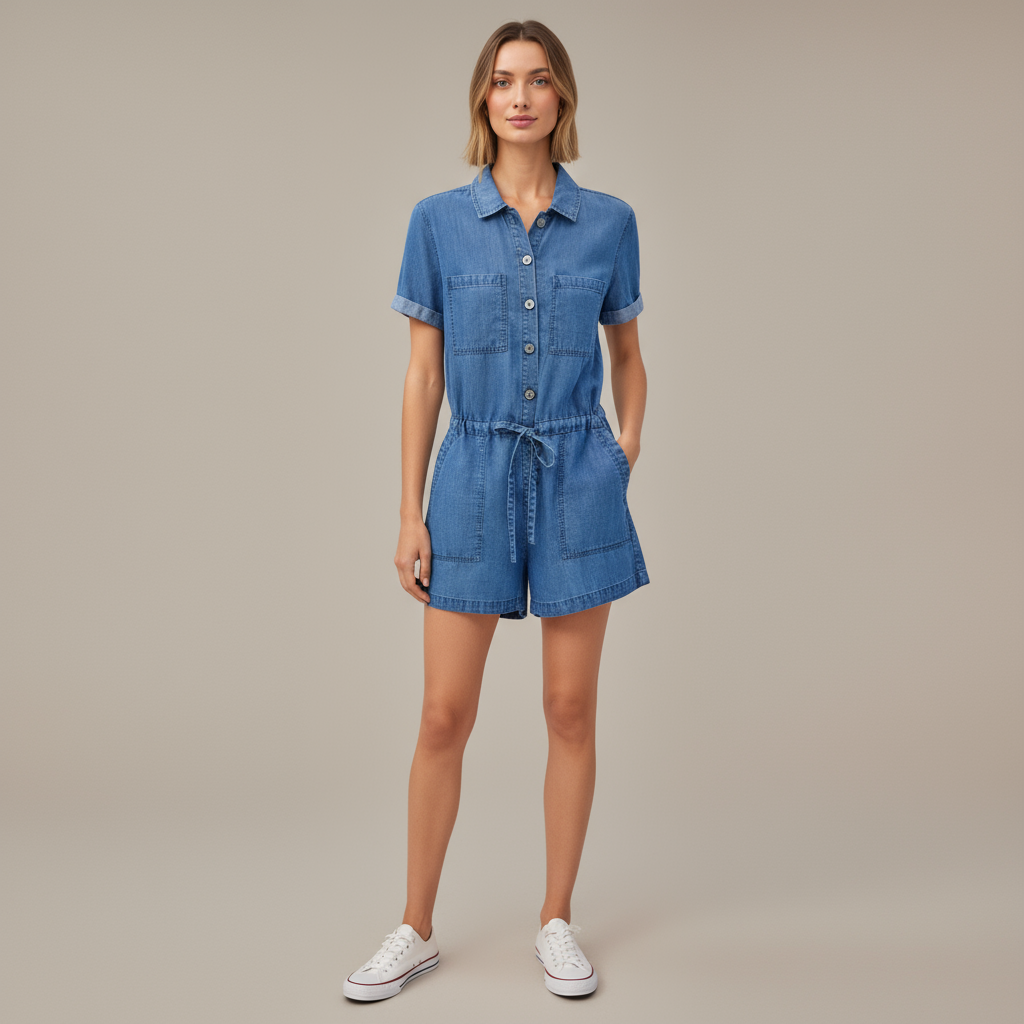 This utility-inspired denim romper combines style and ease with its button-up front, structured collar, and roll-cuff short sleeves. It features two chest patch pockets and two side pockets for a functional yet fashionable look. The adjustable drawstring waist flatters the figure, while the relaxed fit keeps you comfortable for all-day wear. Perfect for casual days, weekend errands, or a laid-back outing.