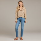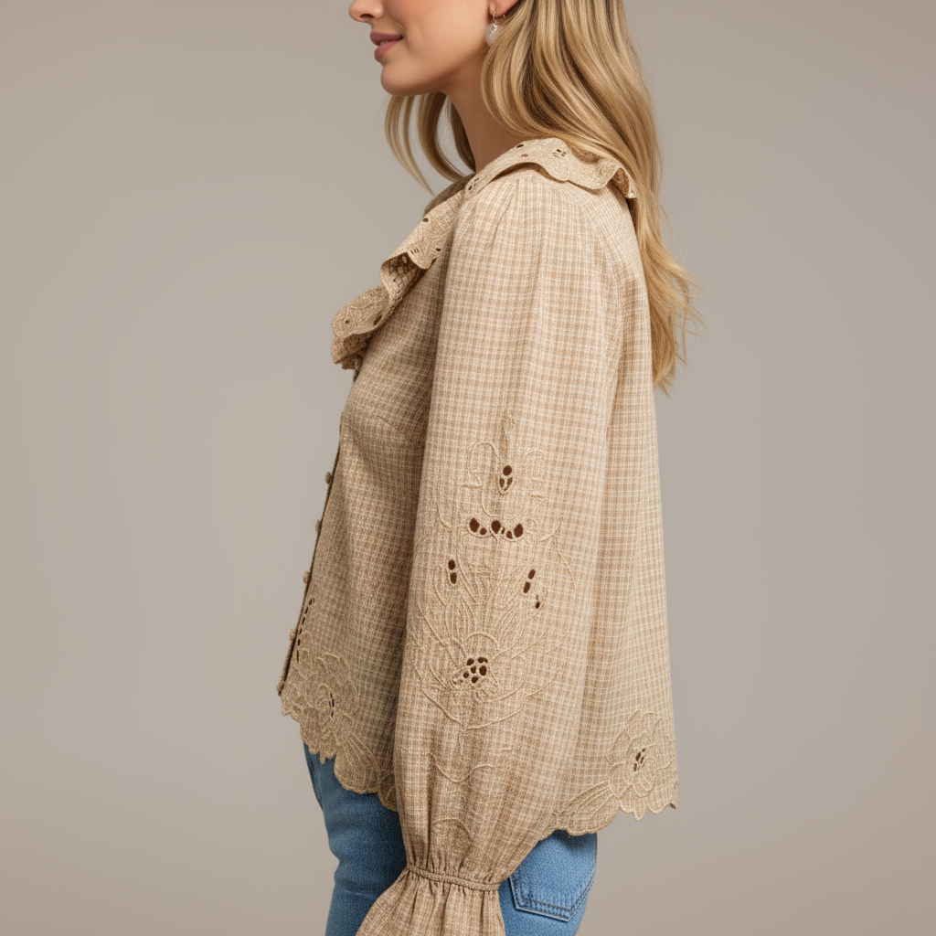 This embroidered blouse brings a touch of vintage charm to your wardrobe. Crafted from lightweight woven fabric with a subtle check pattern, it features a ruffle collar, scalloped hem, and delicate cutout embroidery for a feminine finish. Long puff sleeves with shirred cuffs add a romantic silhouette, while the button-front closure makes it effortlessly wearable for both casual and refined looks.