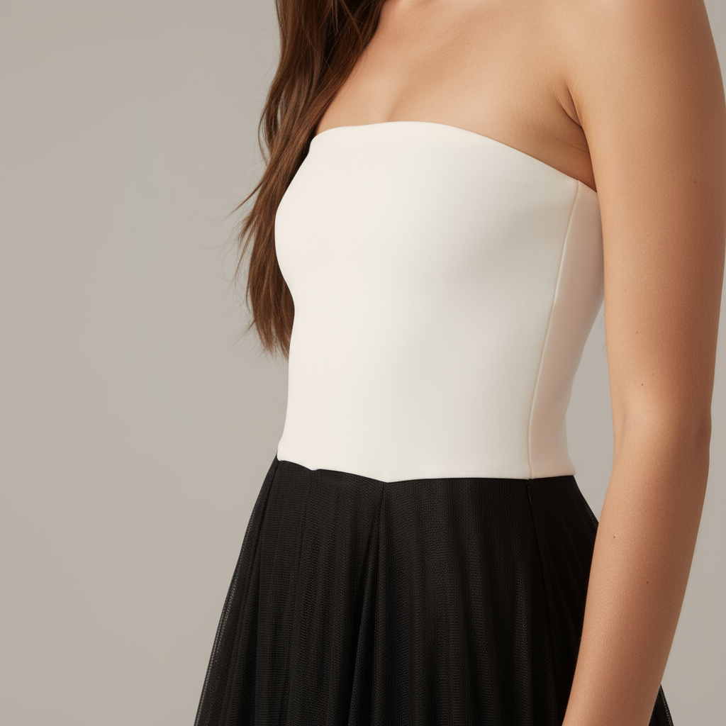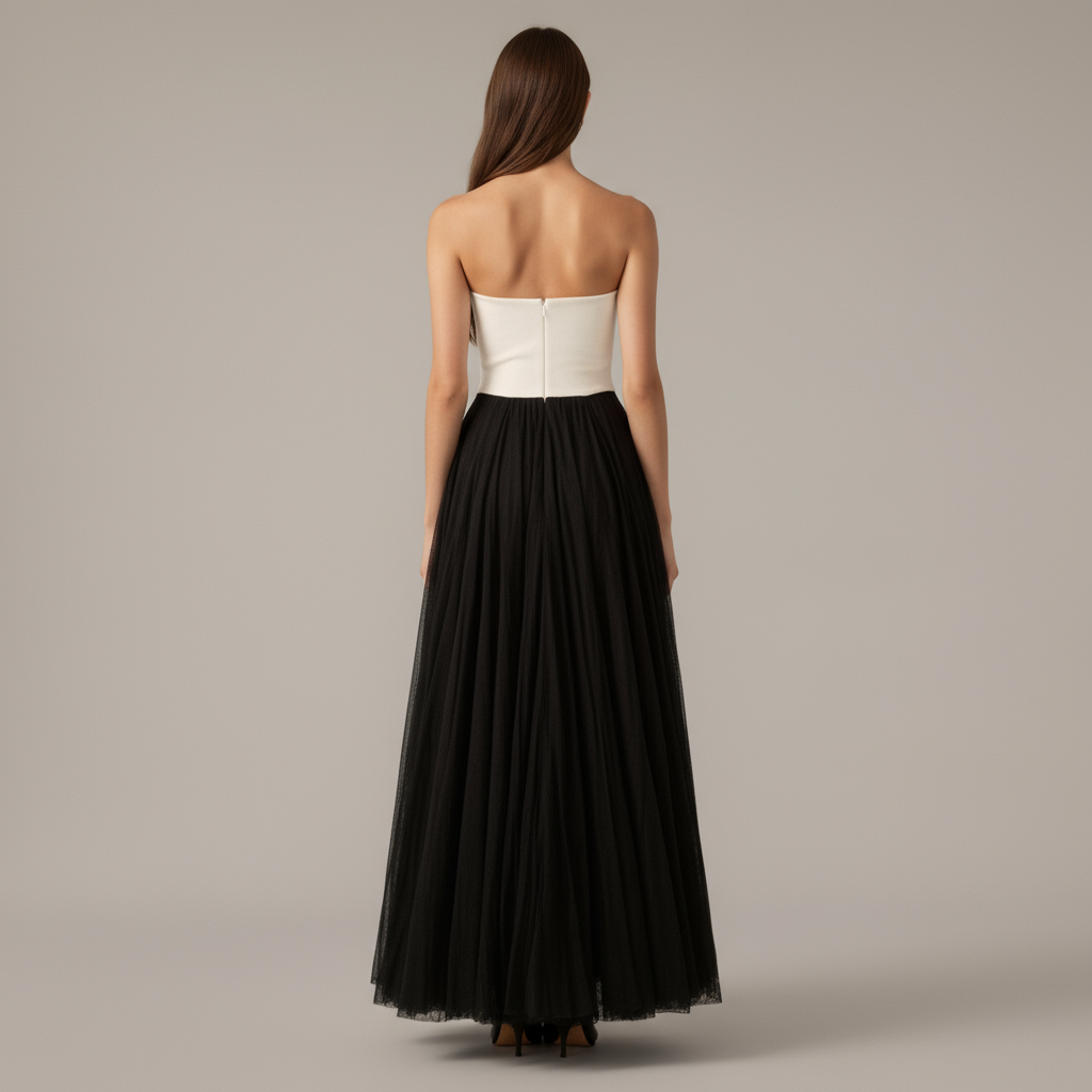 This elegant strapless gown features a sleek, fitted bodice in a contrasting tone that creates a striking silhouette. The floor-length skirt cascades in layers of soft, sheer tulle, adding graceful movement and drama with every step. Perfect for formal events or black-tie occasions, this gown offers a timeless yet modern appeal. Designed in a full-length maxi style that reaches the floor for an ultra-sophisticated look.