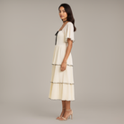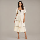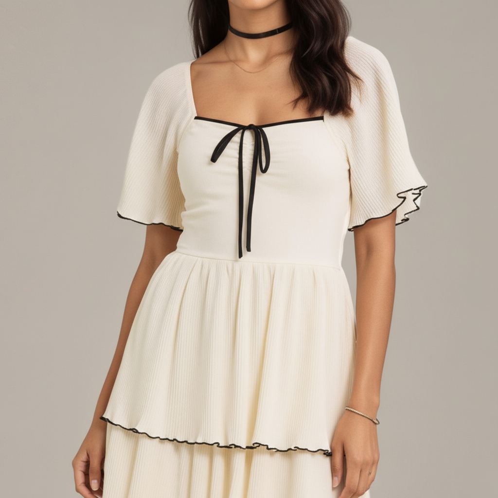 This elegant midi dress features a tiered pleated skirt that moves beautifully with every step, while flutter sleeves add a touch of romance. A square neckline with a dainty tie detail is framed by contrast trim that defines the silhouette with modern charm. The soft pleating creates graceful flow and dimension, making this dress ideal for both casual gatherings and elevated occasions. A refined blend of feminine ease and contemporary style.
