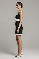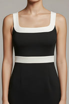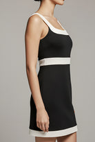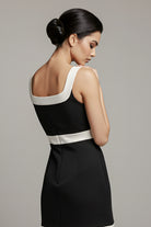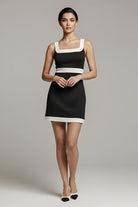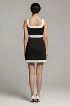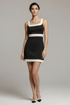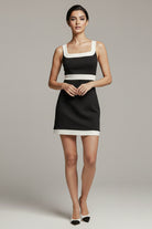 A modern take on classic sophistication, this sleeveless mini dress features bold contrast trim along the square neckline, waist, and hem. The fitted silhouette flatters the figure, while the minimal design keeps it sleek and versatile. Perfect for work, dinners, or polished weekend looks, this piece adds timeless appeal to any wardrobe.