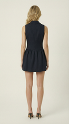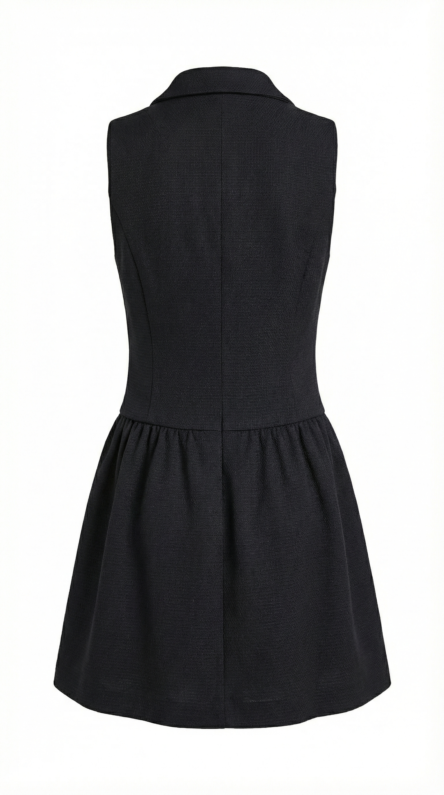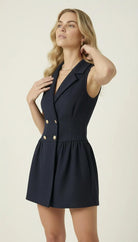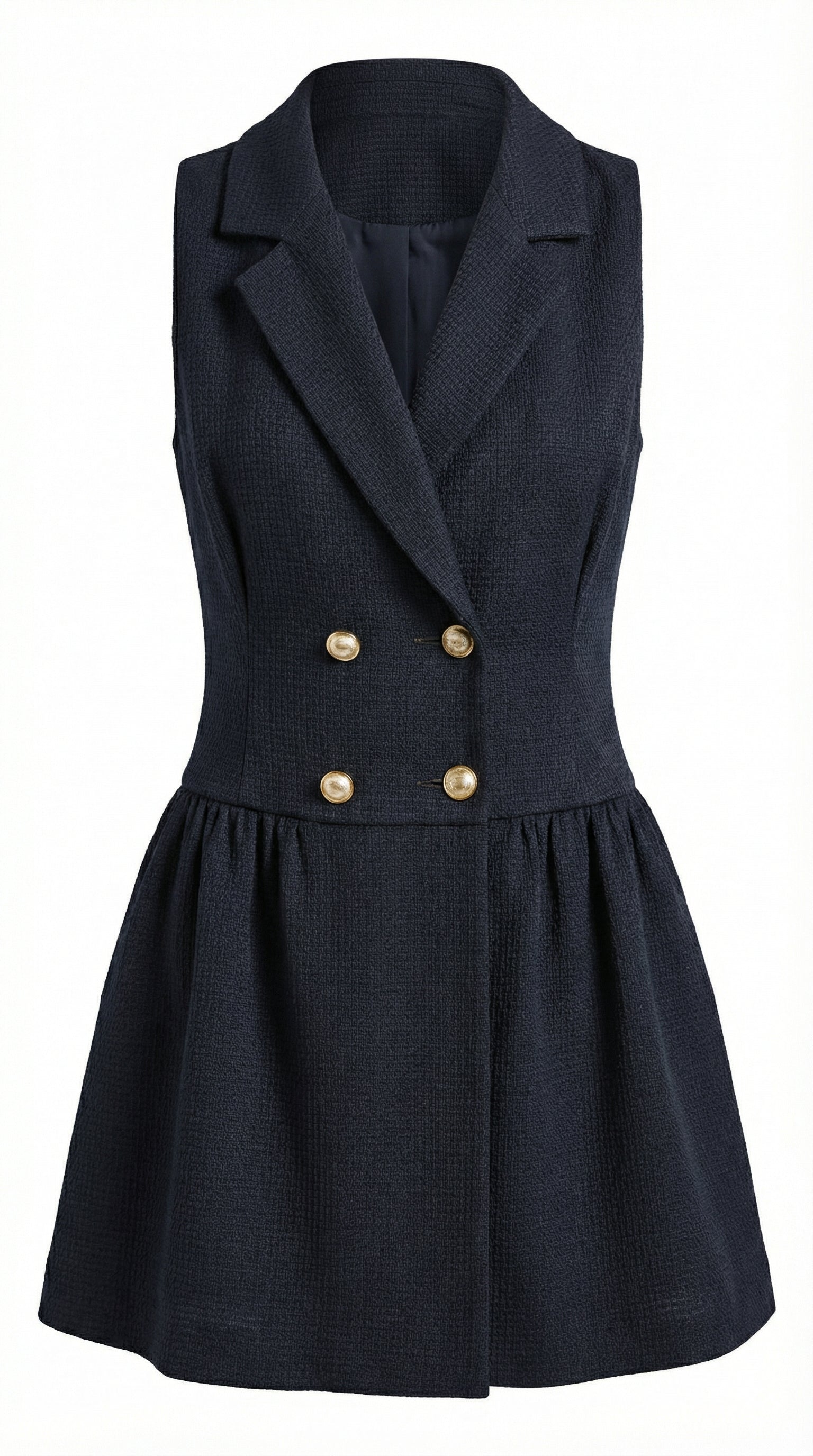 This sleeveless blazer dress combines tailored sophistication with feminine charm. Featuring a double-breasted design with gold-tone buttons and notched lapels, it offers a polished and modern look. The fitted bodice transitions into a flared hem, adding movement and a playful touch to this structured silhouette. Perfect for both work and evening events, this dress pairs beautifully with heels and statement accessories for a chic, confident outfit.